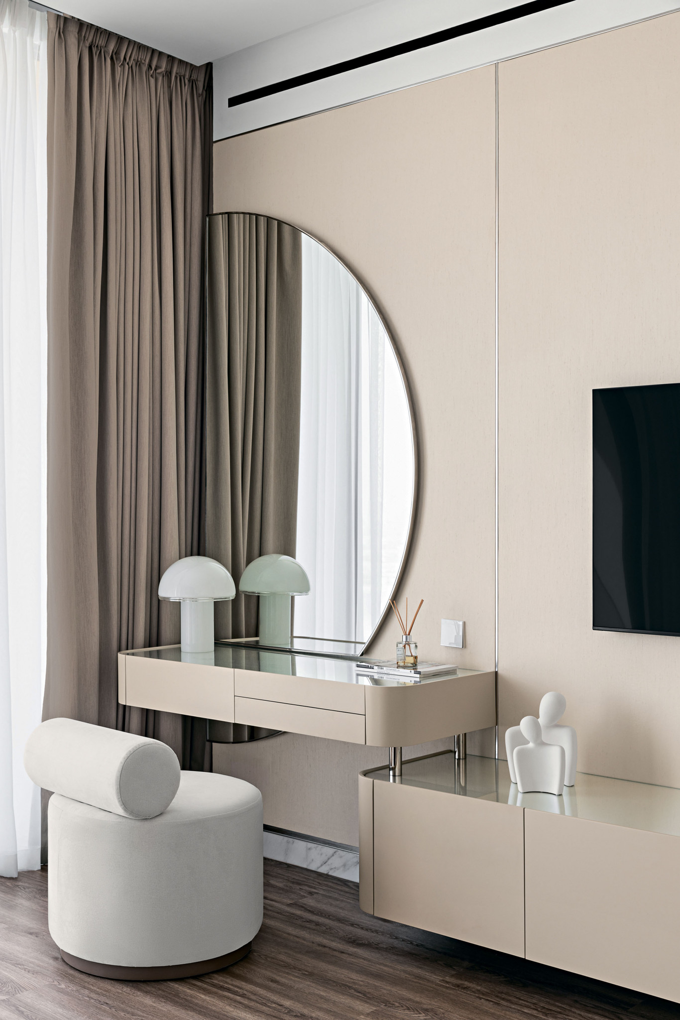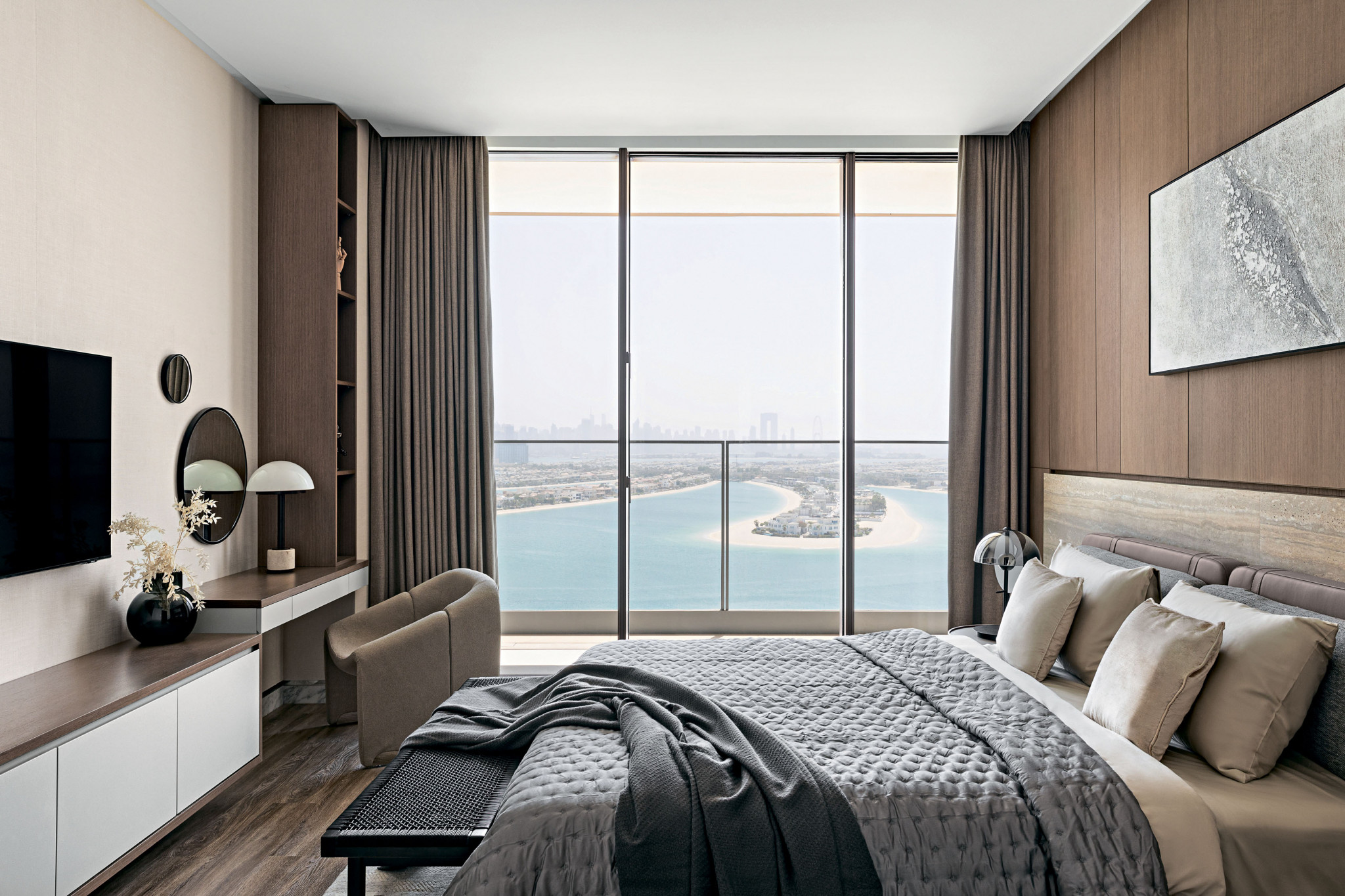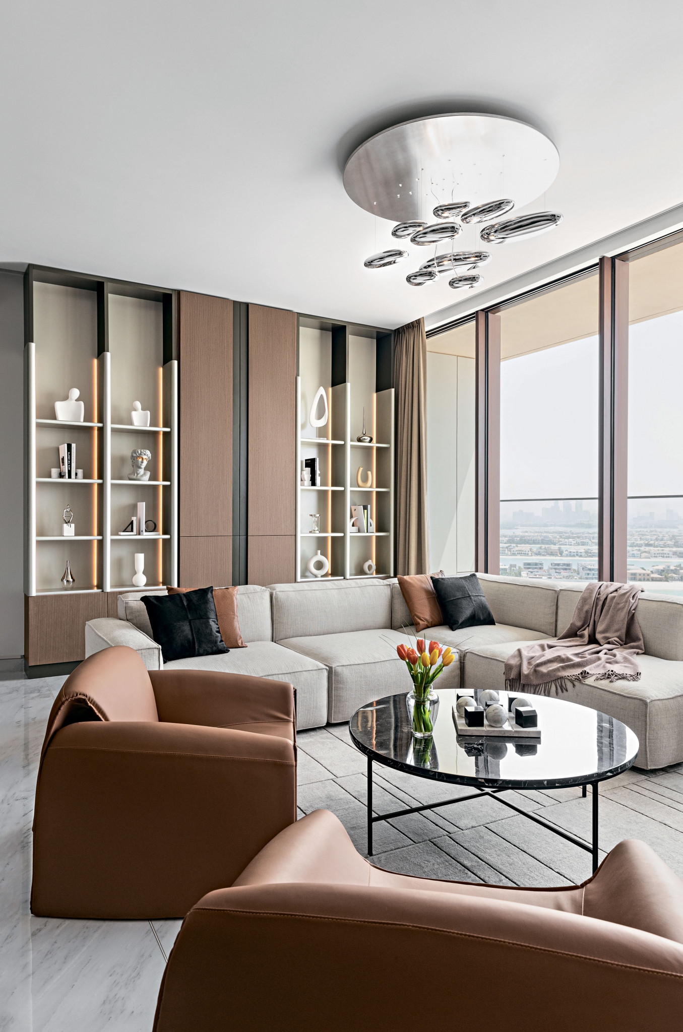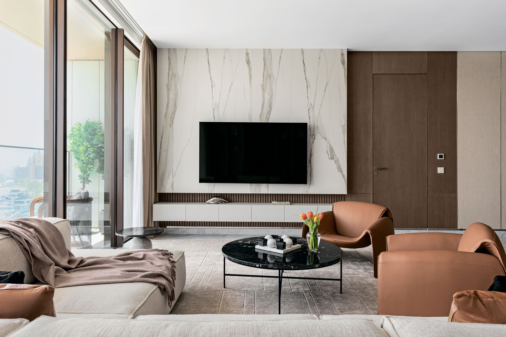 На этой базе Анастасия и Екатерина выстроили премиальный, но лаконичный интерьер в стиле комплекса Atlantis The Royal. Отделку стен дополнили натуральный шпон и обои из шелка и льна. Четкие графичные линии пространства смягчили фактурным текстилем и разнообразили предметами современного искусства — абстрактной живописью и предметами декора от локальных дубайских мастеров. Статусный и премиальный характер интерьера подчеркнули выразительными предметами мебели и светильниками. В центральной зоне кухни-гостиной появились кресла POLIFORM с обивкой из натуральной кожи, а также стулья POLTRONA FRAU в охристой цветовой гамме. Потолок украсила футуристическая люстра ARTEMIDE, каплевидные очертания которой перекликаются со знаменитой скульптурой DROPLETS в лобби отеля Atlantis The Royal. В свою очередь металлический блеск светильника поддерживает фактуру нержавеющей стали в наличниках и плинтусах. Мягкие, органические формы предметов мебели гармонируют со сдержанной и естественной колористикой интерьера, которая напоминает об окружающей мегаполис пустыне. “В Дубае сейчас главенствует тренд на сдержанную и лаконичную цветовую гамму, которая выгодно контрастирует с холодными оттенками моря за окном. В нашем случае из гостиной открывается яркий, насыщенный красками панорамный вид, который мы выгодно подчеркнули с помощью, выстроенной на нюансах цветовой гаммы”, — говорят авторы проекта. Лейтмотивом и приватной, и общественной зоны стало натуральное дерево. Стены прихожей декорировали панелями из шпона, которые будто перетекают в оформление фасадов кухни. В спальнях к отделке стен обоями изо льна и шелка также добавляется натуральное дерево как в декоре стен, так и в созданных по индивидуальному проекту предметах мебели — гардеробных, стеллажах и туалетных столиках. Такое сочетание природной гаммы, материалов и актуального дизайна превращает исходное пространство в остромодный, но уютный и выразительный интерьер.