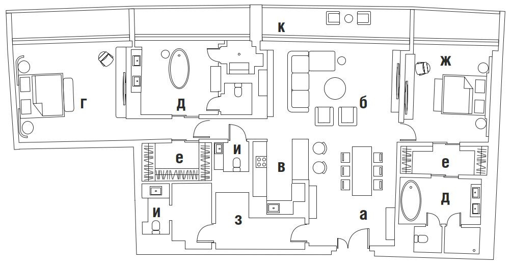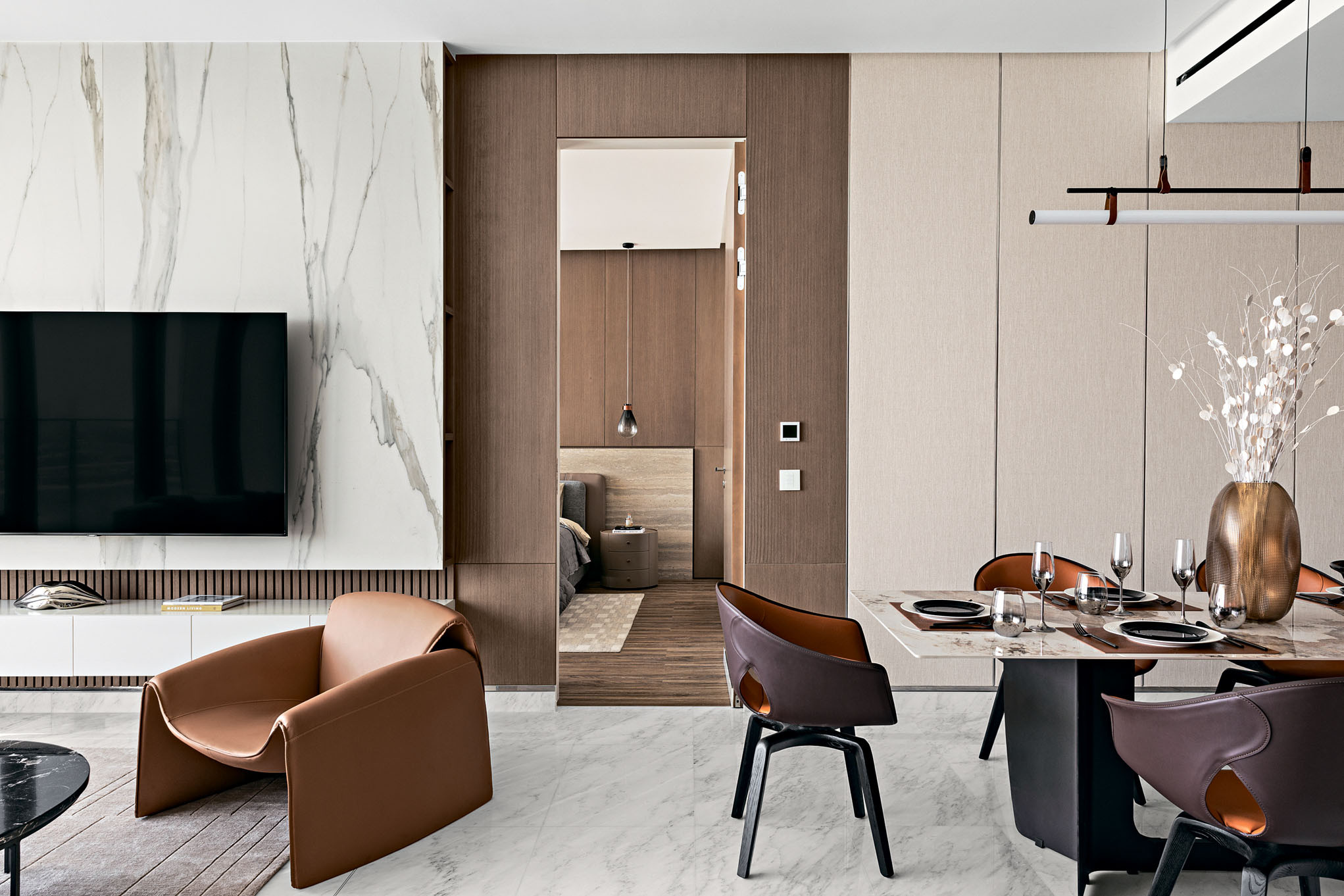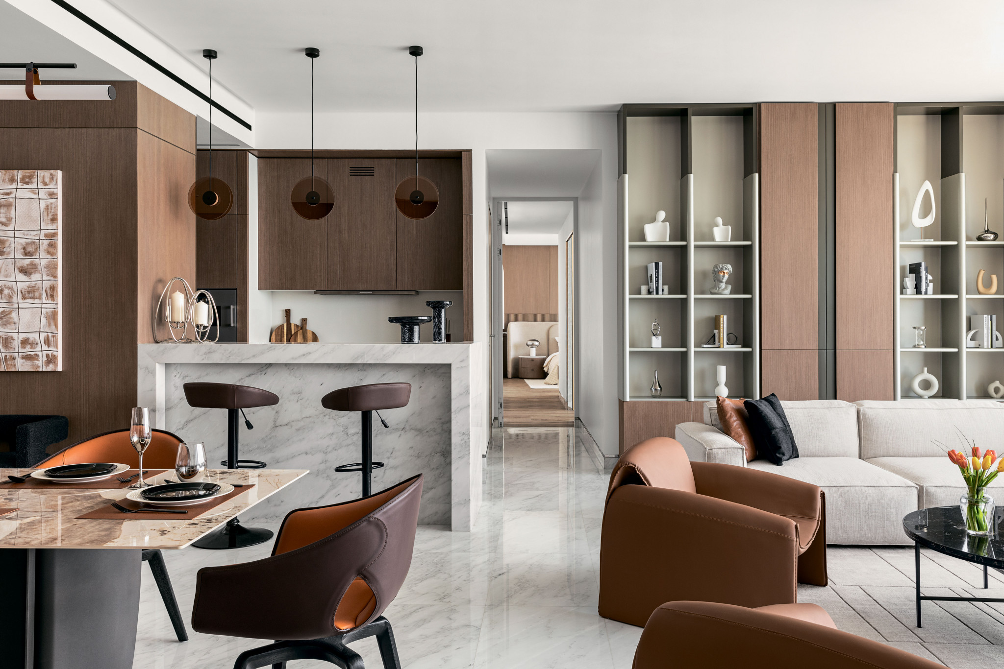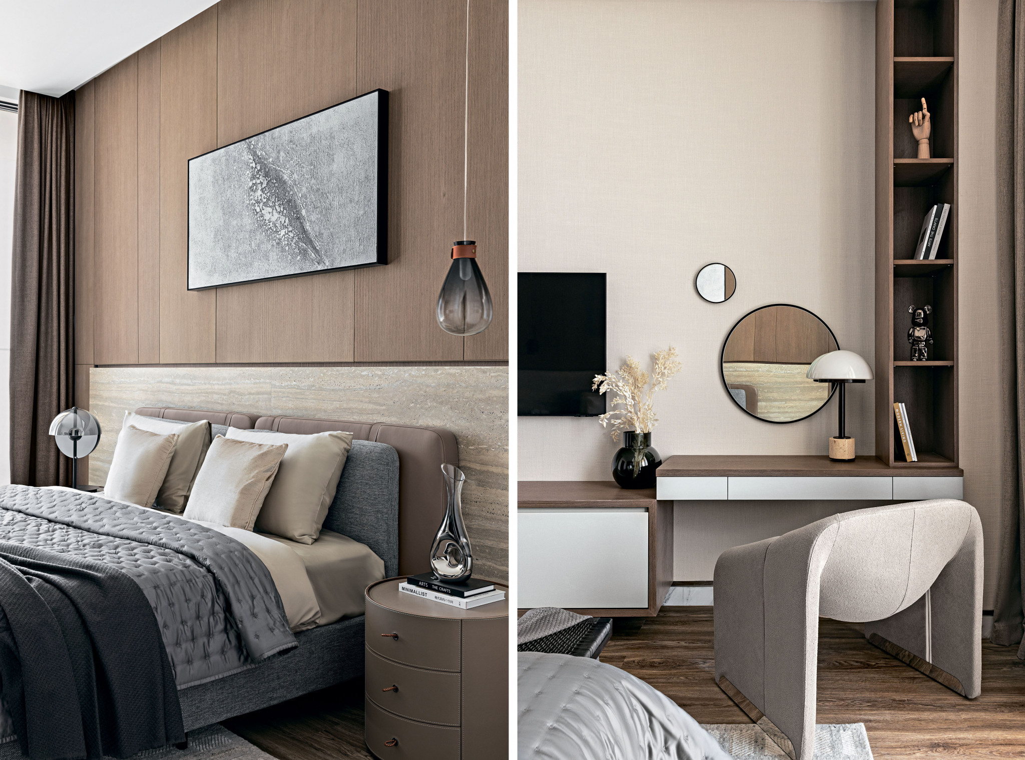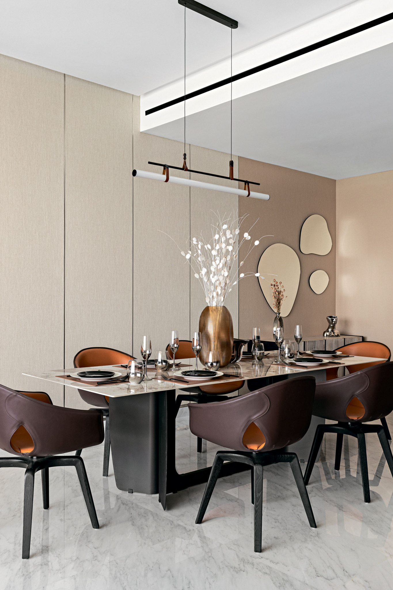 На этой базе Анастасия и Екатерина выстроили премиальный, но лаконичный интерьер в стиле комплекса Atlantis The Royal. Отделку стен дополнили натуральный шпон и обои из шелка и льна. Четкие графичные линии пространства смягчили фактурным текстилем и разнообразили предметами современного искусства — абстрактной живописью и предметами декора от локальных дубайских мастеров. Статусный и премиальный характер интерьера подчеркнули выразительными предметами мебели и светильниками. В центральной зоне кухни-гостиной появились кресла POLIFORM с обивкой из натуральной кожи, а также стулья POLTRONA FRAU в охристой цветовой гамме. Потолок украсила футуристическая люстра ARTEMIDE, каплевидные очертания которой перекликаются со знаменитой скульптурой DROPLETS в лобби отеля Atlantis The Royal. В свою очередь металлический блеск светильника поддерживает фактуру нержавеющей стали в наличниках и плинтусах. Мягкие, органические формы предметов мебели гармонируют со сдержанной и естественной колористикой интерьера, которая напоминает об окружающей мегаполис пустыне. “В Дубае сейчас главенствует тренд на сдержанную и лаконичную цветовую гамму, которая выгодно контрастирует с холодными оттенками моря за окном. В нашем случае из гостиной открывается яркий, насыщенный красками панорамный вид, который мы выгодно подчеркнули с помощью, выстроенной на нюансах цветовой гаммы”, — говорят авторы проекта. Лейтмотивом и приватной, и общественной зоны стало натуральное дерево. Стены прихожей декорировали панелями из шпона, которые будто перетекают в оформление фасадов кухни. В спальнях к отделке стен обоями изо льна и шелка также добавляется натуральное дерево как в декоре стен, так и в созданных по индивидуальному проекту предметах мебели — гардеробных, стеллажах и туалетных столиках. Такое сочетание природной гаммы, материалов и актуального дизайна превращает исходное пространство в остромодный, но уютный и выразительный интерьер.