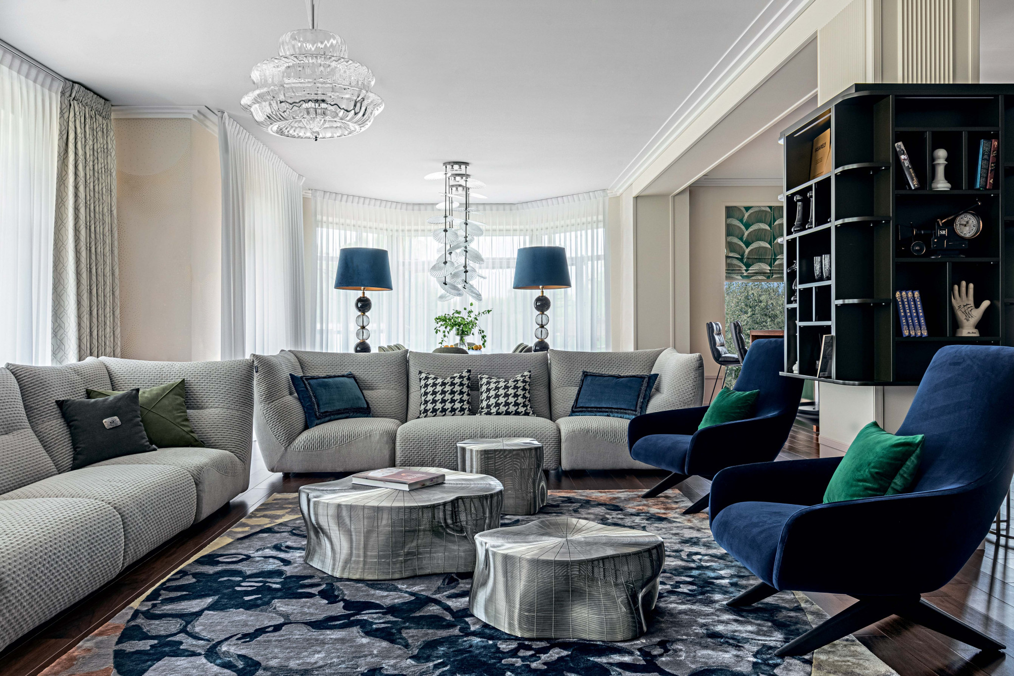 Ощущение свободы, безграничного парения помимо открытых пространств помогли создать глянцевые поверхности, а также обилие стекла и многочисленные зеркала на фоне окон — поворотные и откатные. «Здесь будут жить такие красивые люди, — сказали себе дизайнеры. — Пусть отражений будет больше!» За светильниками из стекла, которые подвесили над столом в гостиной, специально ездили на фабрику в Ригу — работали с художниками, чтобы результат соответствовал их задумке. Мебель также, за редким исключением, создавалась по эскизам Виктории Николаевой и Лады Засимовой. Их гордость — стол в гостиной: интересное решение они придумали для ножек — столешница словно парит на невидимых опорах. Материалы подбирались исключительно натуральные: