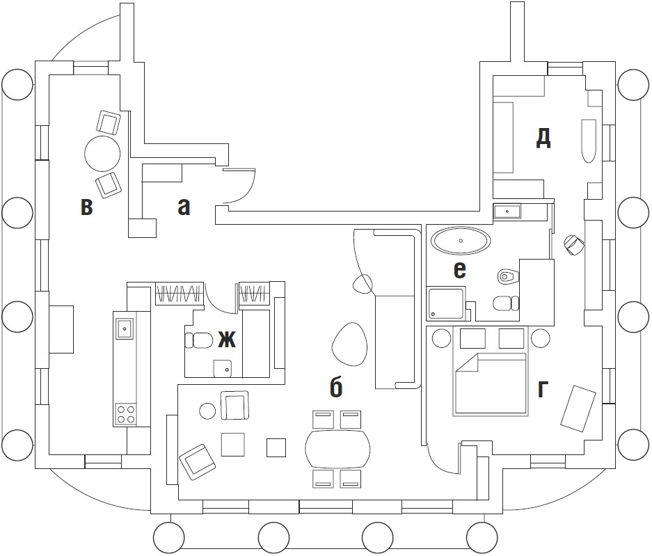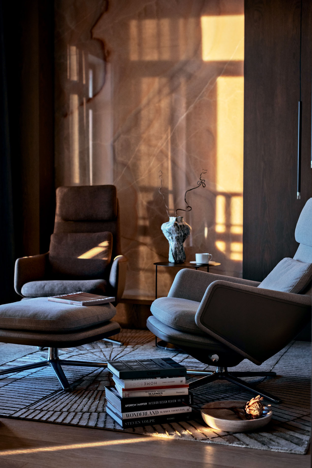 Е. Б.: Зонирование гостиной определило расположение несущих конструкций. Пространство состоит из трех частей: места для отдыха и релакса с диваном Mascheroni, столовой и зоной тет-а-тет с креслами Vitra от дизайнера Антонио Читтерио. Стены и потолок этой камерной зоны мы обшили деревянным панелями. Такой прием помог скрыть решетки для вентиляции, кондиционирования и увлажнения воздуха, которые занимают немало места. Лишь на одной из стен мы разместили панно из оникса бежевого цвета с подсветкой. Для вытянутого и узкого помещения кухни мы выбрали модель Air Logica от Valcucine. Философия Габриэля Чентацо, автора этой кухни для мегаполиса, нам очень близка.