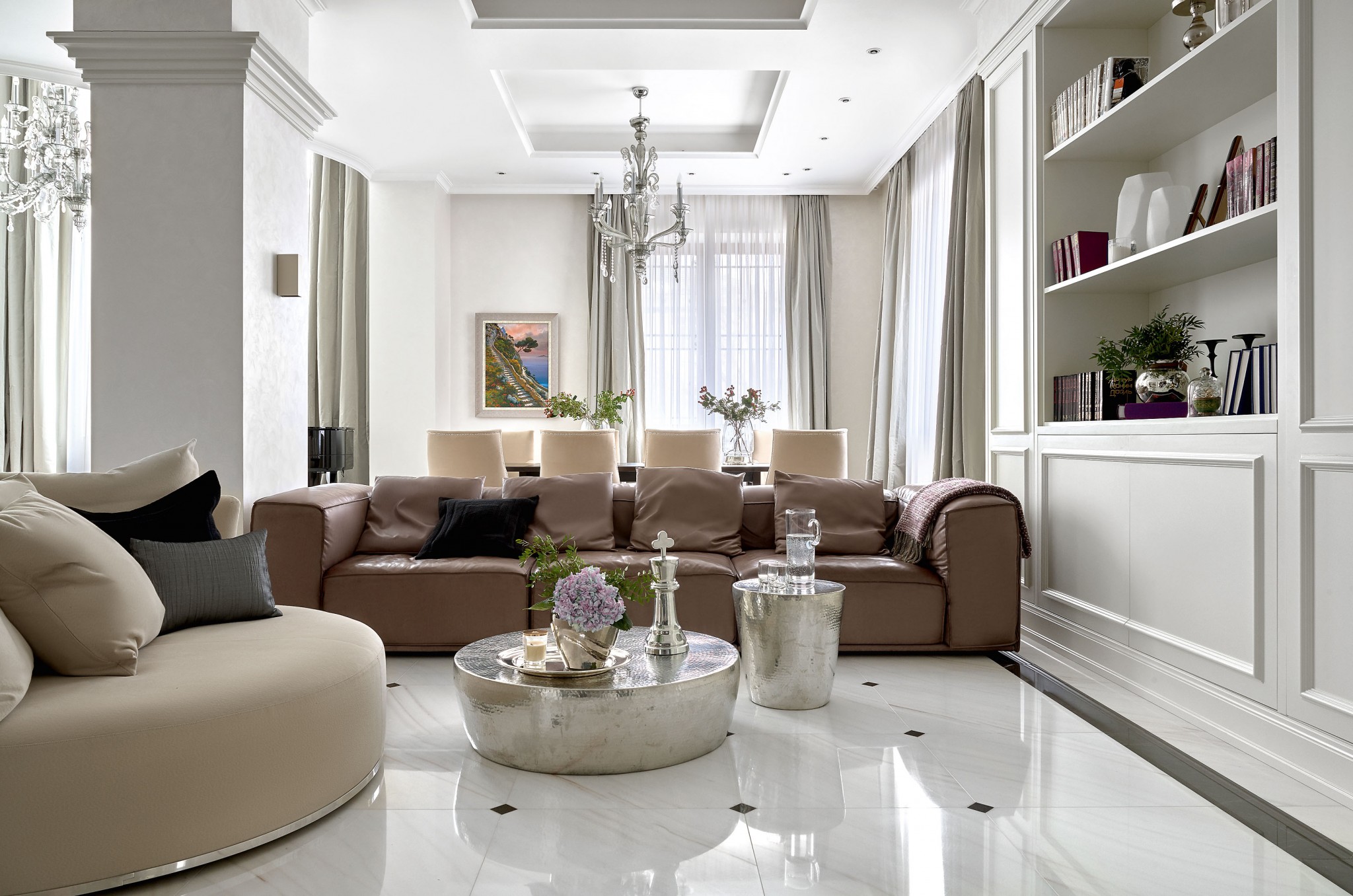 Буазери для гостиной изготовлены неаполитанской фабрикой Xenia, которая славится мебелью ручной работы. Диван, Henge. Люстра, Barovier&Toso