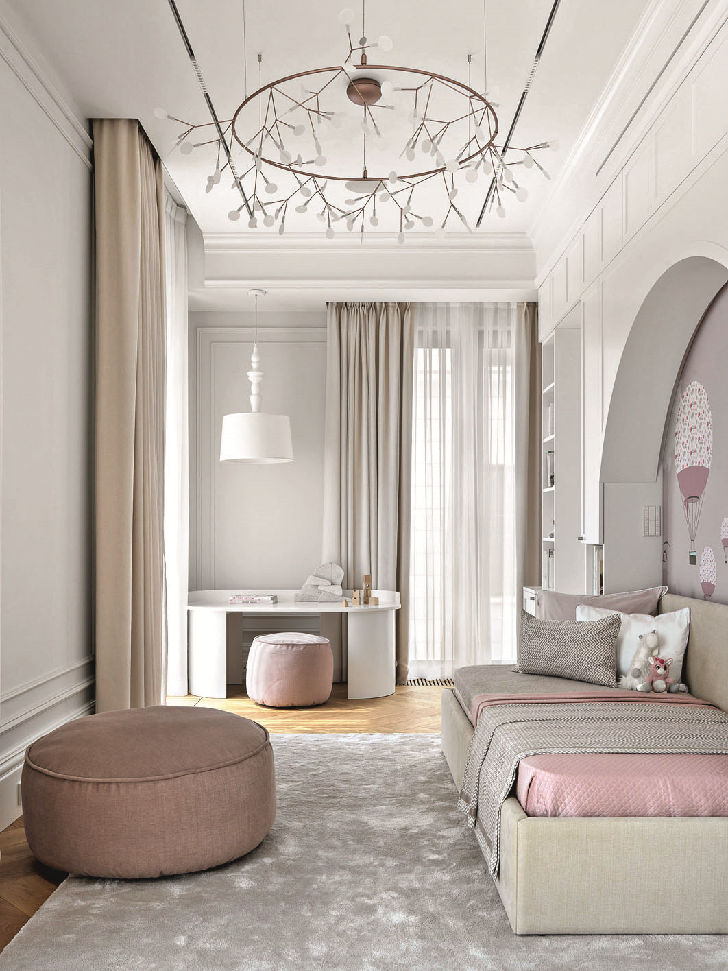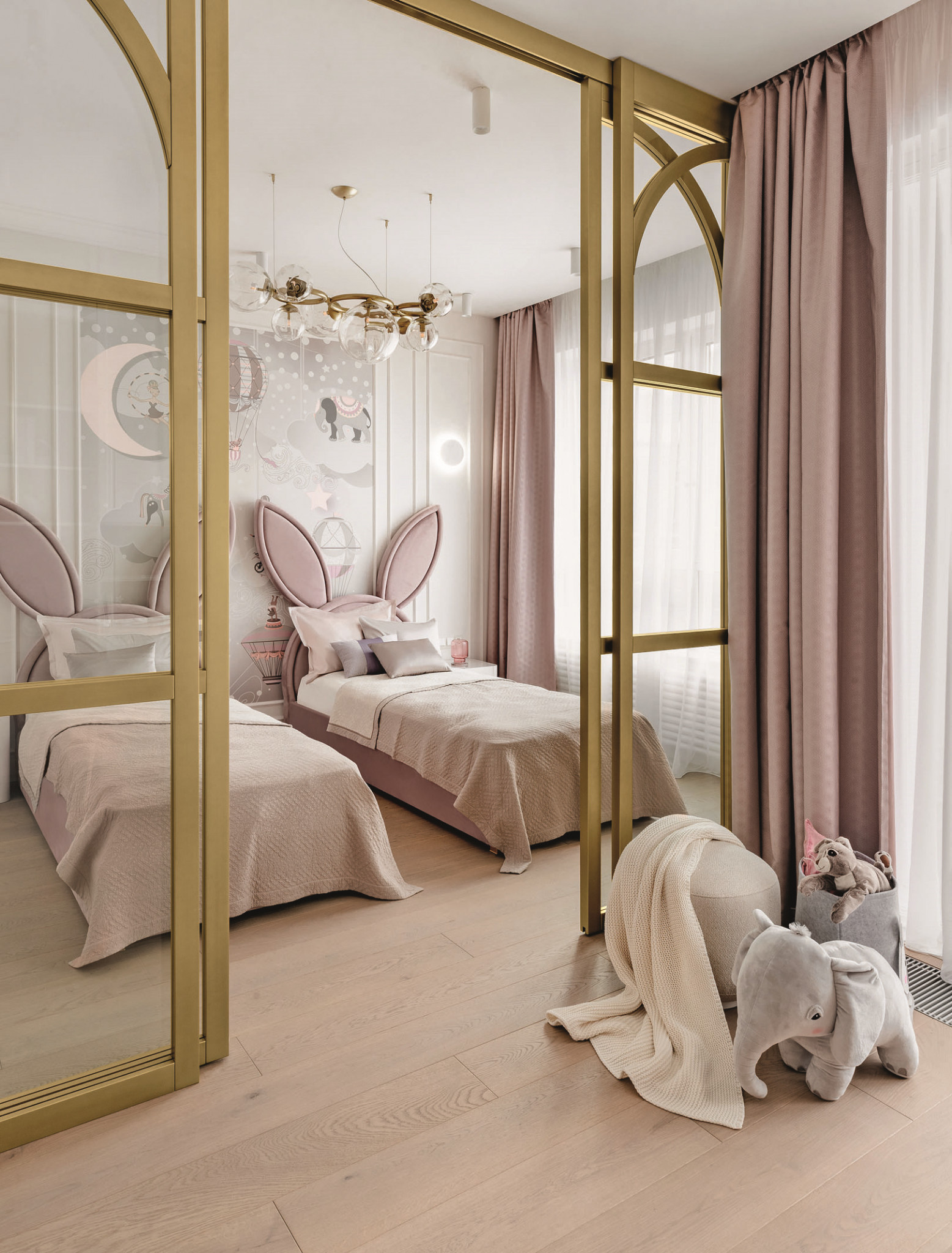 Детская комната для девочек решена в светлых и нежных оттенках в отличие от остального интерьера. Объединяющим мотивом стало использование латунных элементов — это и перегородка из закаленного стекла, разделяющая зоны, и люстра, и мебельная фурнитура. Почти вся мебель в детской изготовлена на заказ по авторским эскизам.