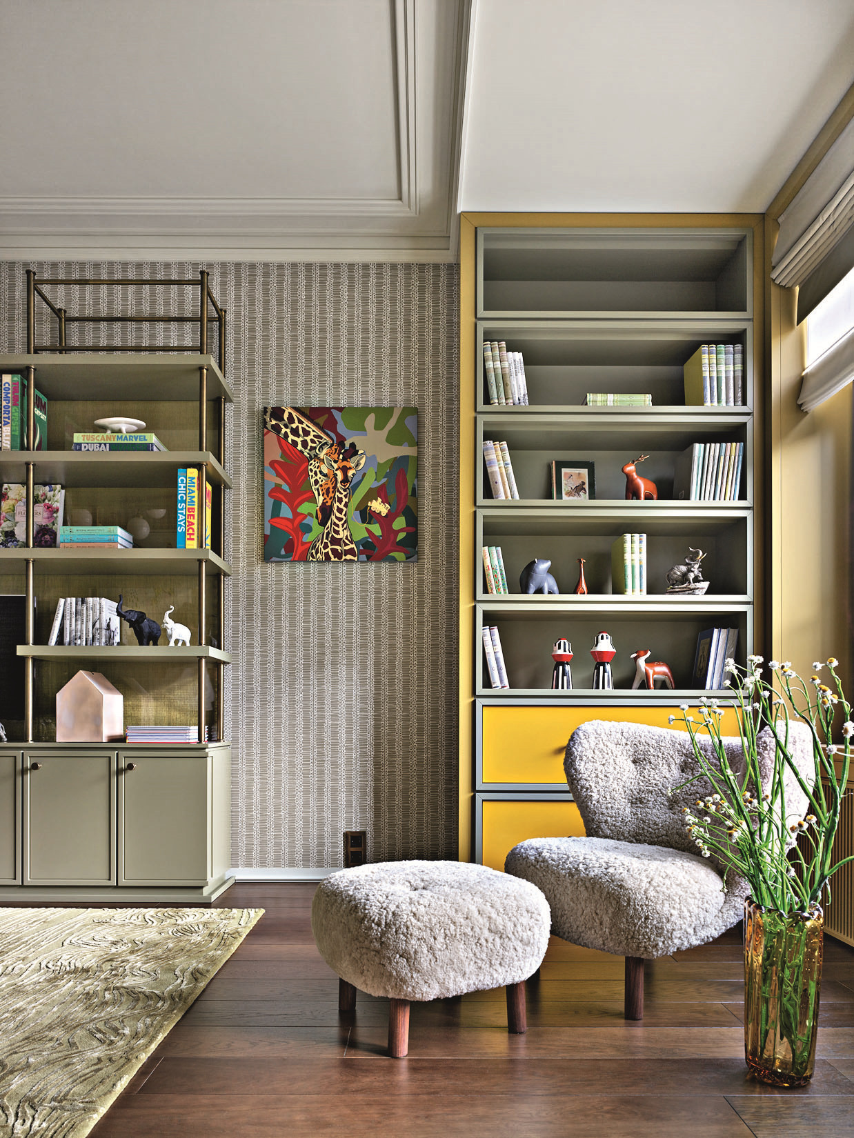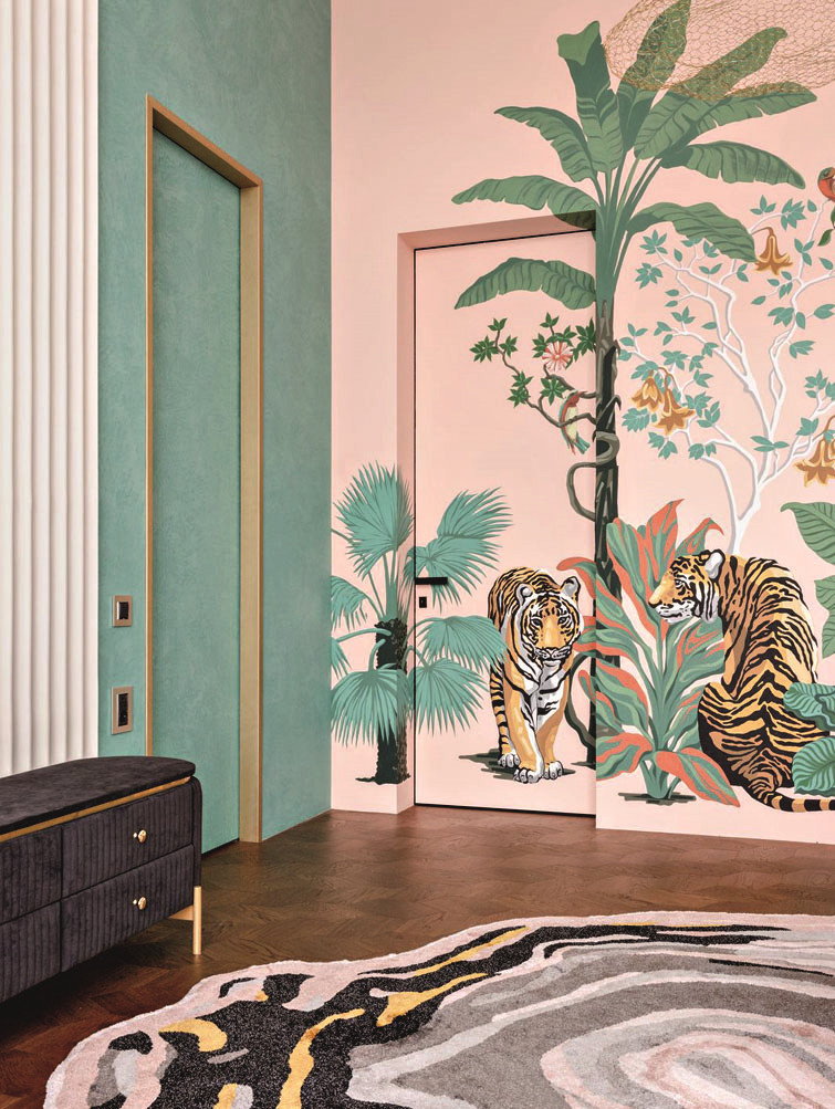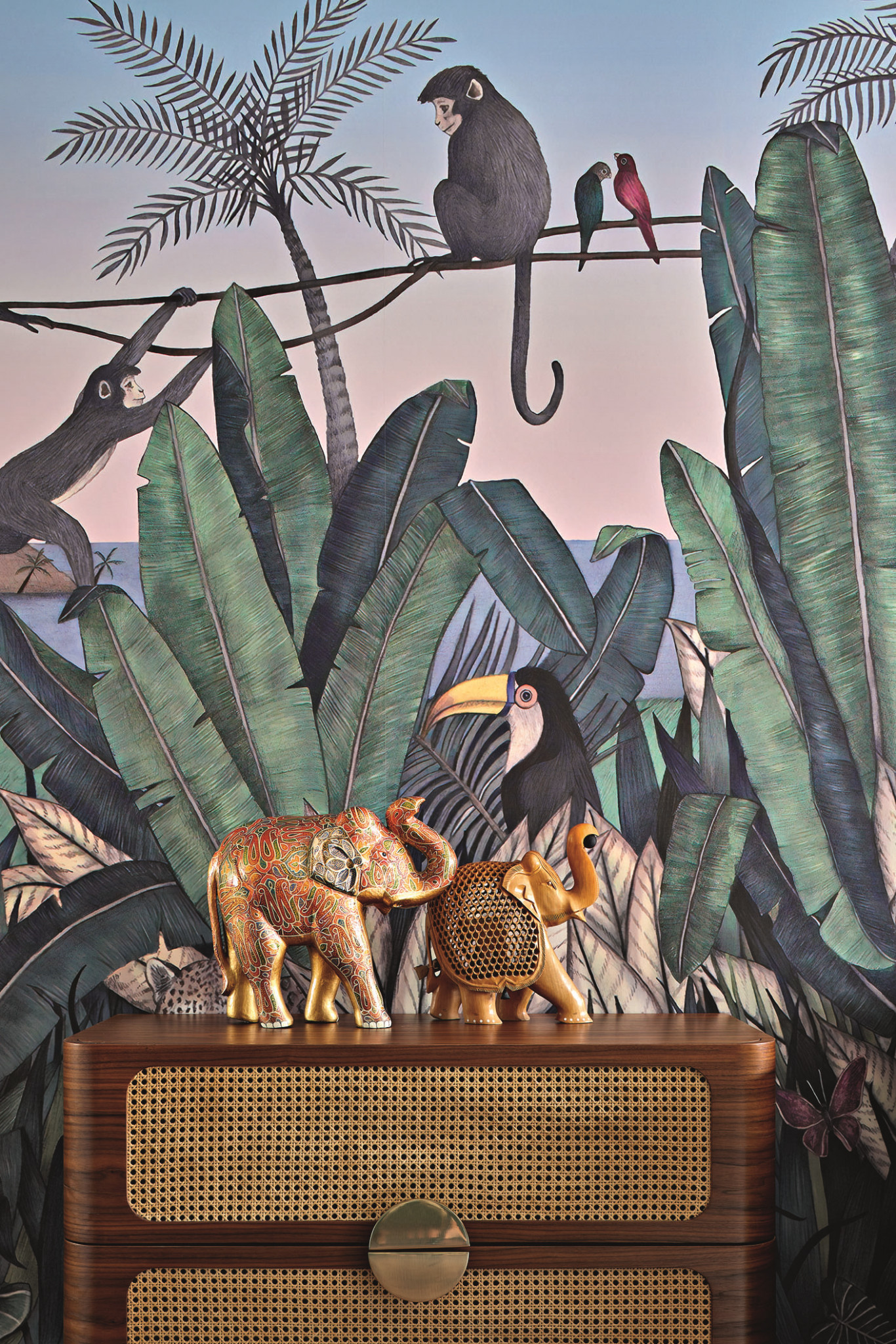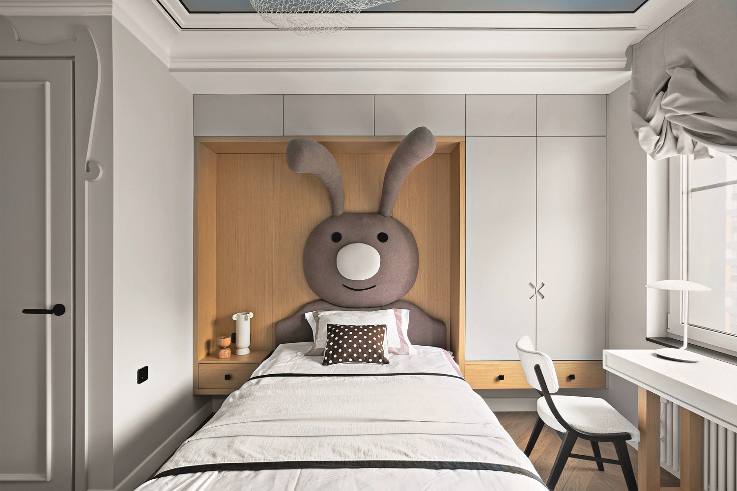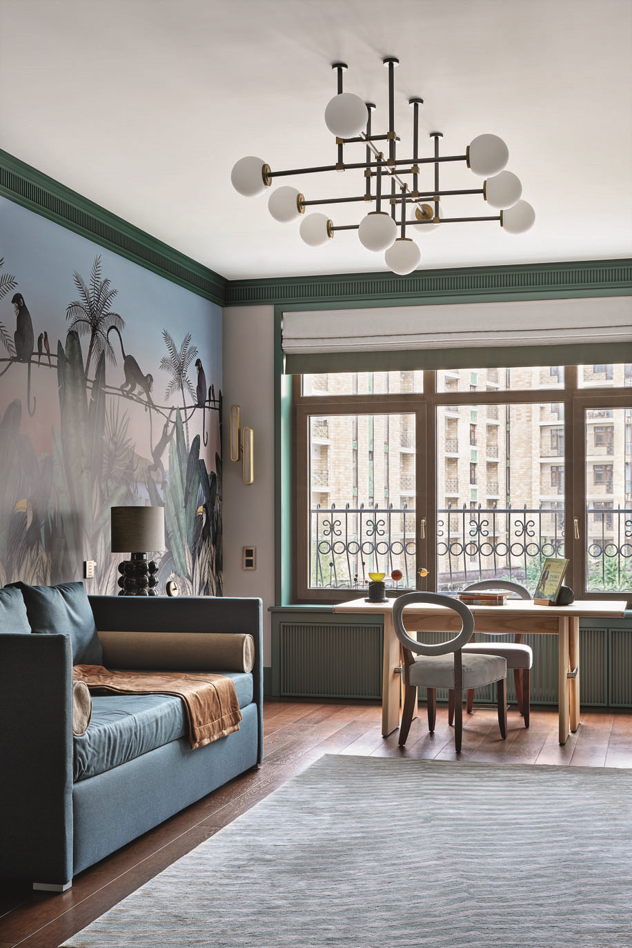 Проект создавался в тесном сотрудничестве с заказчиками — семейной парой с двумя детьми. Детский блок включает в себя две спальни, игровую и санузел. Интерьер этих комнат соответствует общей стилистике квартиры, весьма утонченной, но в нем в большей степени проявляется игривый и легкий характер за счет более ярких цветов и оригинальных обоев с изображением тропического леса и экзотических животных. Продолжает этот анималистический мотив коллекция декоративных слонов — гордость хозяина квартиры.
