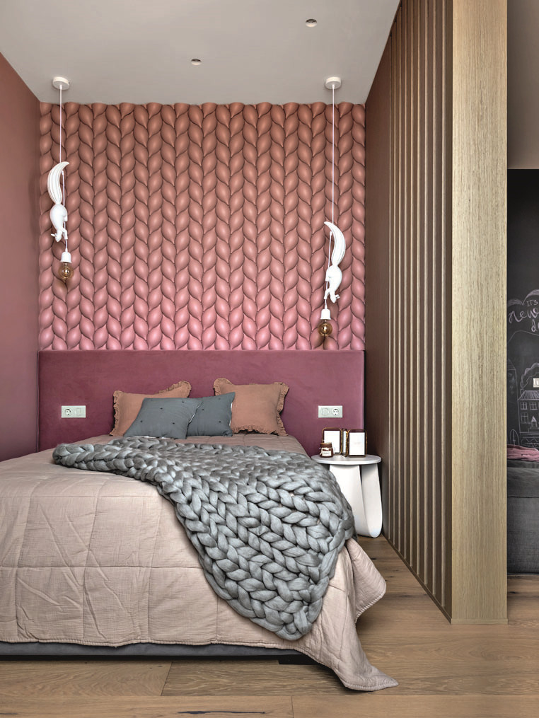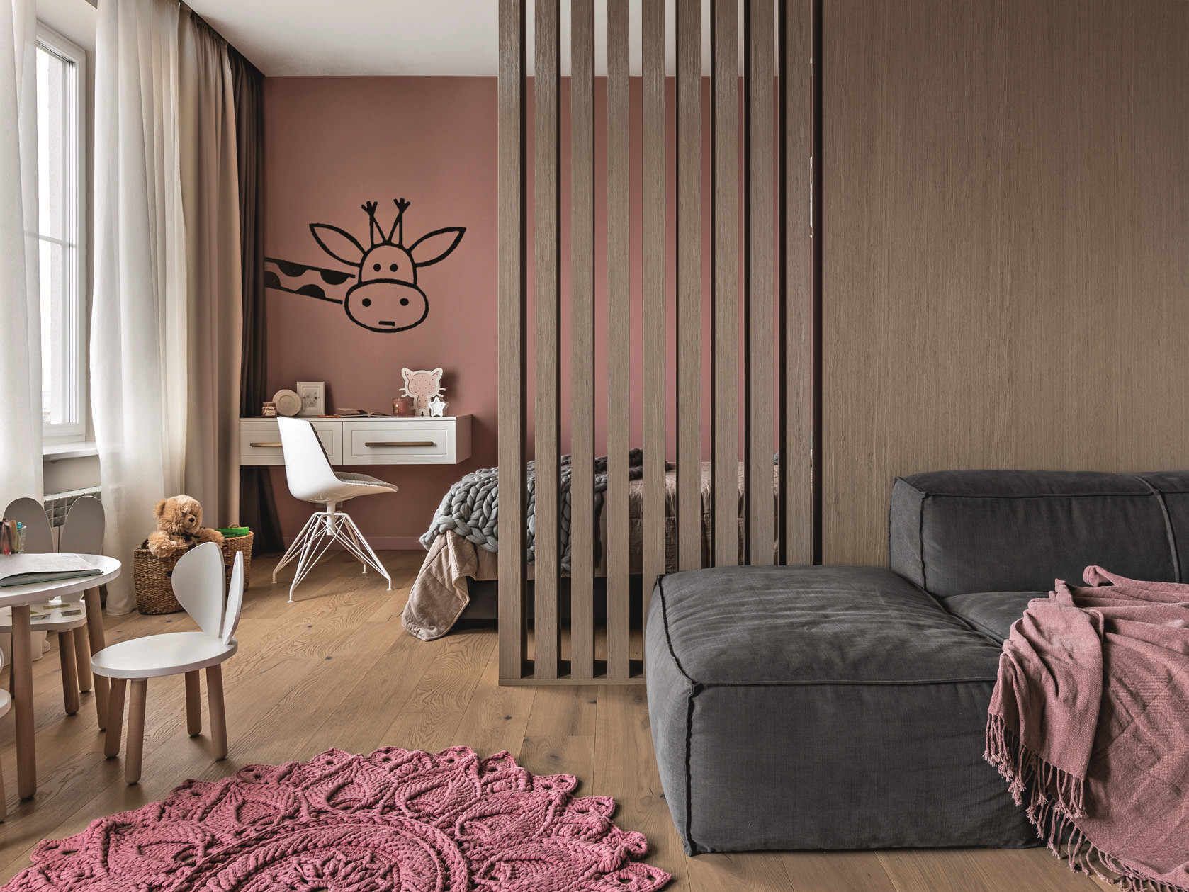Детскую комнату для девочки решено было разделить на две части. С помощью перегородки зонировать спальню с небольшим туалетным столиком, а во второй половине сделать место для отдыха, занятий и игр. Такая планировка предполагала дальнейшее пополнение в семье, которое не заставило себя долго ждать. И скоро пространство можно будет адаптировать для двоих детей с минимальными усилиями. В интерьере комнаты активно использованы различные фактуры и более сдержанные вариации розового цвета, но общая для всего проекта тема с природными мотивами сохранилась и здесь.