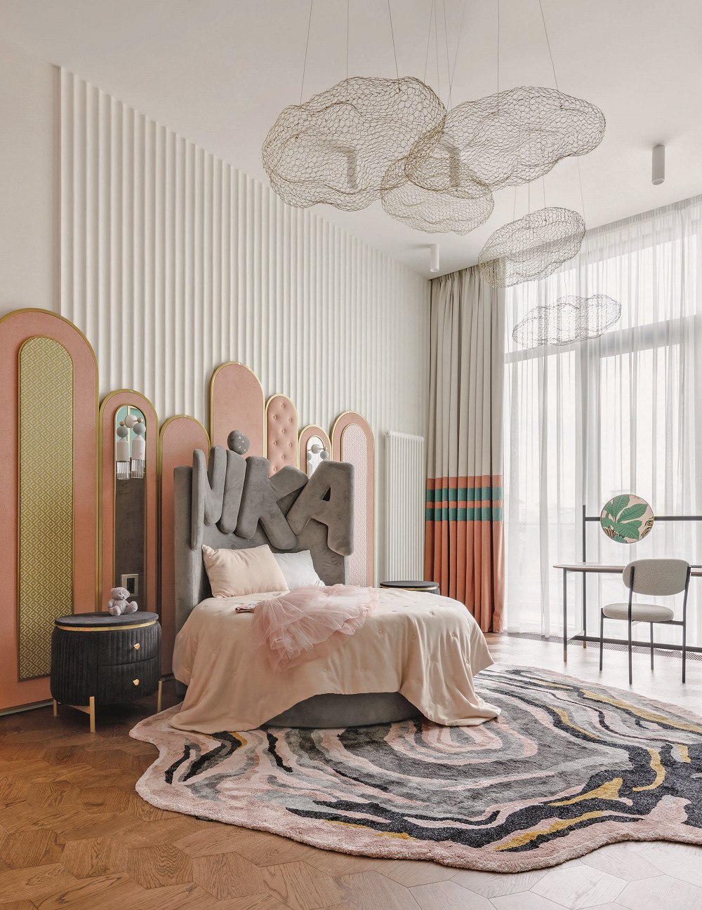 «Эту комнату для маленькой принцессы мы назвали Pink Jungles. Фантазийная атмосфера отчасти напоминает сказочный лес с пушистыми облаками или обстановку из сказки «Алиса в Стране чудес», где каждый портал ширмы — дорога в воображаемый мир. И конечно же, в личном пространстве нашлось место для любимых животных — тигров — и именной надписи на кровати. Мы убеждены, что дети должны расти в креативной обстановке — это подталкивает их к творчеству и стимулирует воображение!»