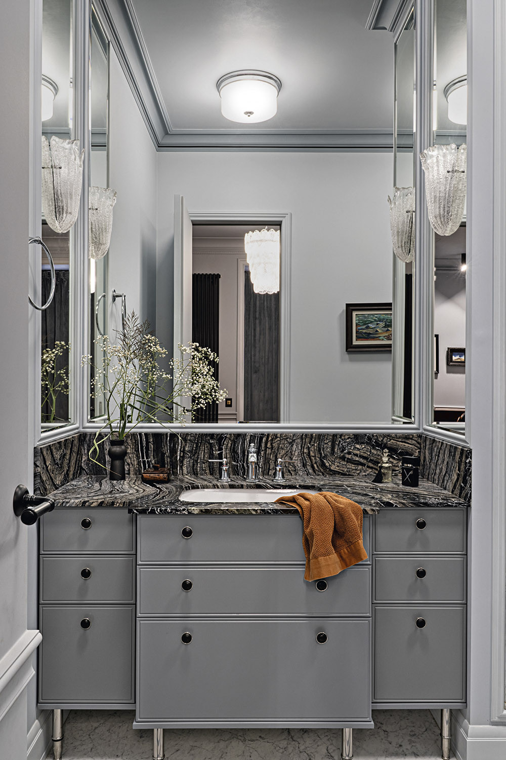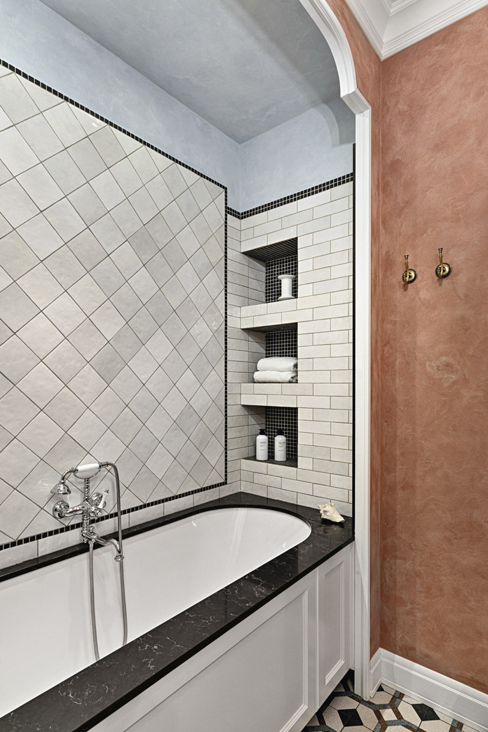 Хозяйка квартиры всегда хотела иметь персональную ванную: свою мечту она реализовала в новой квартире, разместив рядом со спальней отдельную душевую комнату. Мрамор для отделки — Bianco Carrara и Black Wood. Стены душевой выполнены из керамики ручной работы с эффектом старения. Дополняют атмосферу картина с изображением лодок и бра с плафонами из стекла. Стены и потолок окрашены краской из коллекции Little Greene