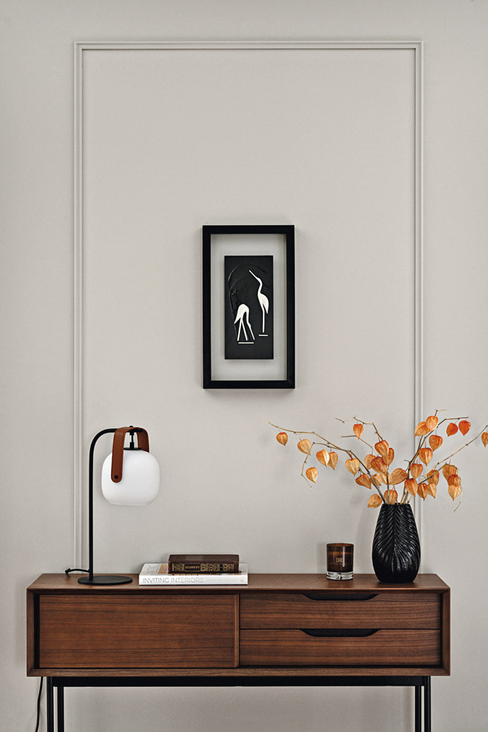 Изюминка гостиной — панно «Журавли» 70-х годов прошлого столетия. Дизайнер случайно увидела его на блошином рынке и сразу влюбилась. В некоторых культурах журавль символизирует долголетие и процветание. Чтобы слегка увеличить площадь панно и выделить его значимость, Альбина решила поместить его в арт-стекло с обеих сторон, тем самым отделив его от рамы. И журавли стали как будто парить в воздухе