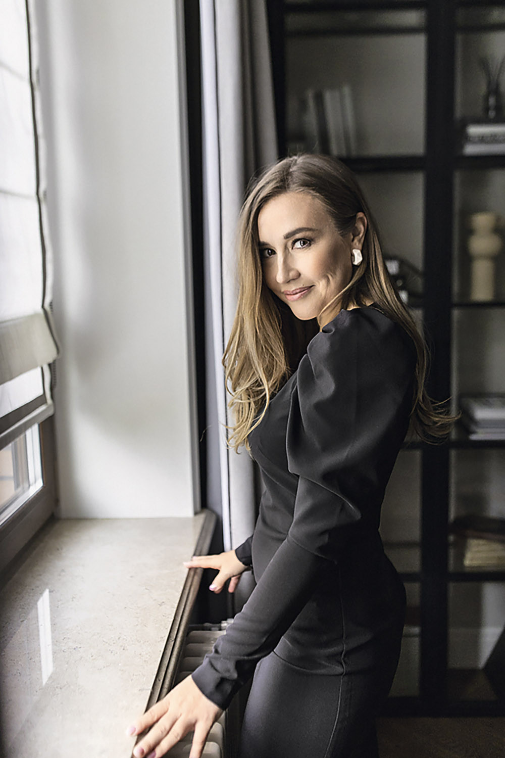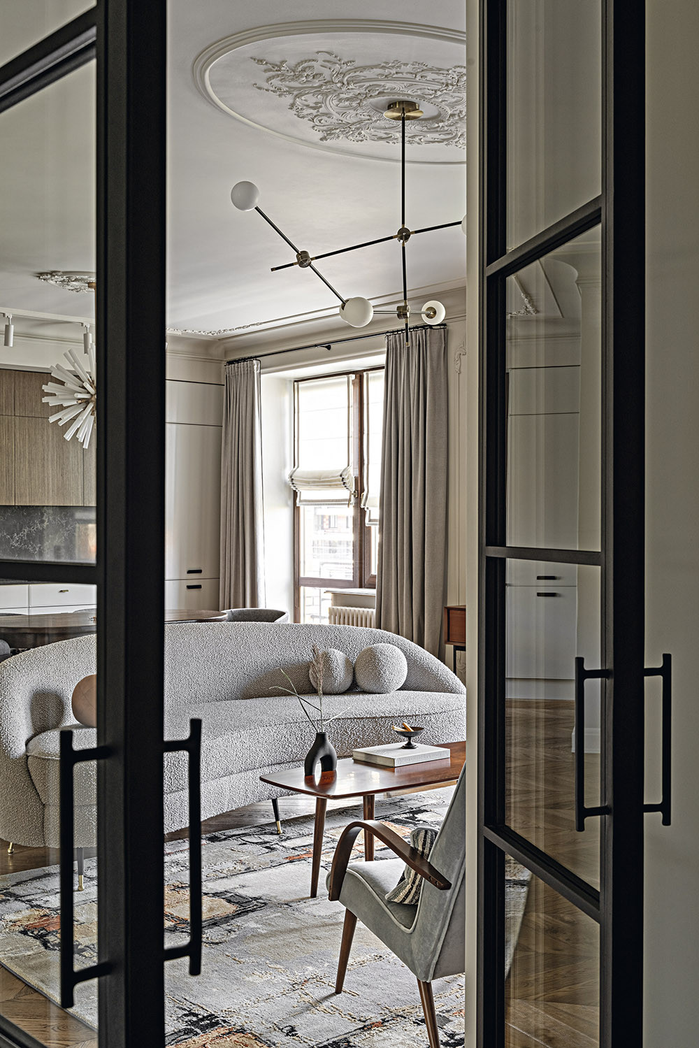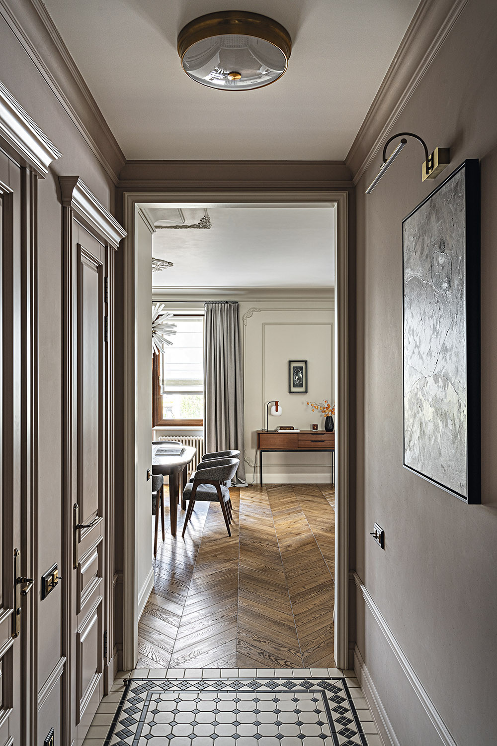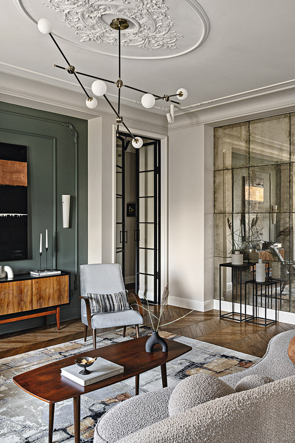 Альбина Мухаметшина: «Я тяготею к парижским интерьерам и, безусловно, хотела привнести что‑то от них и в этот проект. Высокие двери с багетом, гипсовая ажурная лепнина и паркет елочкой соседствуют с современными светильниками и простыми формами. Мне не очень близок минимализм, потому что для меня интерьер без плинтуса и карниза — как женщина без аксессуаров. Но зато я очень люблю цвет и умею с ним работать. Искренне верю, что дизайн способен влиять на мироощущение тех людей, для которых он создается».