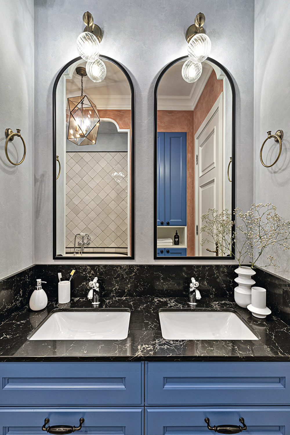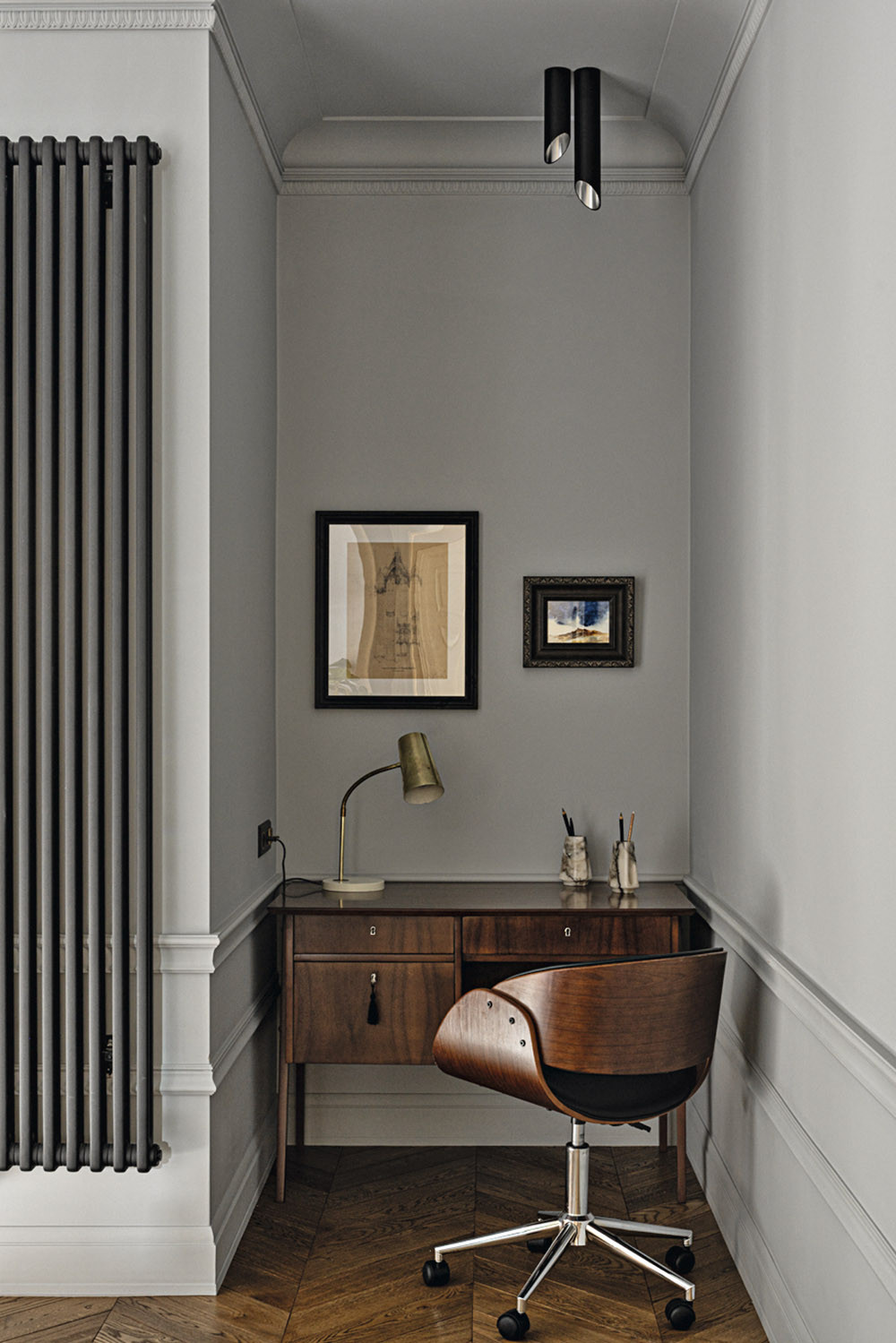 «У меня было очень много разных идей на счет стилистики интерьера, но финальное видение сложилось уже в процессе работы. С самого начала были предопределены только два момента — дубовые полы французской елочкой и мрамор в ванной, — рассказывает автор проекта Альбина Мухаметшина. — Использование винтажных предметов, кстати, изначально не входило в мои планы. Но в ходе отделочных работ я вспомнила, что у нас на дачном чердаке завалялась пара отличных бабушкиных кресел, и решила примерить их в интерьере. Чуть позже случайно на одном из моих объектов на глаза мне попался журнальный столик советских времен, который хозяева собирались отправить в утиль. Я отвезла его на реставрацию, а после «поселила» у себя в гостиной. Так в нашем интерьере почти волшебным образом стали появляться предметы с историей. Что любопытно, после этого проекта я стала предлагать включение винтажных и антикварных предметов в проекты своим заказчикам и окончательно влюбилась в смешение разных эпох и стилей в одном интерьере!» В общественном пространстве квартиры можно выделить несколько функциональных зон: удобную гостиную, столовую и просторную кухню, оборудованную всей необходимой встроенной техникой. Мягкая зона гостиной оформлена современным изящным диваном на высоких ножках и двумя советскими креслами, обитыми серо-голубым велюром: их изогнутые подлокотники вторят округлым формам дивана, а деревянные ножки созвучны журнальному столику. Низкий комод второй половины ХХ века, доставшийся главе семьи от бабушки, дополняет мебельную композицию. В торце гостиной симметрично расположились двери из стекла и металла: одна из них отделяет общественную часть квартиры от приватной, вторая — сделана для симметрии и выполняет функцию фасадов стеллажа. Кухонная мебель изготовлена российской компанией Greta, фасады шкафов выполнены в темном ореховом шпоне и частично в светлой эмали, которая близка по цвету к стенам кухни-гостиной. Столовую группу на шесть персон сделали по индивидуальному заказу на местном столярном производстве. Разные по функционалу зоны кухни-столовой-гостиной объединены общей палитрой Little Greene — красками этого производителя окрашены стены и потолок. Холодные цвета стен контрастируют с медовым оттенком дубовой доски паркета и создают фон для мебели и предметов искусства.