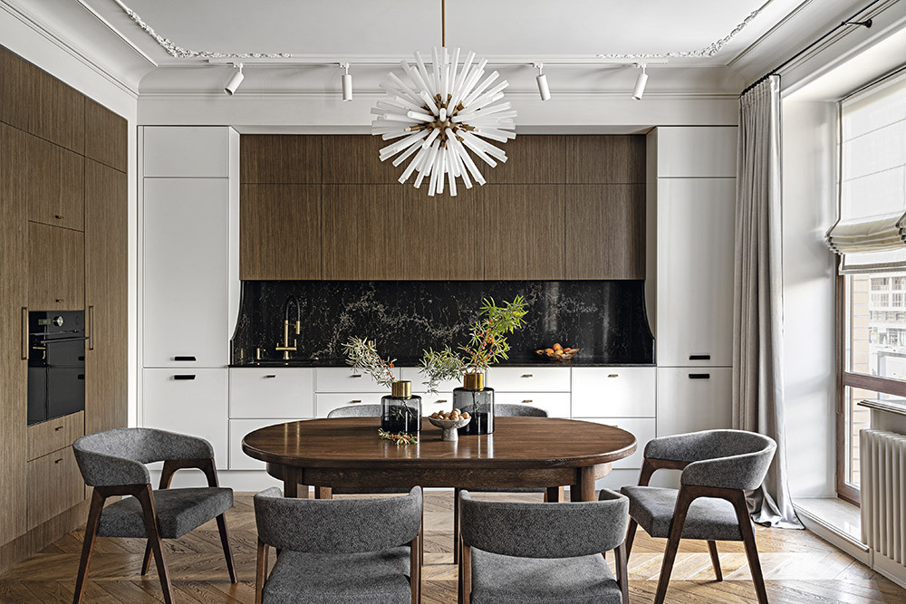Владельцы квартиры предпочли маленькому кухонному острову и скромному столу большой обеденный стол на шесть персон. Кухня, GRETA. Столешница из кварцевого агломерата, Caesarstone. Гипсовая лепнина, творческая мастерская Arabesco. Дубовый паркет Tantum Quercus, компания «Интер-Пол»