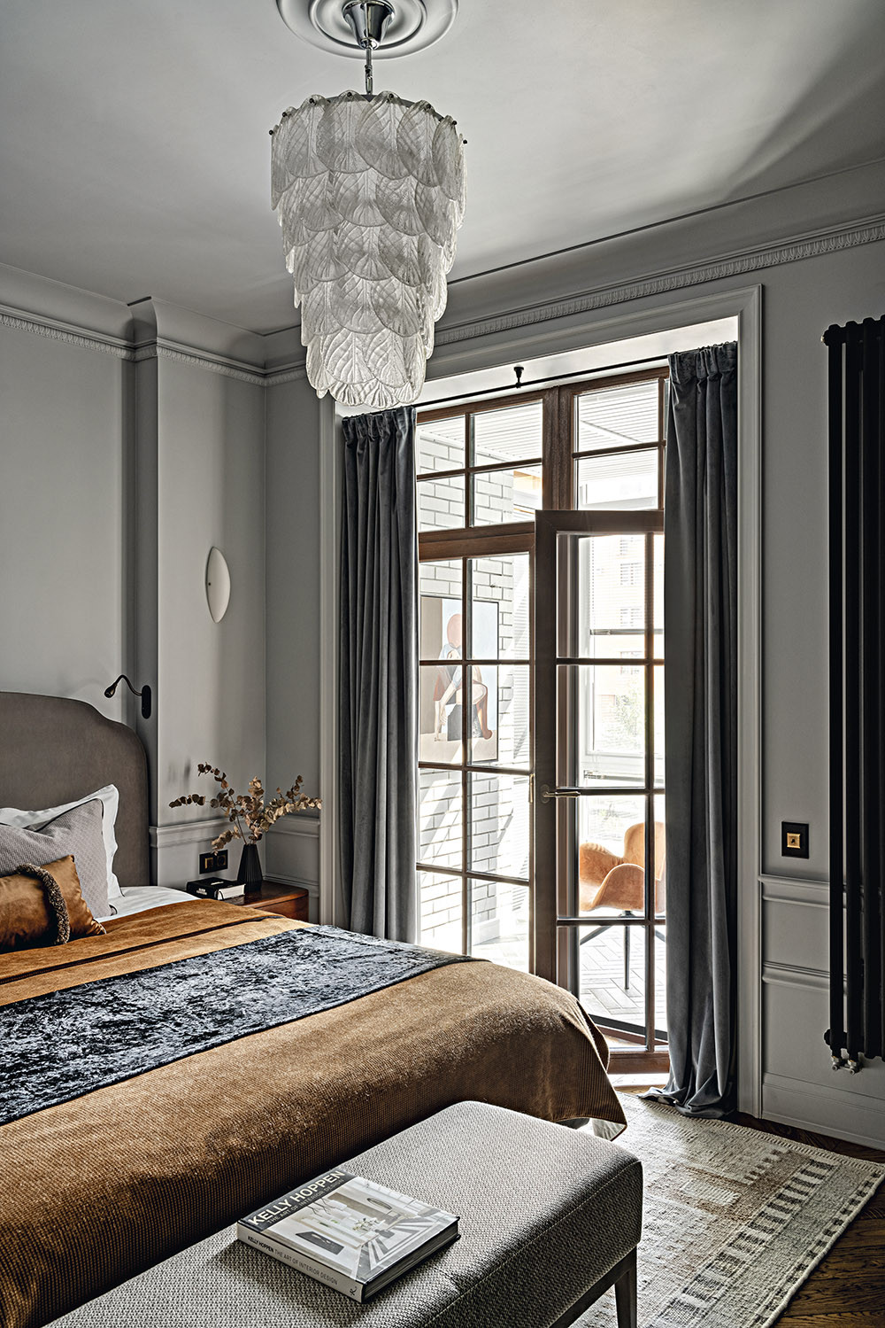 Комнату с балконом выбрали для хозяйской спальни. Изначально здесь был стандартный балконный блок, что искажало геометрию помещения и снижало его инсоляцию — компания «Мастер Veka» заменила его на двустворчатую дверь с красивой раскладкой. Кровать вписана в небольшое углубление, которое появилось благодаря тому, что у стены с одной стороны был выступ несущей колонны и его решили симметрично повторить, выровняв тем самым геометрию помещения. Это оказался довольно удобный прием: слегка утопленная в стену кровать делает использование прикроватных тумб более комфортным. Кровать, банкетка, SHIKANA furniture factory. Бра, ST Luce и ASTRO. Ковер, Persepol Carpet Studio. Текстиль, DINARA AVKHADIEVA