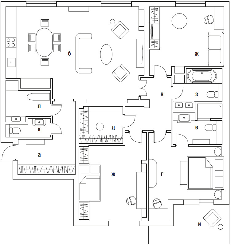 В квартире три спальни, предназначенные для родителей и их детей — мальчика и девочки. Все личные комнаты имеют примерно равную площадь, но оформлены сообразно вкусам своих владельцев. По признанию хозяйки квартиры, они долго не могли определиться — делать одну большую ванную комнату для всех членов семьи или же разделить общую на две небольших. Победило ее давнее желание иметь пусть небольшую, но собственную ванную.