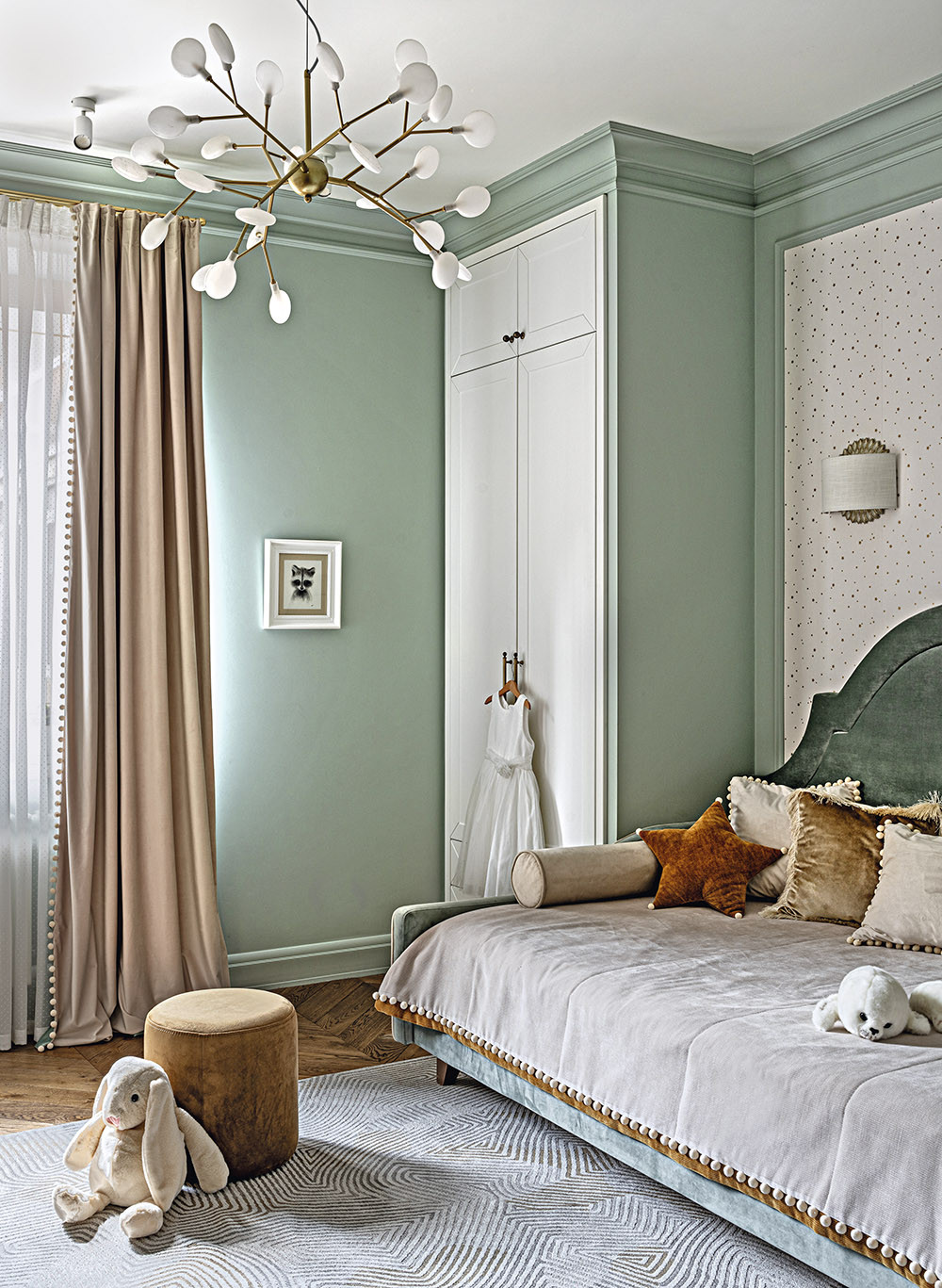 Детская для девочки решена в мягкой пастельной гамме: мятный зелёный, молочный и приглушённо-розовые тона делают комнату очень нежной, но в тоже время не скучной. Открытые шторные карнизы и полотна штор, лежащие на полу, добавляют интерьеру парижского настроения