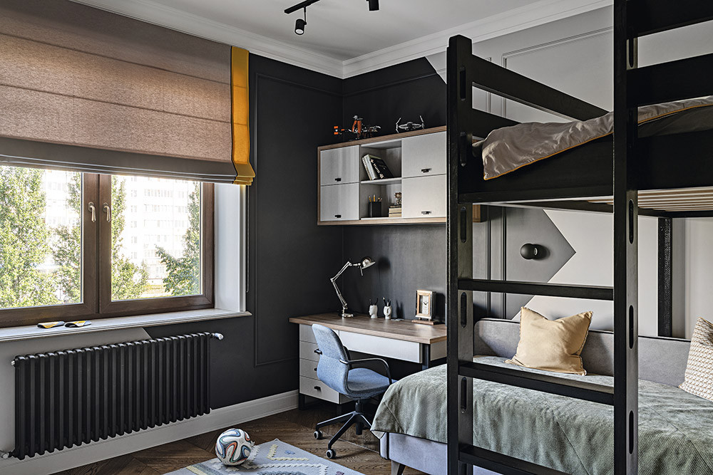 Детская мальчика. У сына хозяев квартиры было два основных пожелания — кровать на втором ярусе и определенная цветовая гамма: он просил комнату в желтых, серых и черных тонах
