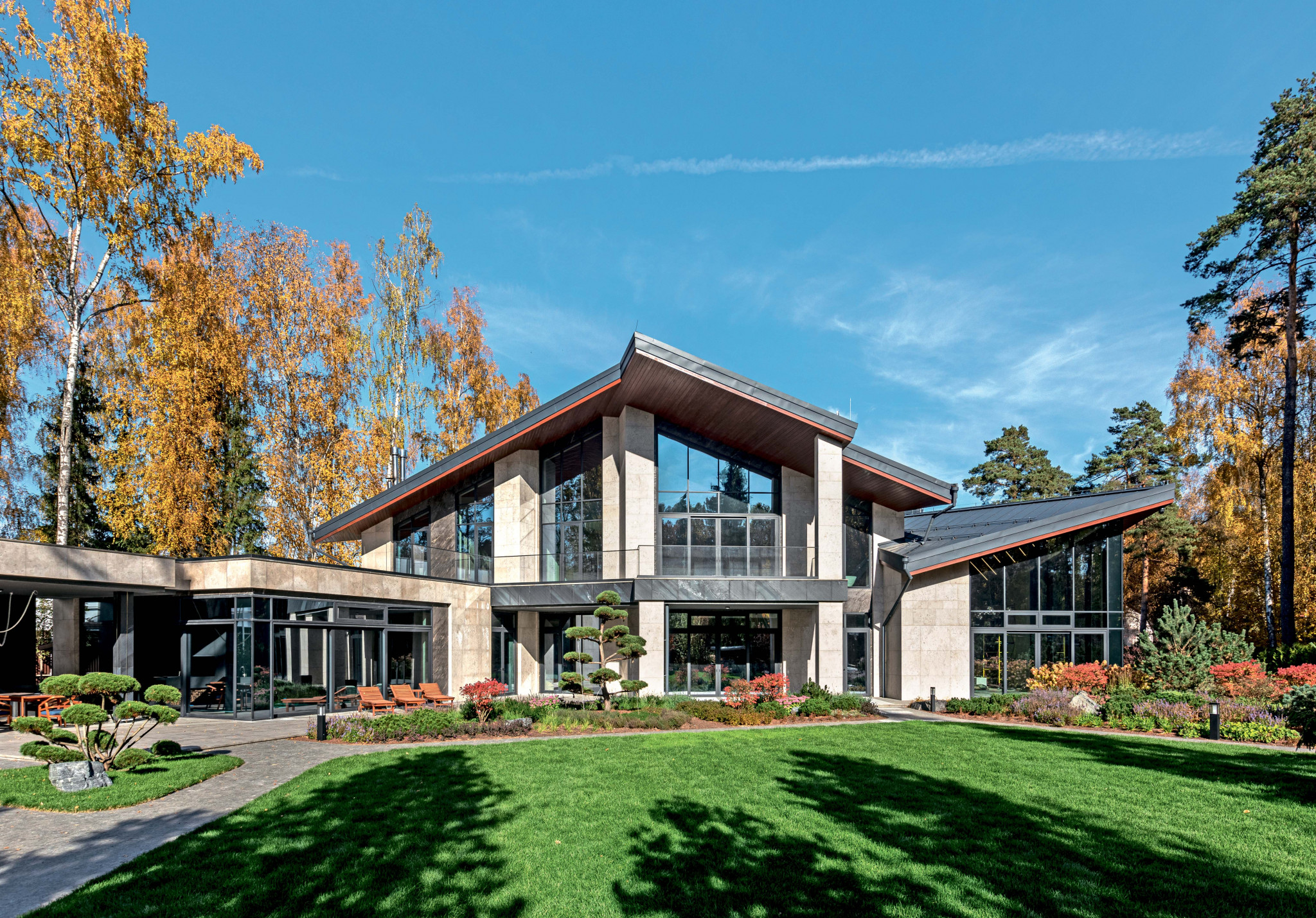 «При проектировании мы учитывали несколько факторов: площадь участка, его форму и ориентацию по сторонам света; рельеф местности и существующие насаждения; возможные варианты расположения главного дома и других построек. Конечно, мы брали во внимание и стилистические предпочтения заказчиков относительно их будущего дома, а также понятное желание клиентов, чтобы участок не просматривался со стороны соседей. В итоге мы нашли решения, учитывающие все факторы. Например, удалось организовать с южной стороны внутренний приватный двор с прекрасным видом на лес — он расположен с противоположной стороны от основного въезда на участок и хорошо просматривается из панорамных окон дома», — рассказывает Оксана Волкова, главный архитектор BOROSA GROUP. Трапециевидную форму дома определила форма самого участка — боковые стены здания параллельны границам земельных владений. Здание придвинуто к западной границе участка с необходимым отступом для устройства технической площадки, входа в котельную и обслуживания инженерных коммуникаций. Полноценный паркинг на 4 машиноместа и отдельный дом для персонала разместились на севере со стороны главного въезда.