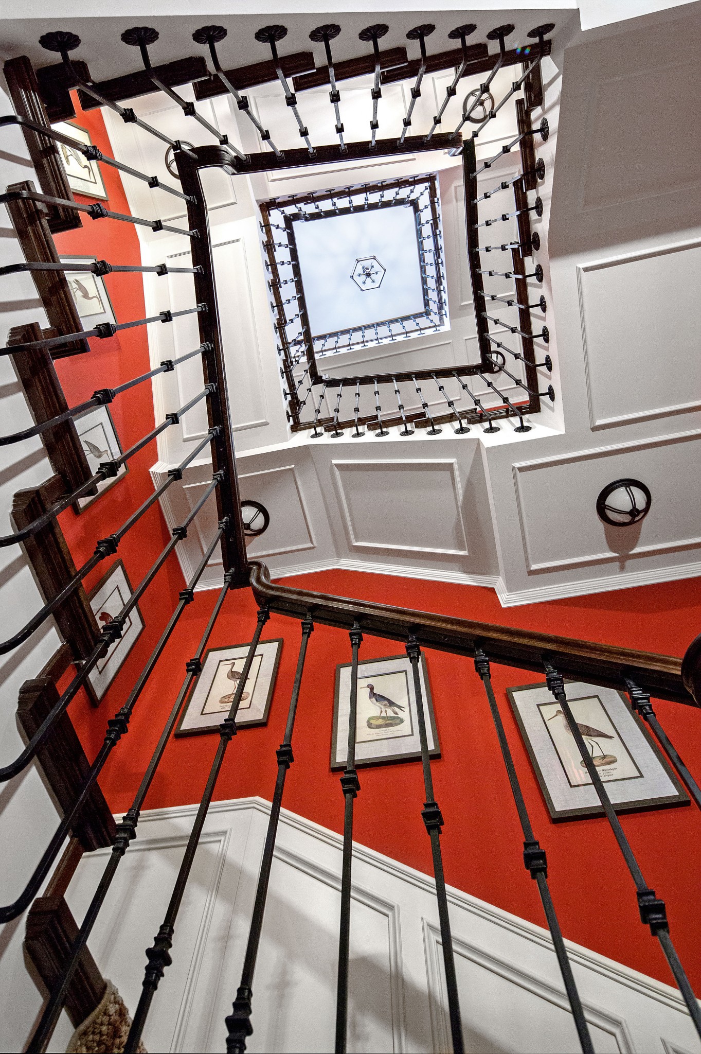 Постоянные заказчики Ольги Кушнарёвой–Леоне обратились к ней с просьбой спроектировать и построить рядом с основным зданием гостевой дом, в котором могла бы жить старшая дочь со своей семьёй, регулярно приезжающая в гости к родителям на выходные. Для семейных сборов, завтраков и обедов в главном доме места хватало, а вот приватных комнат, где бы все с комфортом разместились, уже нет. «Ранее мы активно участвовали и в благоустройстве участка, и в разработке малых форм (беседок, скамеек, мостиков), и даже построили в своё время дом из бруса для досуга детей, — вспоминает Ольга. — Естественно мы были прекрасно знакомы и с ландшафтом, и с архитектурой здания, и даже с тем, какие растения растут на участке. Со временем семья разрослась, дети выросли и обзавелись своими детьми. И когда встал вопрос о дополнительных жилых комнатах для новых поколений семьи, нам было ясно и понятно, что и как надо проектировать». Внешне новое строение выглядит почти так же, как главный дом: та же конфигурация, та же отделка (клинкерный кирпич и мрамор), только чуть меньше. В доме нет ни гостиной, ни кухни. Зато они есть в главном доме, где по‑прежнему служат своеобразными центрами притяжения семьи. Именно поэтому доминантой интерьера стала изящная лестница, соединяющая все три этажа здания, а также пространство вокруг. Лестничные холлы — эффектные помещения с красными стенами, коваными чёрными балясинами и белыми панелями. «Основной дом