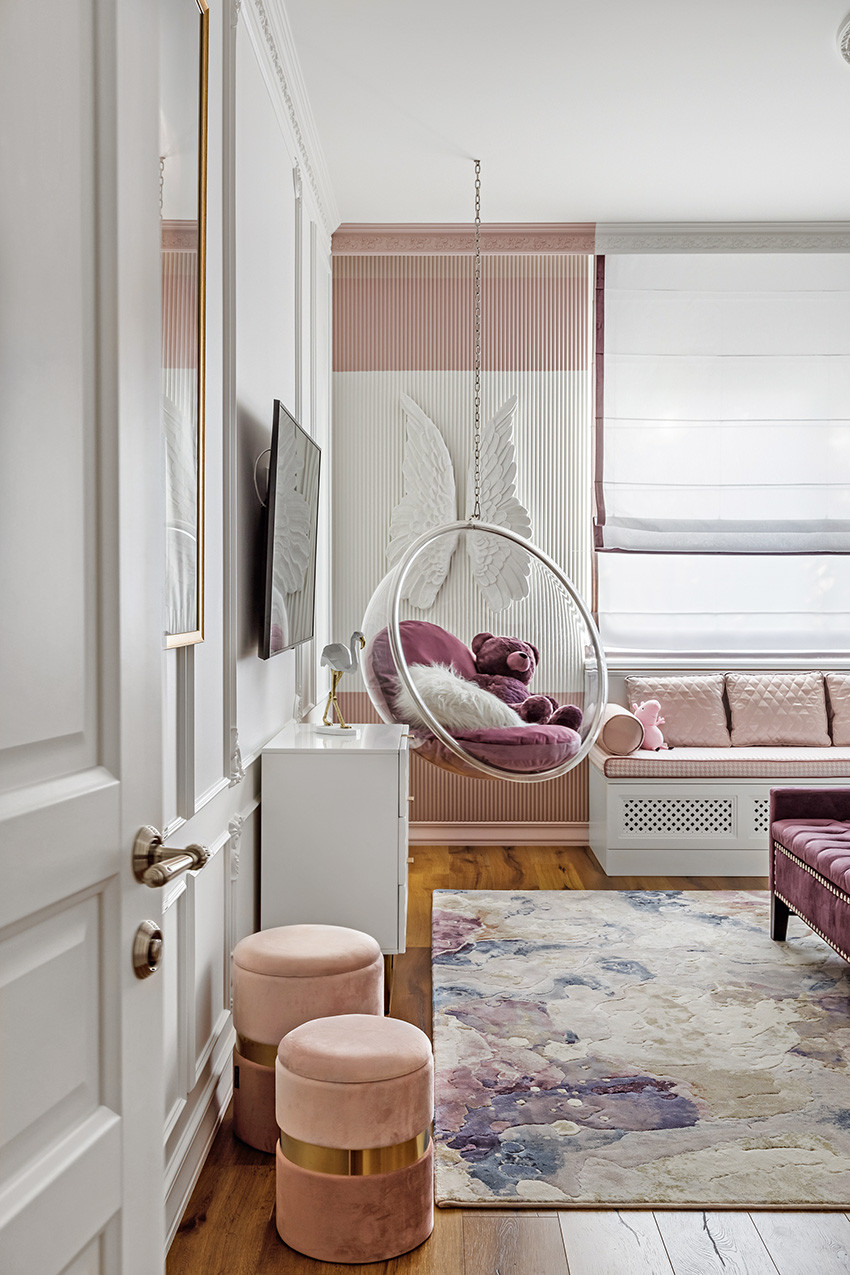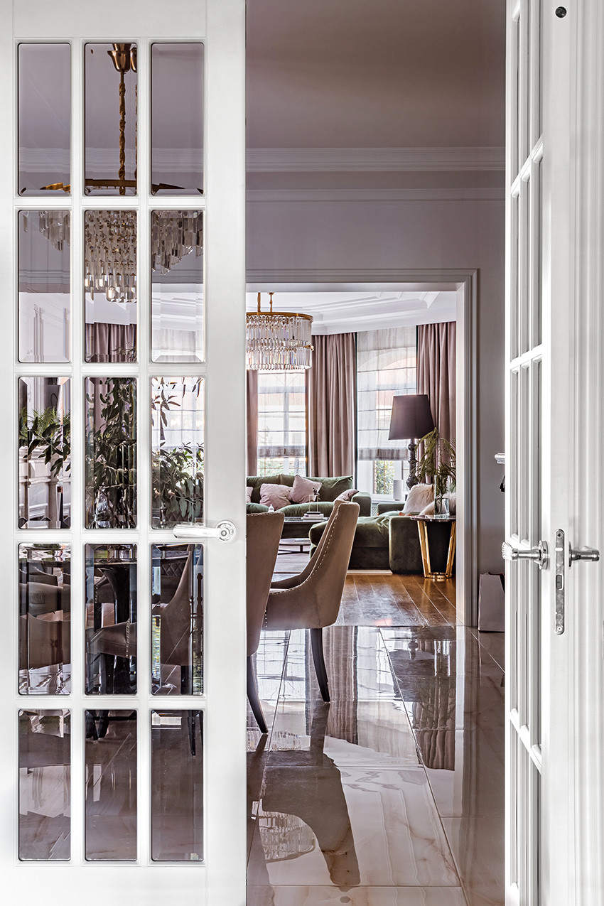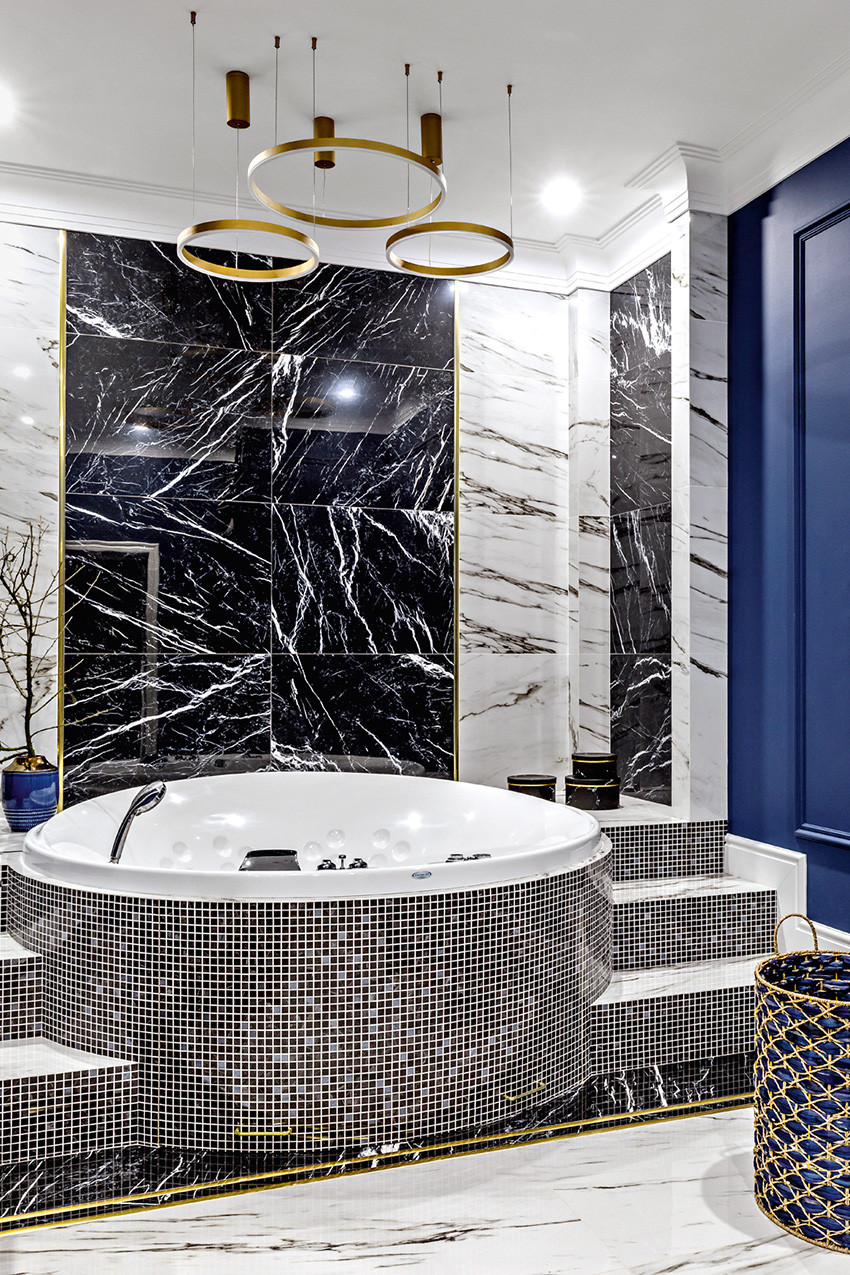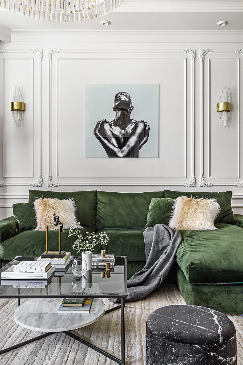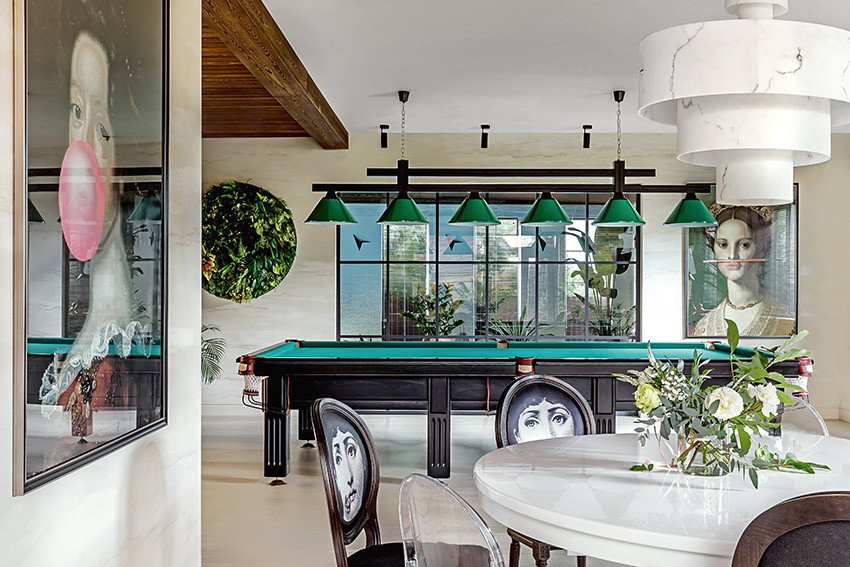 Заказчики — молодая пара с двумя детьми (мальчиком двух лет и девочкой двенадцати лет) — любят всё нестандартное, креативное, оригинальное и дали Ирине полную свободу действий, что позволило ей реализовать интересные дизайнерские идеи. Тема концепции — уникальная и неповторимая атмосфера, интерьер вне времени с яркими и самобытными деталями и современной живописью в духе поп–арта. «Мы собрали некий микс, смешали новое и старое, где явно чувствуются отсылки к ар–деко, — продолжает Ирина. — Этот стиль эклектичен сам по себе и представляет собой гармоничное и при этом броское сочетание модерна и неоклассицизма. Добавили яркие крупноформатные репродукции под стеклом в деревянных рамах с лаковой финишной отделкой. Озорные, немного хулиганские сюжеты на тему классической живописи придают пространству особый шарм, делают его более ироничным, живым». Замиксовали и материалы — в интерьере много как матовых, так и лаковых, глянцевых поверхностей. Игра фактур натурального камня, дерева, кожи, меха, различных оттенков металла смотрится выигрышно и всегда роскошно. В цветовой гамме использовали белые, светло–серые и нюдовые оттенки — они отлично гармонируют между собой и с базовыми тонами стен. Немаловажную роль в интерьере играет освещение — в каждом помещении есть возможность менять световой сценарий сообразно настроению. Торшеры, бра, люстры, встроенные потолочные светильники акцентируют каждый свою зону на потолке или стенах, создают удивительно тёплую, уютную атмосферу в доме.