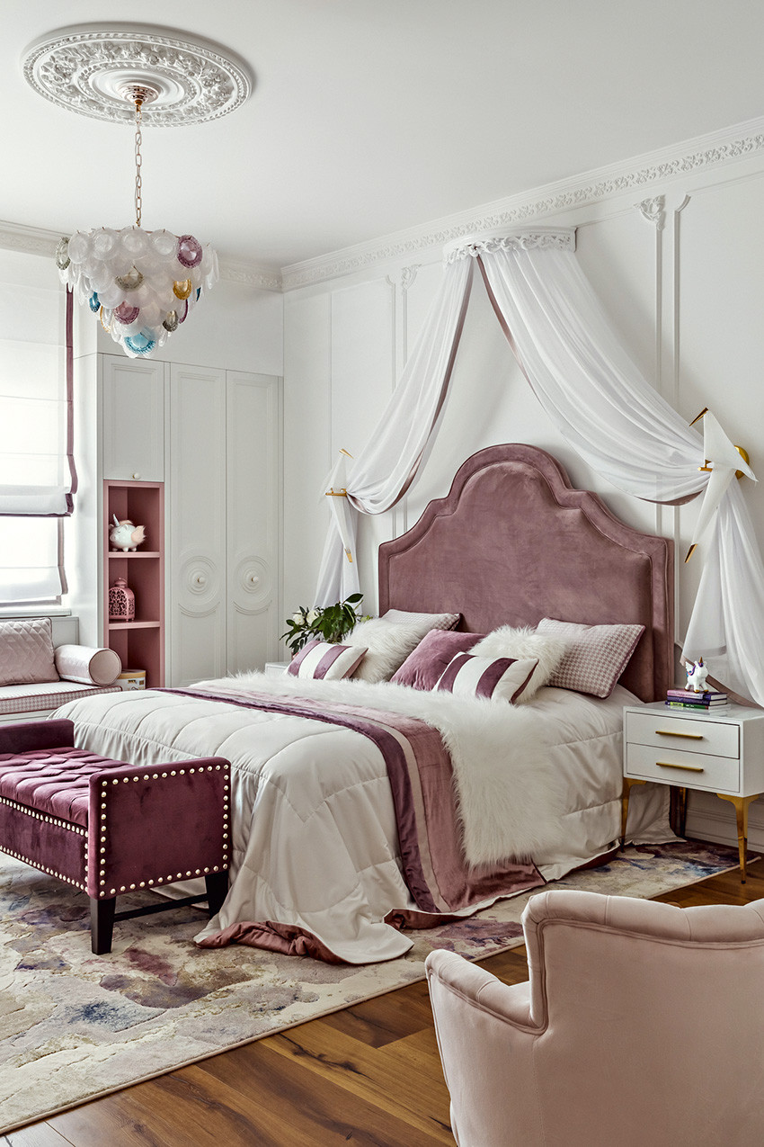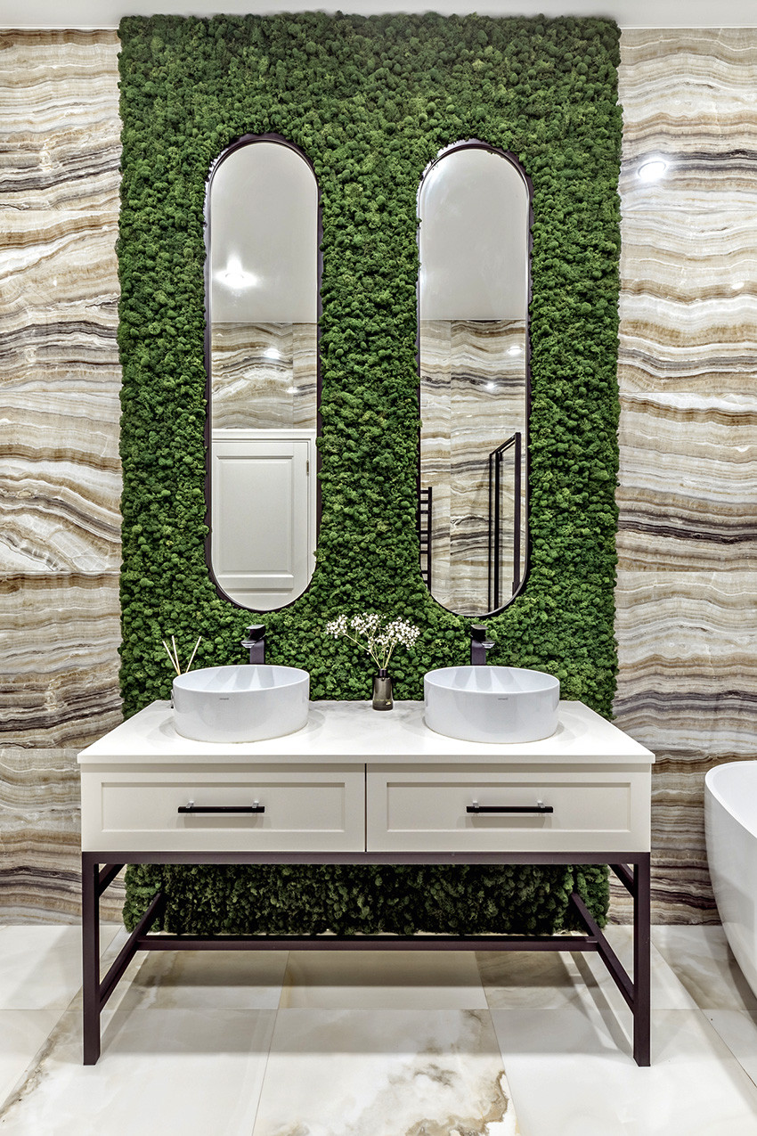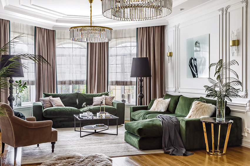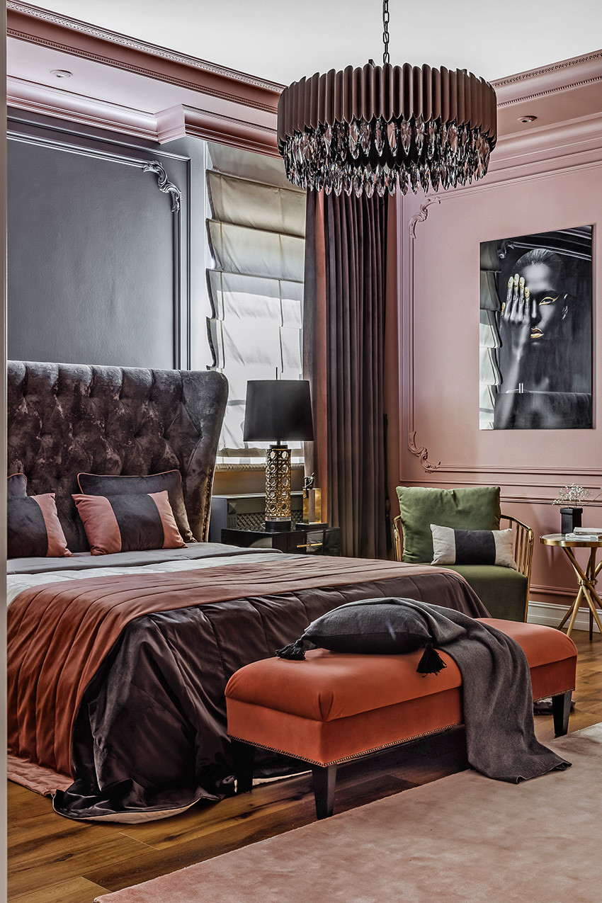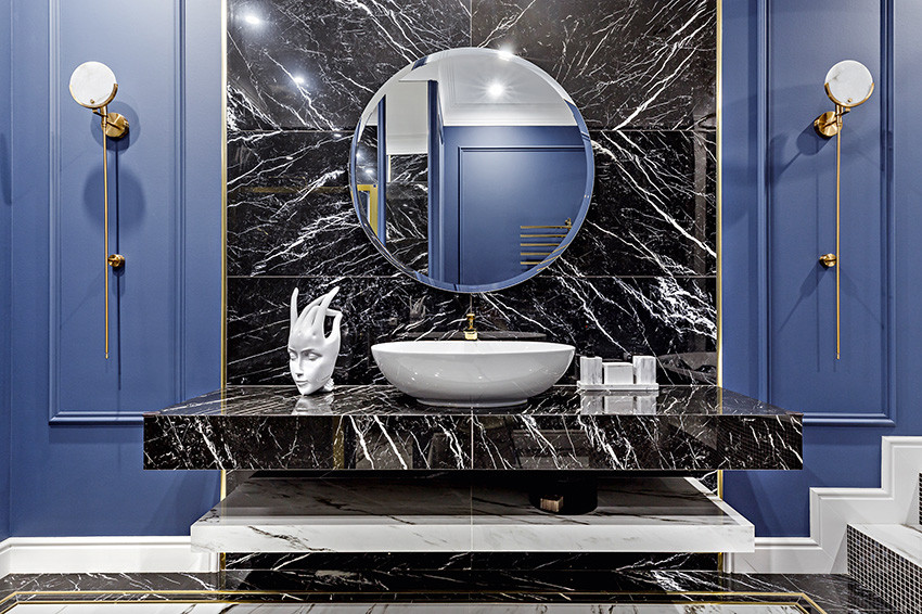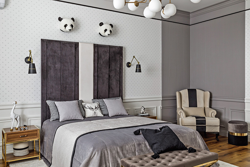 Заказчики — молодая пара с двумя детьми (мальчиком двух лет и девочкой двенадцати лет) — любят всё нестандартное, креативное, оригинальное и дали Ирине полную свободу действий, что позволило ей реализовать интересные дизайнерские идеи. Тема концепции — уникальная и неповторимая атмосфера, интерьер вне времени с яркими и самобытными деталями и современной живописью в духе поп–арта. «Мы собрали некий микс, смешали новое и старое, где явно чувствуются отсылки к ар–деко, — продолжает Ирина. — Этот стиль эклектичен сам по себе и представляет собой гармоничное и при этом броское сочетание модерна и неоклассицизма. Добавили яркие крупноформатные репродукции под стеклом в деревянных рамах с лаковой финишной отделкой. Озорные, немного хулиганские сюжеты на тему классической живописи придают пространству особый шарм, делают его более ироничным, живым». Замиксовали и материалы — в интерьере много как матовых, так и лаковых, глянцевых поверхностей. Игра фактур натурального камня, дерева, кожи, меха, различных оттенков металла смотрится выигрышно и всегда роскошно. В цветовой гамме использовали белые, светло–серые и нюдовые оттенки — они отлично гармонируют между собой и с базовыми тонами стен. Немаловажную роль в интерьере играет освещение — в каждом помещении есть возможность менять световой сценарий сообразно настроению. Торшеры, бра, люстры, встроенные потолочные светильники акцентируют каждый свою зону на потолке или стенах, создают удивительно тёплую, уютную атмосферу в доме.