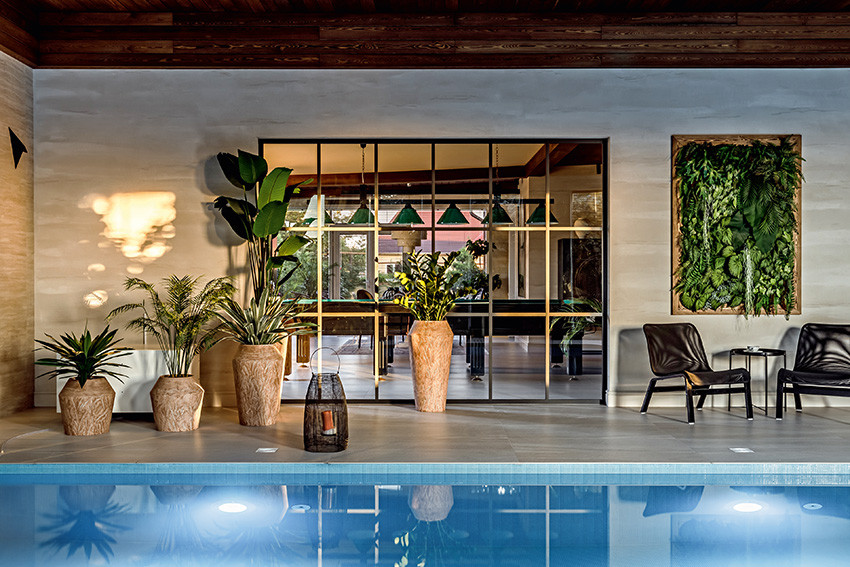 Когда к Ирине Скоробогатовой попал объект, полным ходом шла работа по реорганизации объёма. К дому площадью 250 квадратных метров хозяева пристраивали ряд новых помещений: бассейн, хаммам, террасу, детские комнаты, три санузла, гардеробные и технические помещения. Поэтому первое, что нужно было сделать дизайнеру, — грамотно «собрать» пространство, продумать логистику, функционал и интегрировать вновь возводимые комнаты в исходную планировку. «Это была сложная и вместе с тем интересная задача, — поясняет Ирина. — Столовую мы совместили с террасой, барбекю, спа–зоной и бильярдной, она стала центром притяжения семьи, превратилась в многофункциональное пространство для отдыха и развлечений. Для детей сформировали отдельный блок со спальнями, игровой, гардеробной, ванной и санузлом. Главную гостиную объединили с каминной группой и местом для игры в шахматы, а кухню отделили высоким порталом, украшенным лепным декором и зеркалами, которые визуально стирают границы между помещениями. Обычный дом изменился до неузнаваемости: мало того что площадь увеличилась почти в два с половиной раза, он теперь соответствует самым высоким современным стандартам».