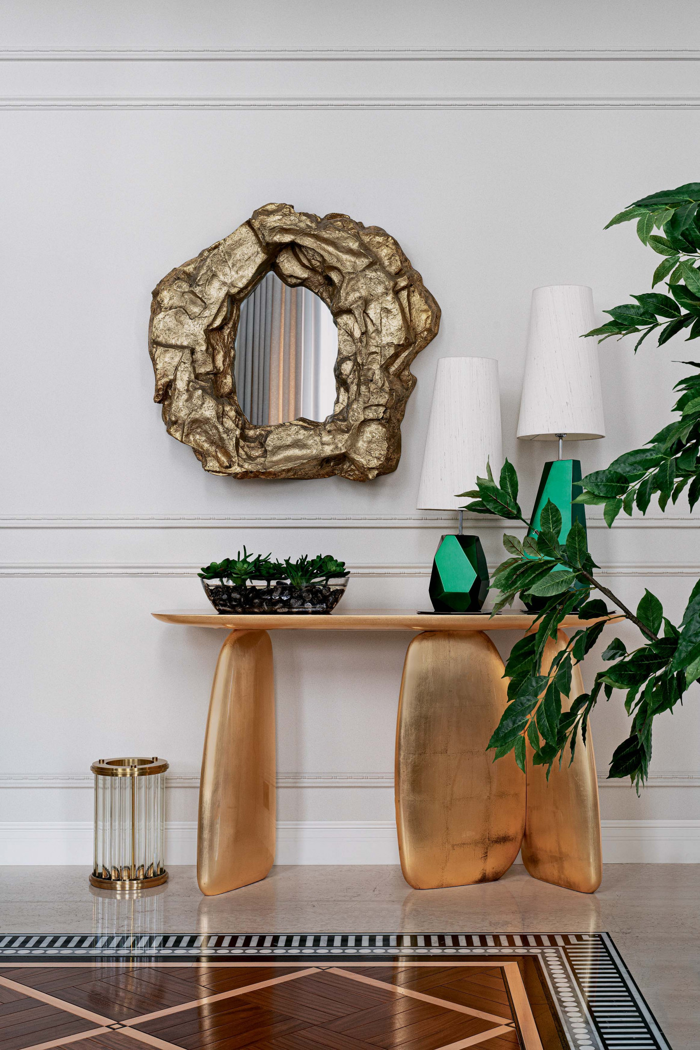 Архитектор Татьяна Миронова обладает талантом превращать прозу жизни, с присущей ей практичностью и бытовыми мелочами, в невероятный интерьерный праздник, наполненный радостью и удовольствием, цветовыми рифмами, неожиданными контрастами и желанием блеснуть. На этот раз объектом приложения творческих сил стал загородный дом площадью 2000 квадратных метров, где на четырёх этажах разместилось, кажется, всё, что необходимо для счастливой и увлекательной жизни семьи с двумя подрастающими сыновьями, и кругом гостей. Заказчики обратились к Татьяне на этапе, когда коробка дома была уже построена, планировка обозначена, шла отделка фасада, а концепцию интерьера только предстояло найти. «Меня пригласили исключительно по публикациям в журнале безо всяких рекомендаций. Заказчикам нужен был современный дом, но довольно роскошный, с элементами ар-деко, — рассказывает Татьяна Миронова. — В итоге мы остановились на идее элегантных классических светлых стен, на фоне которых появились бы довольно яркие, «звонкие» и экстравагантные предметы». Несмотря на насыщенность предметной среды, первое впечатление от интерьера — лёгкость. Кажется, что он появился чудесным образом, как в калейдоскопе, при очередном повороте которого все детали сложились в восхитительную картину, составленную из света, зеркальных отражений, эффектных деталей, редких находок, нежнейших жемчужных и сиреневых оттенков и ярких вкраплений золотого и изумрудного. Такой же эффект сохраняется при движении по дому, особенно в парадной его части — через холл, гостиную, столовую, кухню или в зону развлечений на цокольном этаже. «Я считаю, что человек, войдя в дом, должен уловить интерьерный замысел с первого взгляда и сразу почувствовать, что всё в нём сделано одной рукой и на одном дыхании», — так формулирует основной принцип своей работы автор проекта. Чтобы возник такой эффект, Татьяна Миронова вместе со своим коллегой Андреем Конторовским создаёт перекличку декоративных приёмов, каждый из которых в разных помещениях развивается по‑своему, будь то оформление пола каменным декором, неординарный дизайн светильников, аккуратные китайские и другие восточные мотивы или щедрые порции золотых бликов. Особая роль в этой концепции отведена цвету — светлый тон стен с небольшими нюансами стал основой интерьера, а сиреневые и зелёные оттенки крупными стежками связали всё пространство дома в единое целое.
