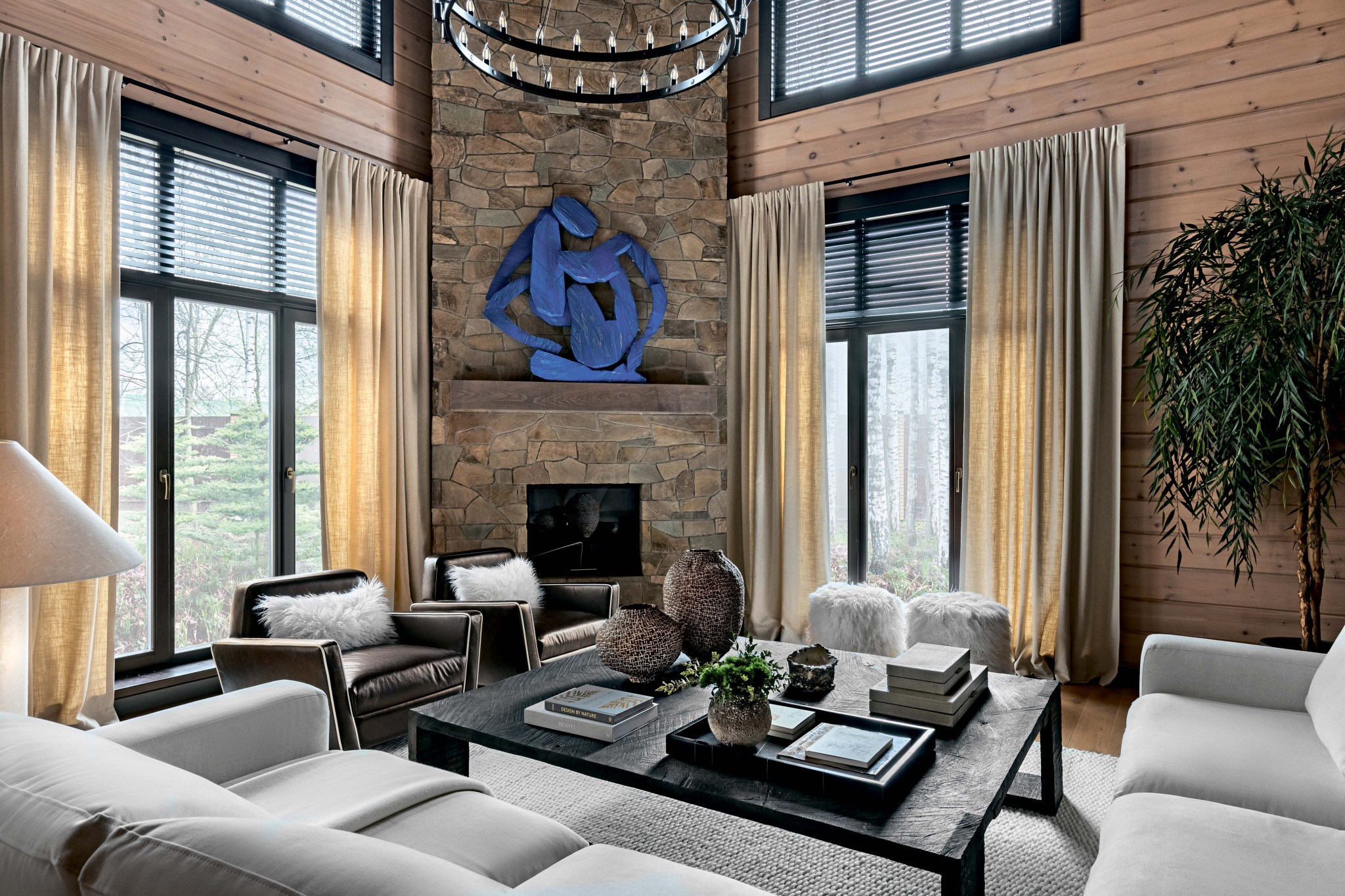 Семейная пара — настоящие жители мегаполиса и никогда не задумывались о переезде за город. Однако с появлением двух маленьких дочек прелести загородной жизни стали более очевидны, и они купили участок в ближнем Подмосковье и начали строить дом. Сначала удалённо (в то время они ещё находились в Америке), а потом и лично, уже в Москве, когда подошло время заняться внутренним оформлением. Создать подходящий по духу интерьер они поручили Олесе Федоренко — руководителю и основателю студии Home Nature. «Наши представления и желания заказчиков идеально совпали, — замечает Олеся. — Мы специализируемся на теме экологичного дизайна и осознанного потребления. Хозяева, в свою очередь, хотели создать в интерьере атмосферу шале, но при этом лёгкого и современного. Поэтому мы использовали в отделке традиционные приёмы и материалы: массивный камень, фактурные деревянные поверхности, кожу, мех, металл. Это отсылает нас к идее шале. Но, чтобы грубые фактуры не смотрелись слишком тяжеловесно, мы смягчили их светлым натуральным текстилем на окнах и в мебели. За счёт соединения разных фактур интерьер выглядит уютным и многогранным. В то же время нужно было подчеркнуть природную составляющую и «впустить» природу в дом: для этой цели на больших панорамных окнах мы повесили лёгкие деревянные жалюзи, которые открывают вид на красивый елово–берёзовый лес».