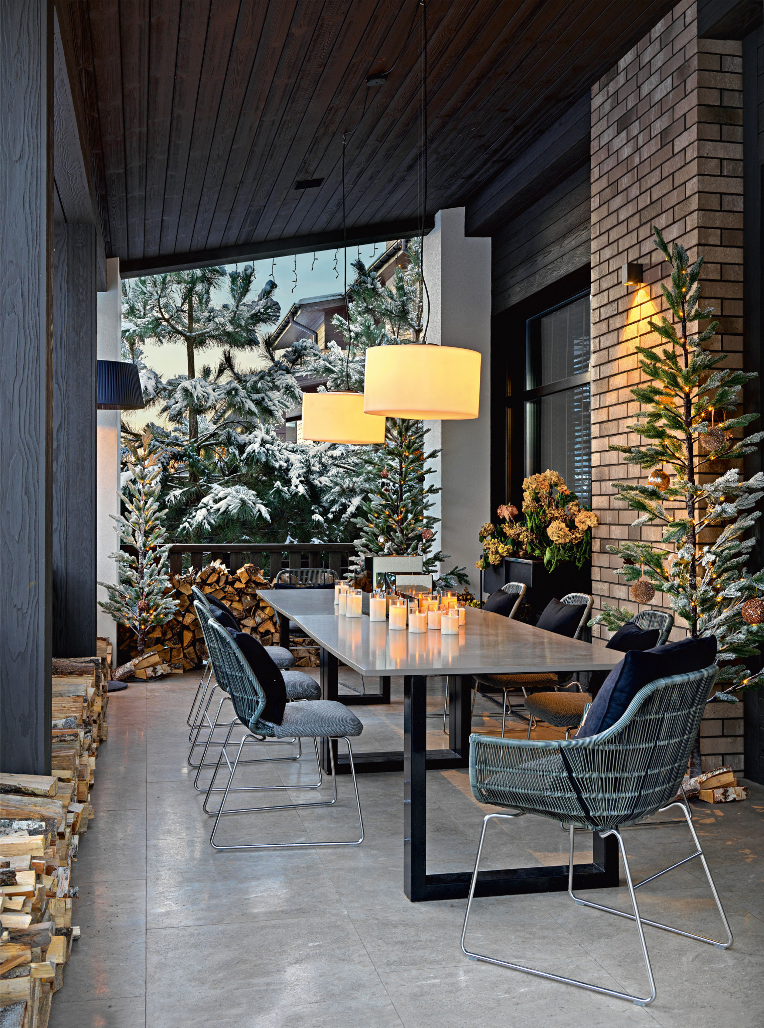 Как и во многих работах студии, главным принципом архитектурного решения стала контекстуальность. Соразмерность и созвучность окружающей среде прослеживаются во всех ключевых элементах резиденции. Не отходя принципиально от существующего формата и пятна застройки, архитекторы провели полную модернизацию здания, грамотно расставив композиционные акценты. Кирпич, брашированная термодоска, увеличенные оконные проёмы, каменное основание «приземлили» дом, сделали его более уютным — постройка выглядит органично среди природного пейзажа. «Мы всегда очень тщательно подходим не только к выбору материалов, но и к их обработке, — комментирует один из авторов проекта Евгений Недоборов. — Так, фактура брашированной сосны, покрытой густой тёмной краской, хорошо считывается при любом освещении. Благодаря продуманной внешней подсветке, правильно организованному объёму гаража и атмосферному террасному ландшафту резиденция оставляет ощущение камерности и уникальности. При помощи точечного апгрейда типовой коттедж изменился визуально и функционально, став объектом гордости хозяев и живого интереса гостей и соседей». «Занимаясь бизнесом и ведя довольно активную социальную жизнь в городе, заказчики стремились к максимально комфортной и расслабленной атмосфере за городом,—добавляет Игорь Колесников.—Дом создавался как место восполнения ресурса, место силы, вдохновляющее на рабочие подвиги. Мы старались размыть границу между домом и природой.