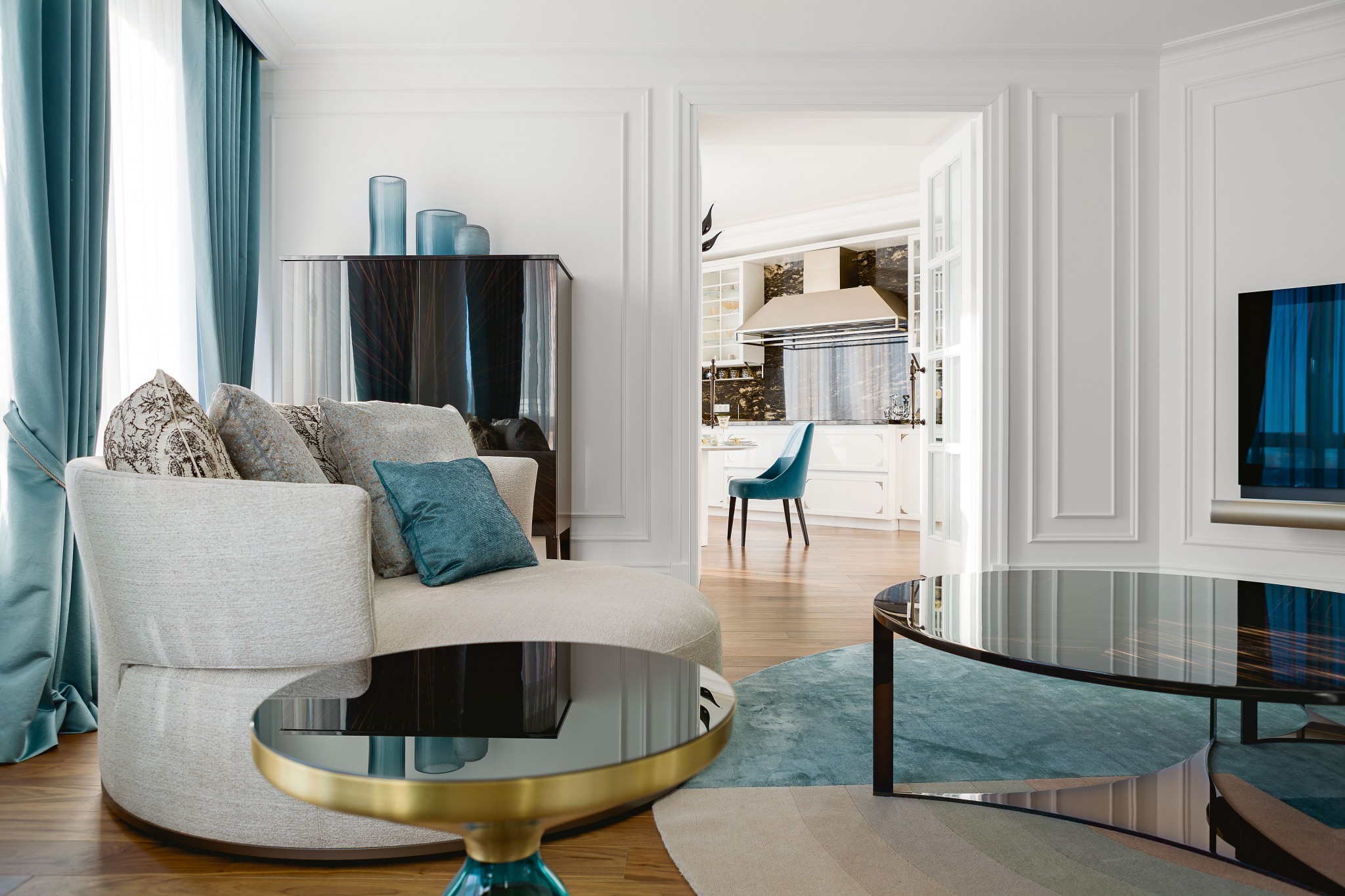 Всё началось с того, что одну из стен в гостиной декоратор Елена Березина предложила оформить обоями–гравюрой с видами главной водной артерии Венеции— Гранд–канала. Идея так понравилась хозяйке, что итальянскую тему решили развить. Так в интерьере появились изысканные светильники, созданные венецианскими стеклодувами на одной из старейших мануфактур — BAROVIER&TOSO. На обивку мягкой мебели, для портьер и подушек взяли ткани знаменитой фабрики RUBELLI. Тема Венеции «звучит» и в цветовой гамме. Ведущий оттенок — бирюза, цвет морской воды поддерживает образ на ассоциативном, эмоциональном уровне. Завершающий штрих в