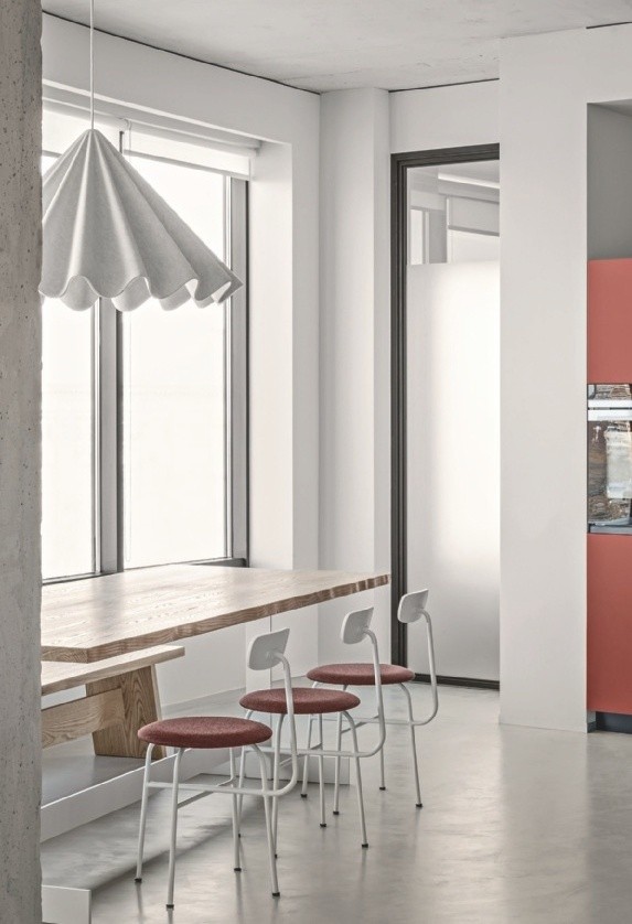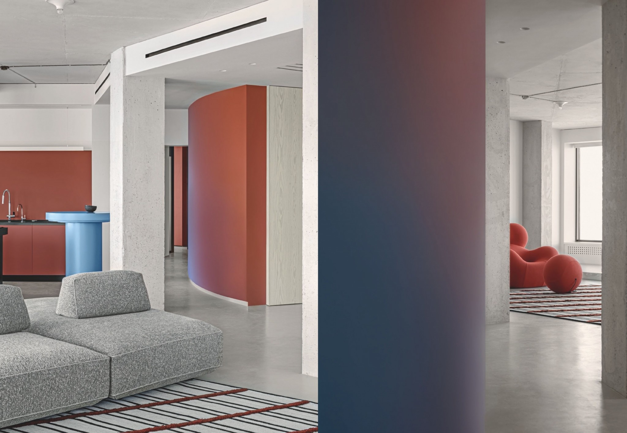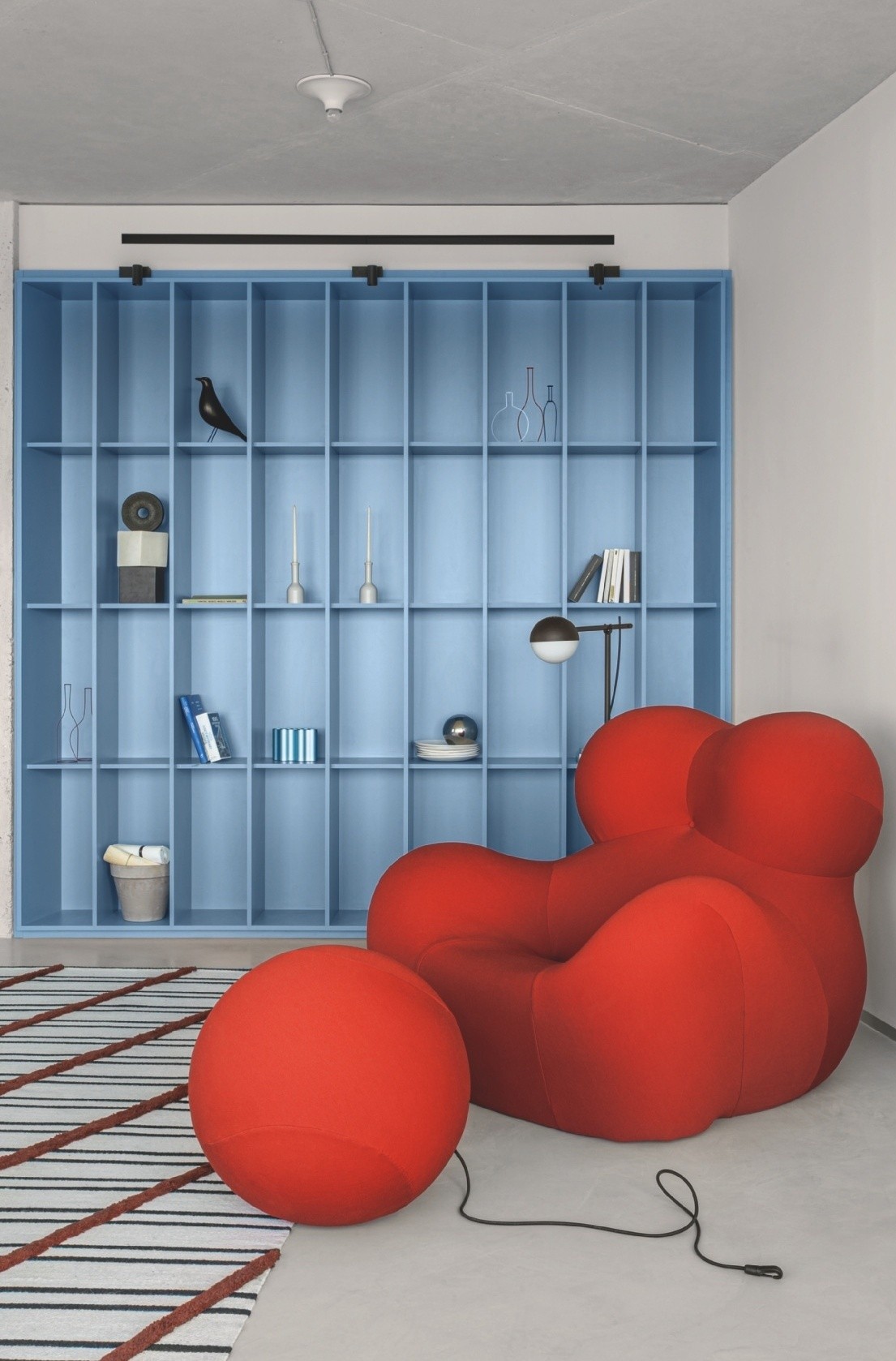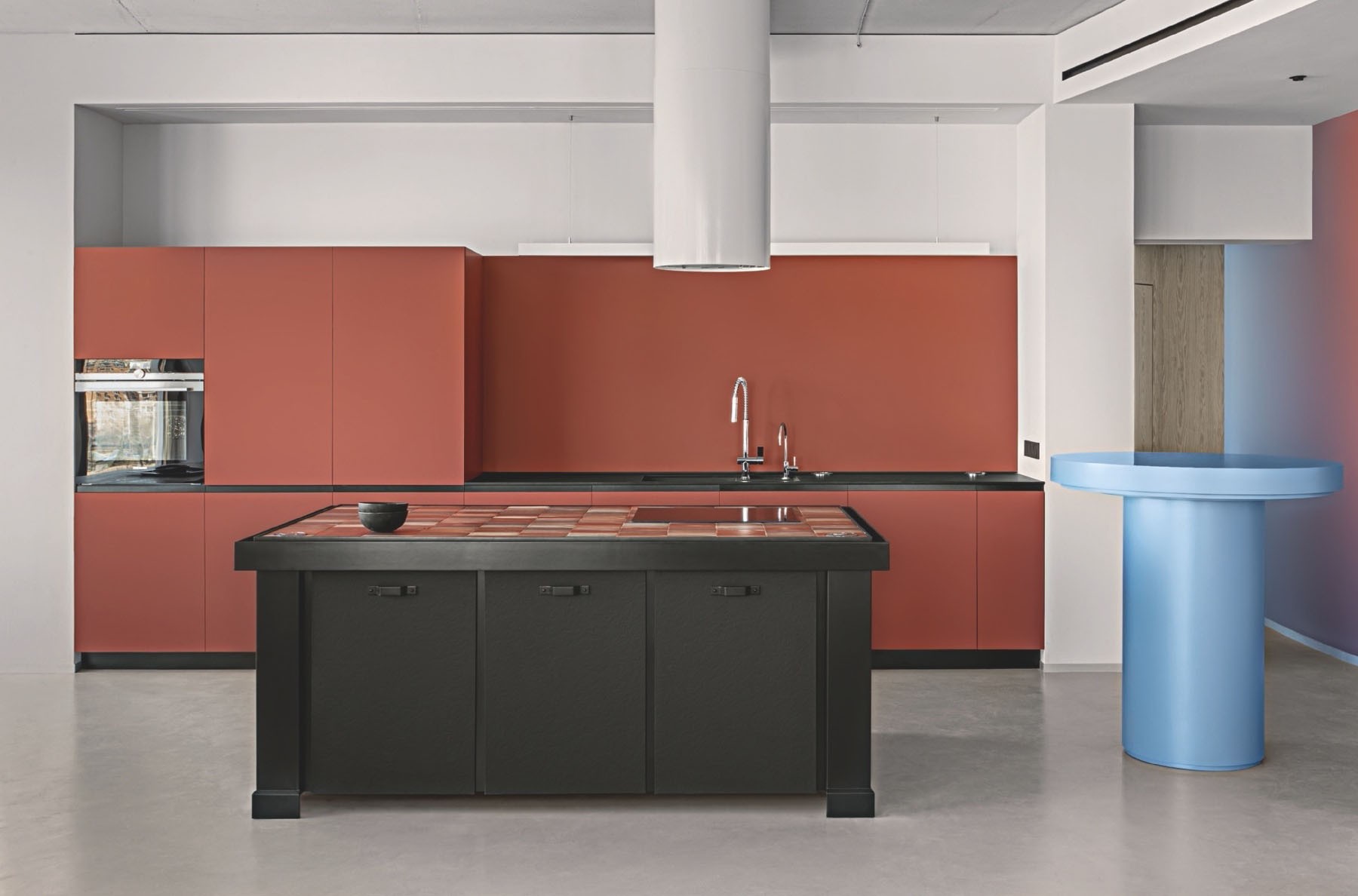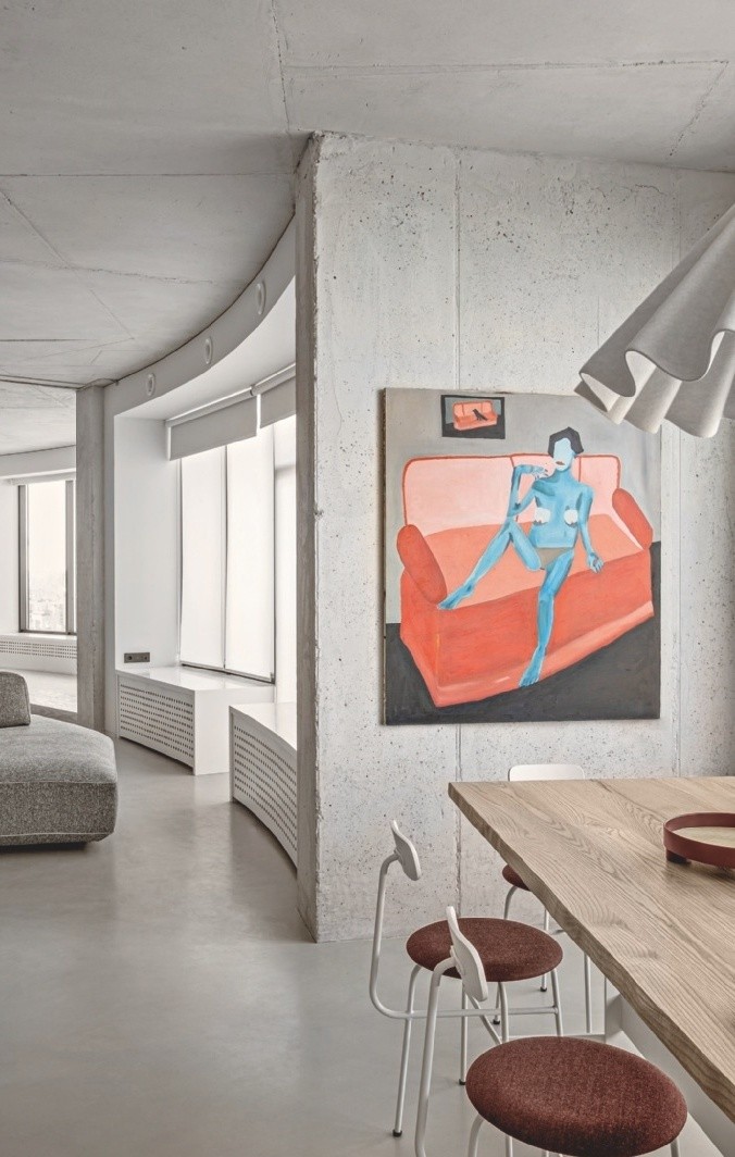 Концептуальность интерьера усиливают бетонные поверхности стен и потолка, покрытые лессировочным полупрозрачным лаком, и пол из микроцемента. На этом брутальном фоне особенно эффектно смотрится дизайнерская мебель. «К счастью, хозяева согласились на все наши рекомендации в отношении подбора знаковых вещей, которые привносят динамику в облик пространства, — продолжает Рина. —Несмотря на строгие формы и минимум предметов обстановки, интерьер получился уютным благодаря цветовым акцентам. Палитру задаёт живописное полотно на стене у обеденного стола, цвета которого перекликаются со встроенными шкафами на кухне и терракотовой плиткой Mutina, покрывающей столешницу острова. Картину дополняют голубой барный стол Mushroom Table собственного производства, книжный стеллаж того же оттенка, полосатый ковёр Vandra Rugs и красное культовое кресло UP5 по дизайну Гаэтано Пеше».