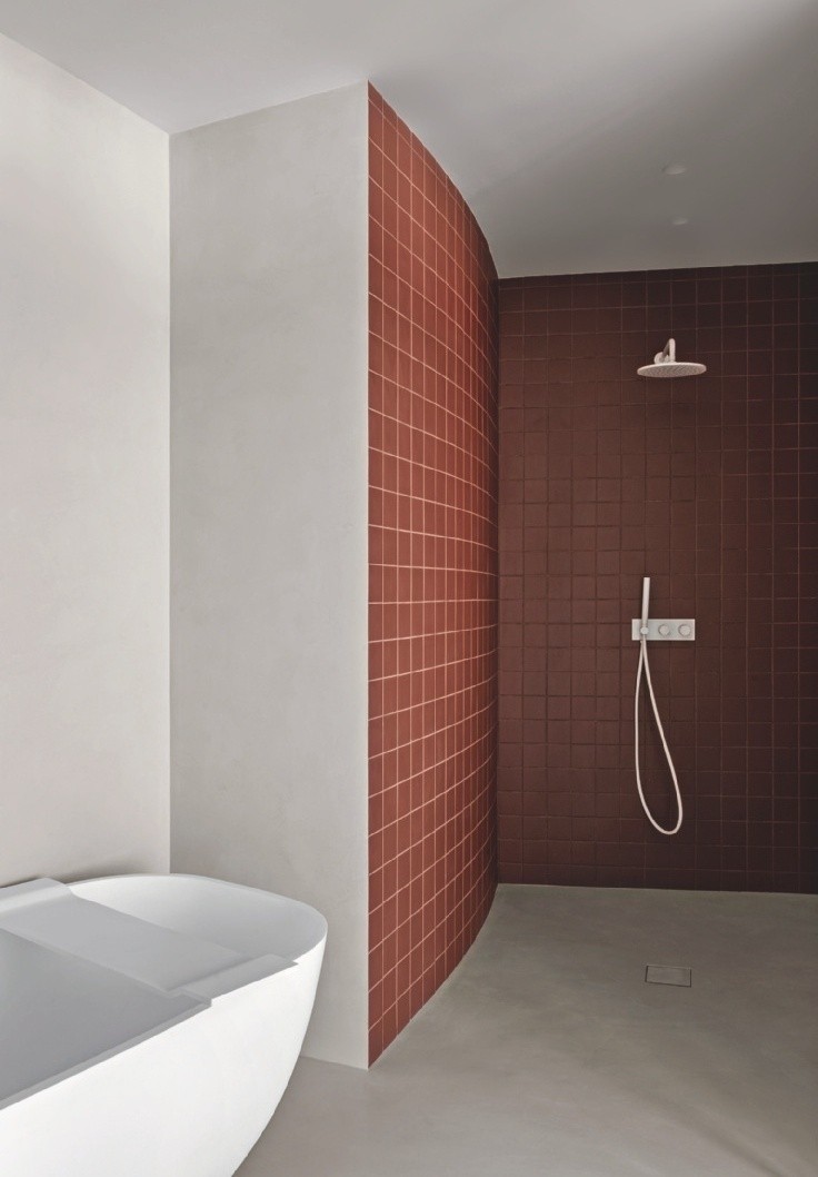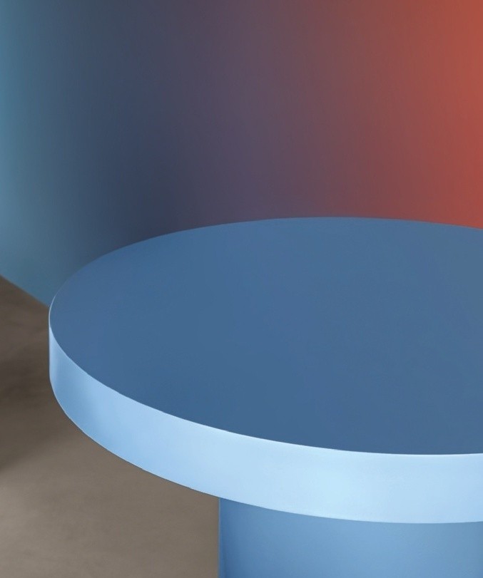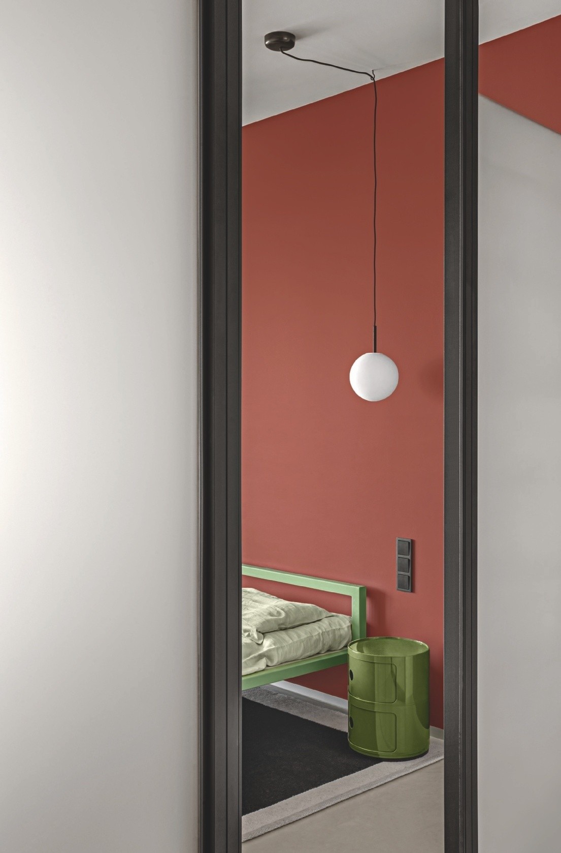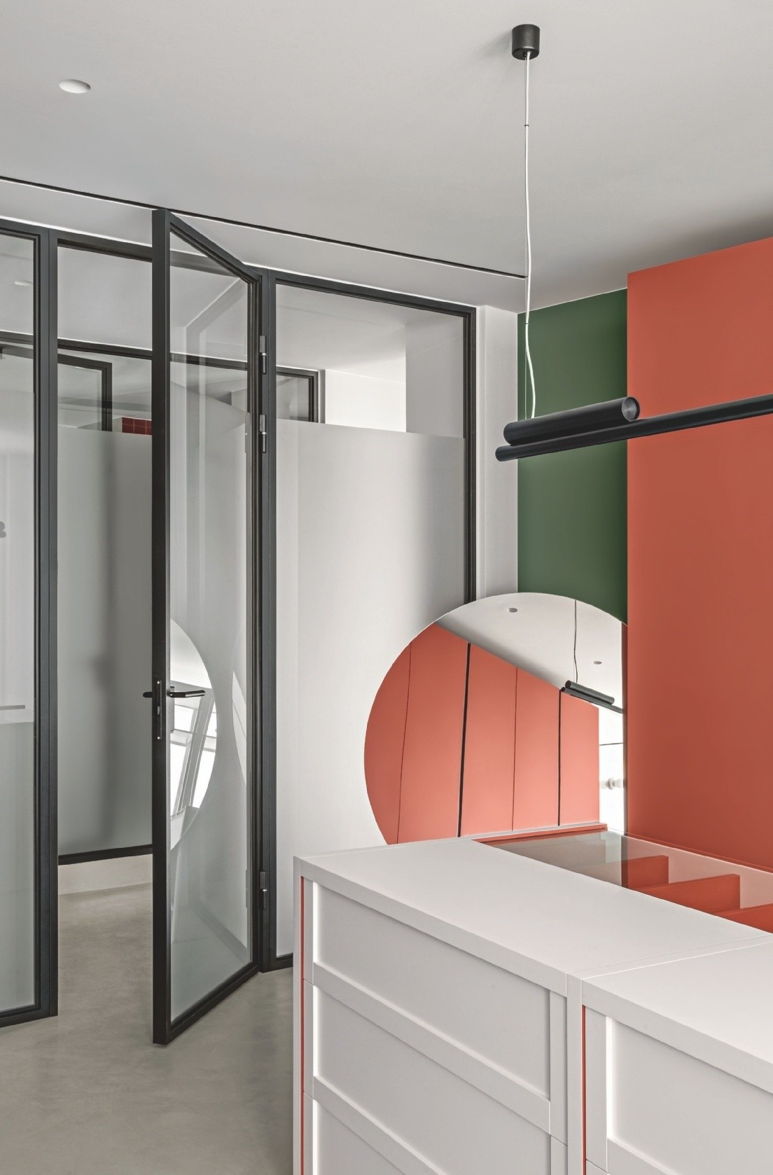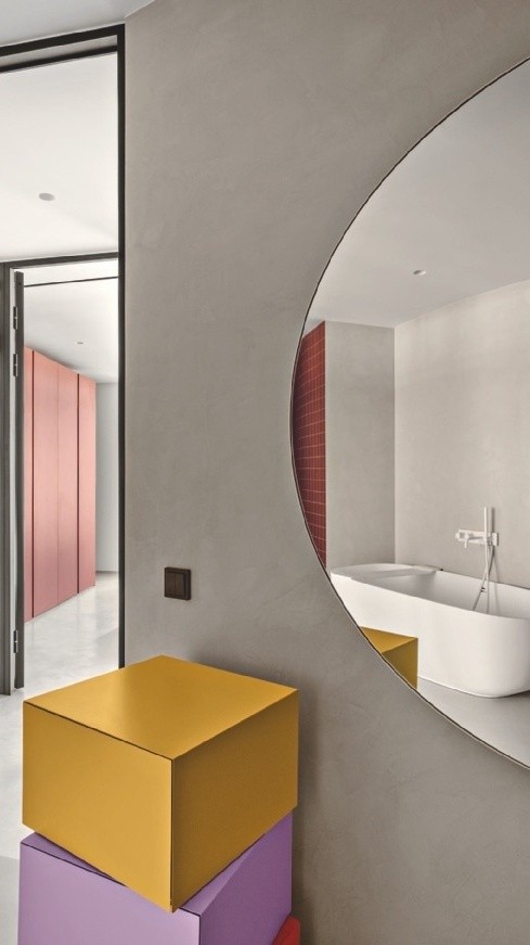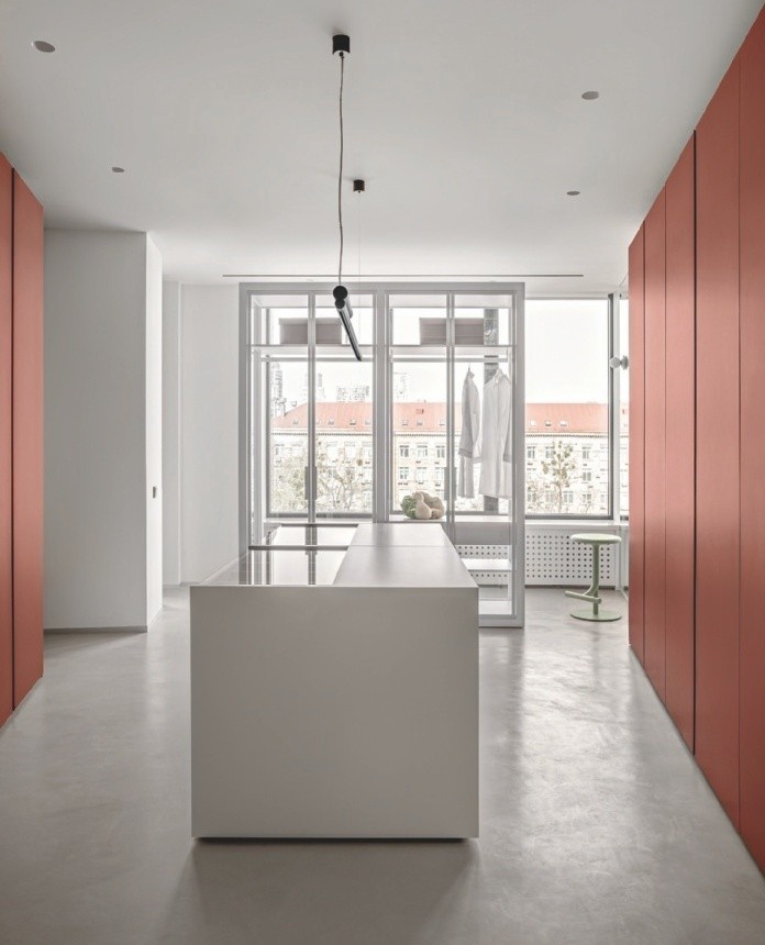 Концептуальность интерьера усиливают бетонные поверхности стен и потолка, покрытые лессировочным полупрозрачным лаком, и пол из микроцемента. На этом брутальном фоне особенно эффектно смотрится дизайнерская мебель. «К счастью, хозяева согласились на все наши рекомендации в отношении подбора знаковых вещей, которые привносят динамику в облик пространства, — продолжает Рина. —Несмотря на строгие формы и минимум предметов обстановки, интерьер получился уютным благодаря цветовым акцентам. Палитру задаёт живописное полотно на стене у обеденного стола, цвета которого перекликаются со встроенными шкафами на кухне и терракотовой плиткой Mutina, покрывающей столешницу острова. Картину дополняют голубой барный стол Mushroom Table собственного производства, книжный стеллаж того же оттенка, полосатый ковёр Vandra Rugs и красное культовое кресло UP5 по дизайну Гаэтано Пеше».