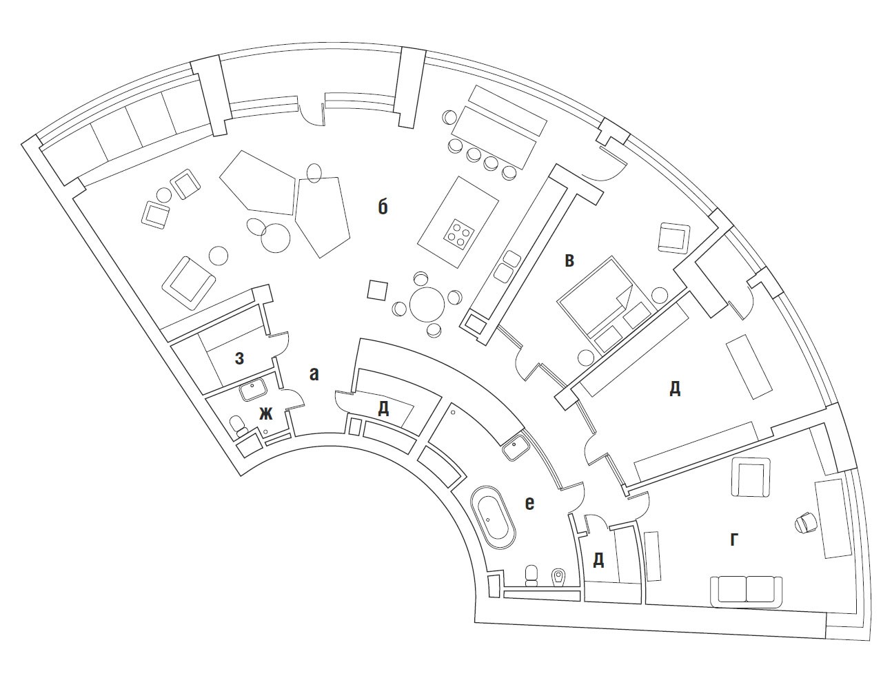 Отличительная черта квартиры в новом жилом комплексе в центре Киева — радиальные стены. Нестандартная форма пространства создавала определённые сложности в проектировании, что ещё больше подогревало профессиональный азарт архитектора. «Планировка — это база, фундамент любого пространства, — рассказывает Рина Ловко. — Если она не учитывает все потребности заказчика и в ней некомфортно жить, никакая дизайнерская мебель и аксессуары не смогут этого исправить. Именно поэтому наша мастерская уделяет больше внимания именно организации пространства. Несмотря на то что общая площадь квартиры довольно большая — 207 квадратных метров, из-за сложной геометрии пространства стандартные приёмы не работали, но мы сделали всё, чтобы хозяевам было максимально комфортно». В плане квартира представляет собой часть круга, разделённого на секции. Несколько секций архитектор объединила, сформировав единое пространство гостиной–столовой–кухни–прихожей. В соседней секции сделала спальню, в которую ведут два входа — из коридора и из столовой зоны. Ещё одну секцию архитектор отвела под гардеробную комнату с зоной макияжа у окна, двумя шкафами, островным комодом и витринным шкафом, изготовленным по своим эскизам. Для увеличения освещённости тёмных зон было принято решение заменить часть стен на стеклянные перегородки со встроенными дверями, позволив дневному свету проникнуть в самые отдалённые уголки квартиры. За одной из таких перегородок Рина Ловко поместила в том числе хозяйский санузел.