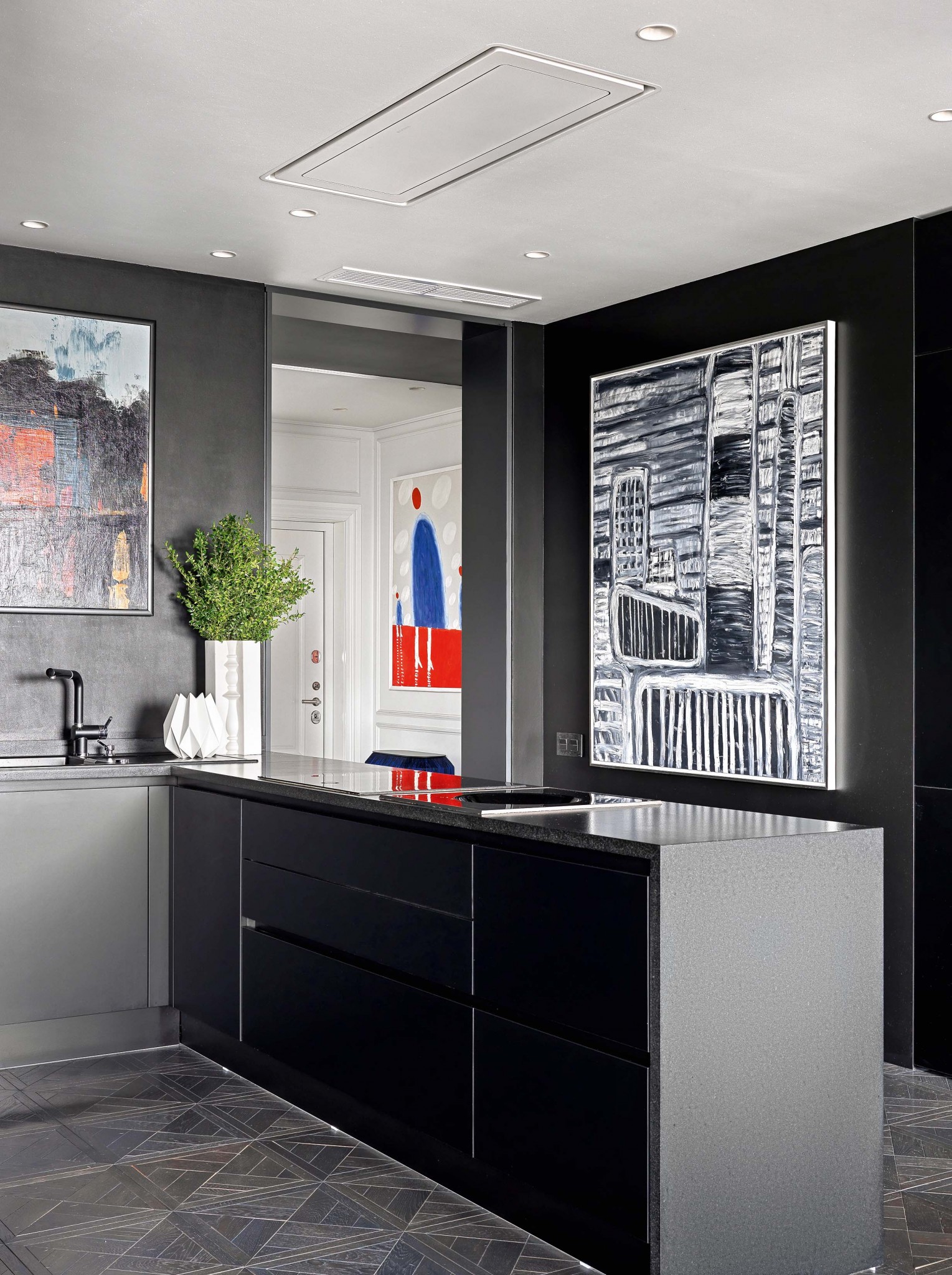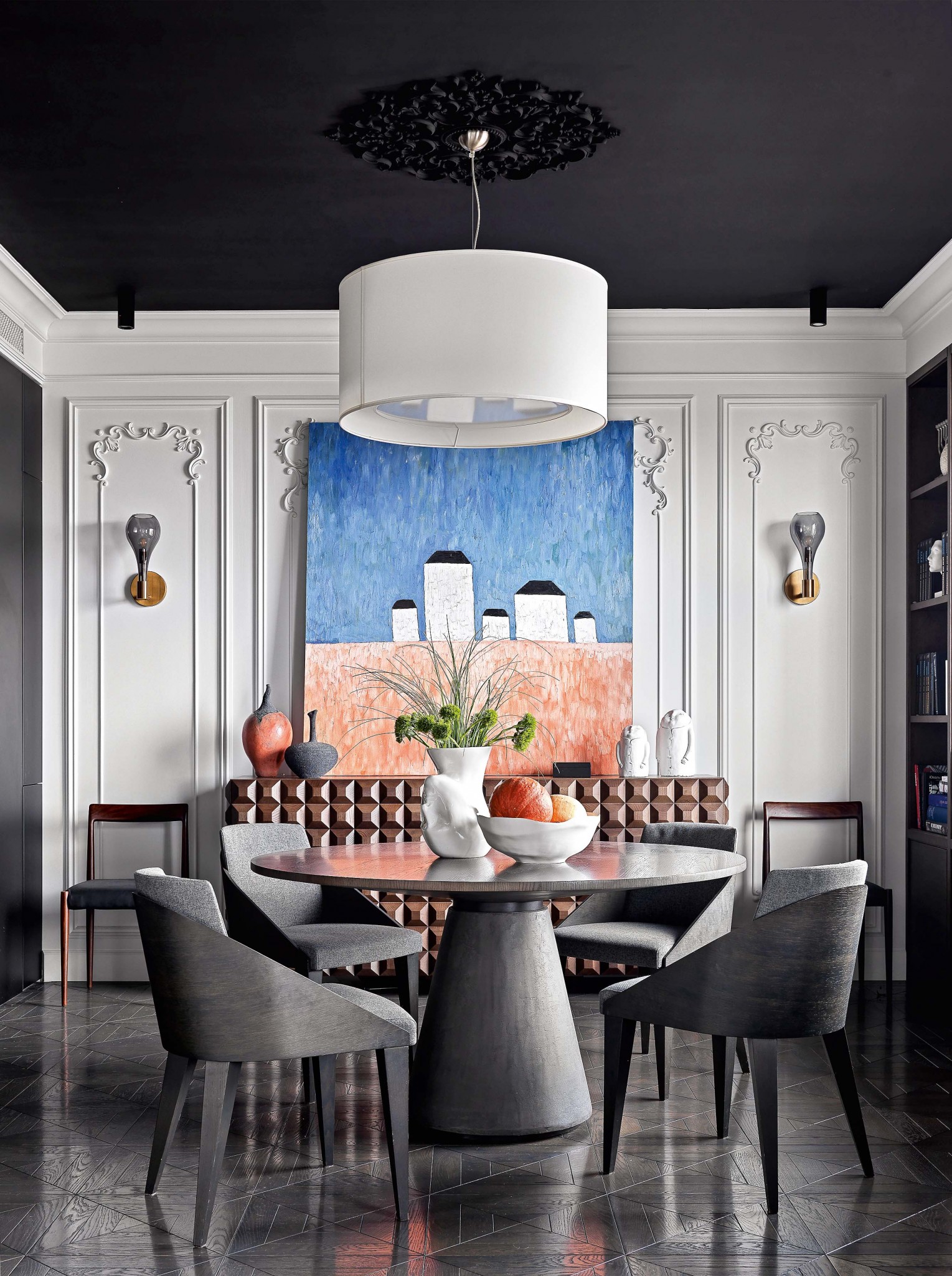 Яркие пятна картин, монохромная основа, рокайльные завитки на стенах. Мебель и современная, и винтажная, много интересных аксессуаров. В интерьере царит атмосфера элегантности и богемного шика... Эта квартира по духу напоминает одну из парижских квартир в старинном жилом фонде, однако и география у неё другая, и дом — современный. Находится она в Москве и принадлежит архитектору, автору проекта Александре Хелминской–Леонтьевой и её мужу. Неудивительно, что «автор» и «заказчик» на этом проекте нашли полное взаимопонимание.