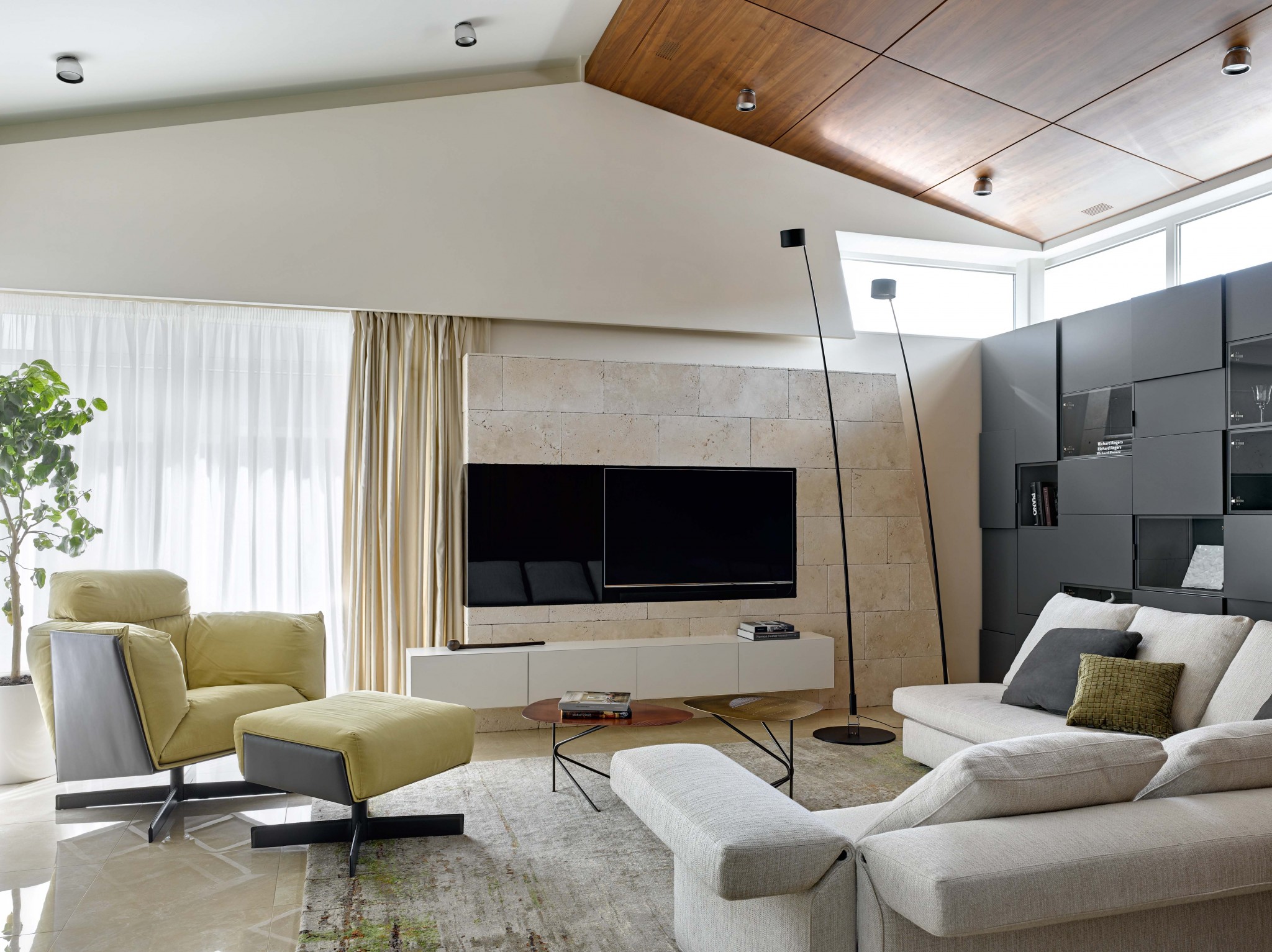При реализации проекта архитекторы старались избегать избитых приёмов и растиражированных предметов мебели. Например, диван в гостиную подбирали очень долго: он виден с многих ракурсов, поэтому хотелось, чтобы он выглядел легко и красиво со всех сторон. В итоге остановились на модели Collar от фабрики Minotti. Потолочные панели из американского ореха выполнены на заказ. Журнальные столики, De Сastelli. Торшеры, Davide Groppi. Ковёр, дизайнер Ян Кат, Kovёr Büro