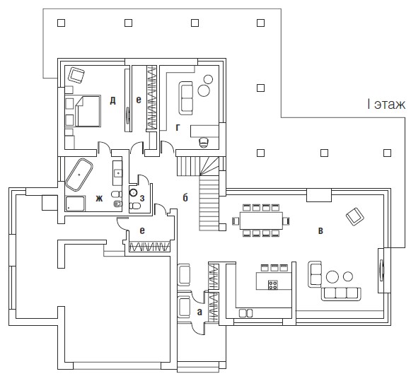 I этаж:  а) прихожая; б) холл; в) гостиная– кухня–столовая; г) кабинет; д) спальня; е) гардеробные; ж) ванная комната; з) гостевой санузел.