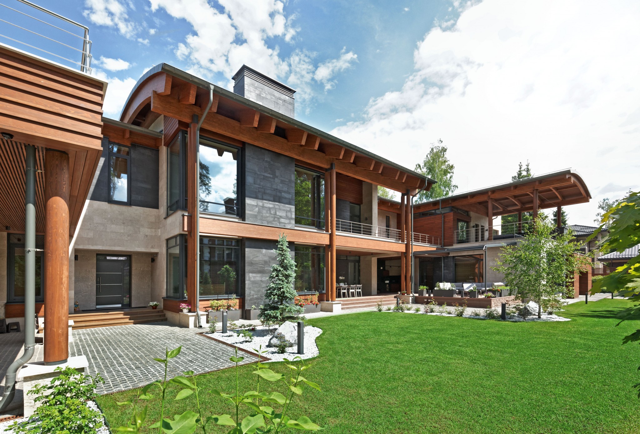 Главной задачей Романа Леонидова и Елены Волгиной было максимально освоить территорию, так чтобы дом стал центром композиции. С чем архитекторы отлично справились: протяжённое здание, состоящее из нескольких объёмов, вольготно раскинулось на участке, образуя закрытый внутренний двор. Мощная радиусная кровля из гигантских клеёных балок, простые геометрические формы, брутальная отделка натуральным деревом и сланцем, опоры в виде брёвен, панорамное остекление сделали дом выразительным и неповторимым. «Вытянутая распластанная форма дома позволила нам создать многофункциональный объём, в котором нашлось место для всех требуемых помещений — от технических и подсобных до разнообразных зон отдыха, включающих даже такую, как профессионально оборудованный музыкальный зал с собственной сценой, где можно проводить праздники и домашние концерты», — отмечает Роман. При разработке планировочного решения архитекторы придерживались традиционного для загородных домов зонирования. Весь первый этаж заняли помещения дневного пребывания. Главный вход из парковки под навесом ведёт в анфиладу перетекающих друг в друга помещений: просторная прихожая плавно переходит в двусветное пространство гостиной с камином, далее— в столовую с кухней. Следующий пункт движения — небольшая галерея, которая ведёт в блок бассейна с баней, тренажёрным залом и техническими помещениями. Зона отдыха и развлечений разместилась во втором крыле дома. Здесь находятся бильярдная с баром–винотекой, музыкальная комната со сценой и пультом звукорежиссёра, а также выход на террасу заднего двора и в сад с павильоном–барбекю. Второй этаж состоит из блока приватных помещений: