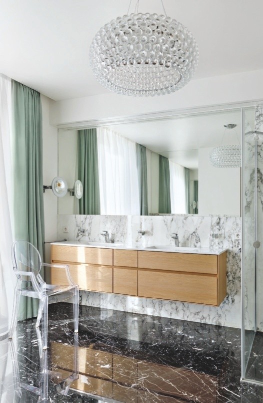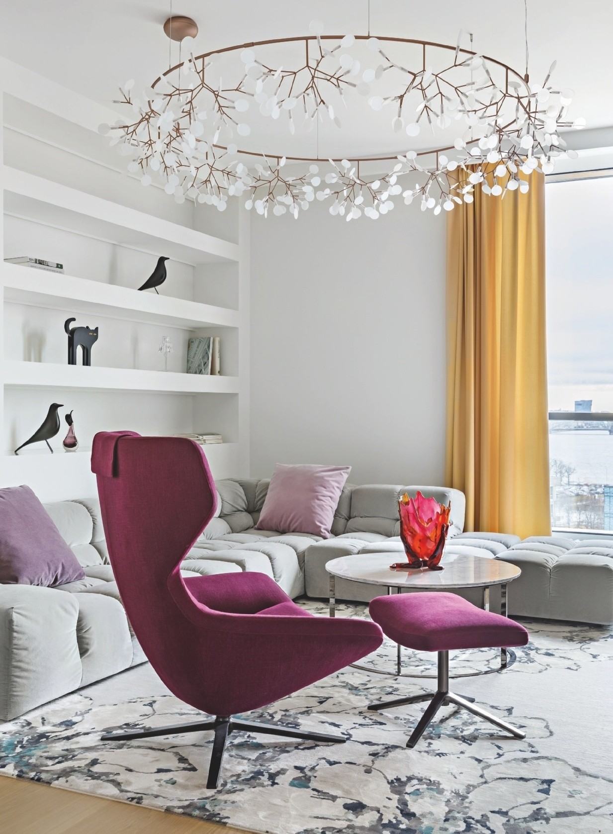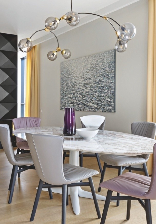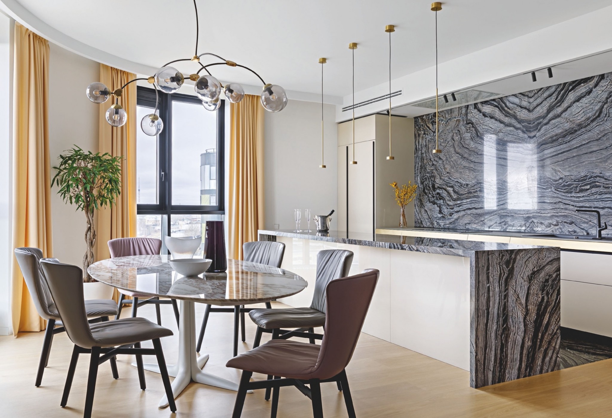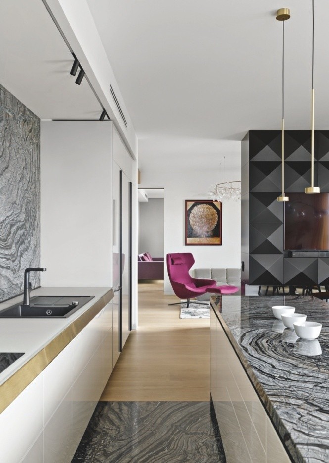 Современный по стилистике интерьер наполнен интересными деталями и предметами мебели. Для отделки Ирина использовала мрамор Silver Braun с эффектным природным рисунком. Им выложен пол на кухне и в прихожей, облицована столешница острова и из него изготовлен кухонный фартук. «Я старалась оформить квартиру в едином духе, не пестрить с отделочными материалами, несмотря на большую площадь — 220 квадратных метров, — комментирует архитектор. — Основа интерьера монохромная, построена на сочетании белого, оттенков серого и чёрного. Цвет появляется лишь в текстиле и мебели: это оттенки жёлтого, фиолетового, розового, цикламена. Важно было учесть просматриваемость помещений, открытость пространства. Поэтому, создавая интерьер, я использовала наиболее гармоничные сочетания цветов. Свою лепту вносит и живопись. У заказчиков прекрасная коллекция графики 1950-х годов — работы О. Верейского и В. Смирнова. Её мы разместили в кабинете. Также мы купили две картины в гостиную от Евгения Зарембы и Александра Герасимова и украсили интерьер фотографиями сына заказчиков, увлекающегося подводной съёмкой».