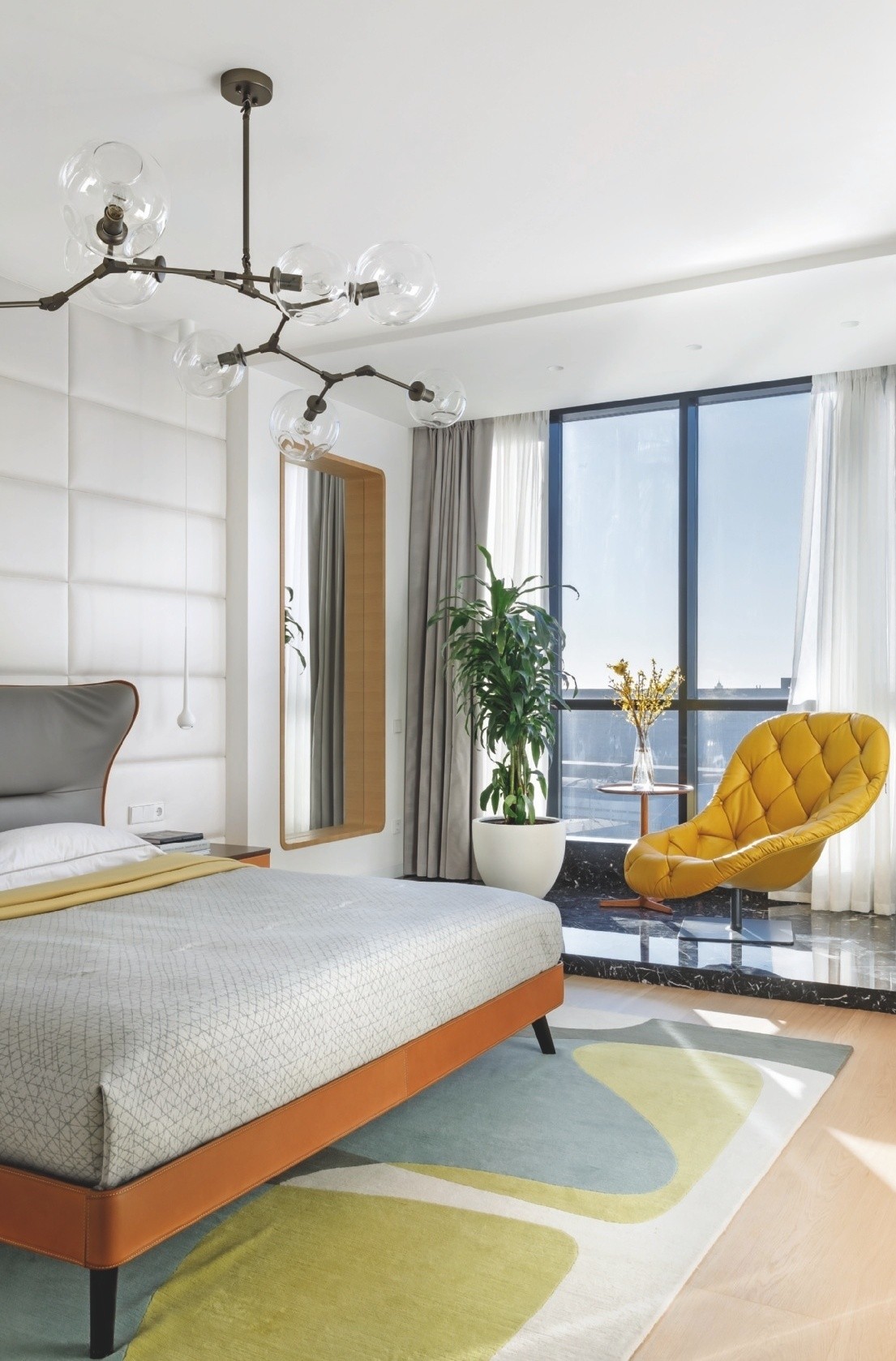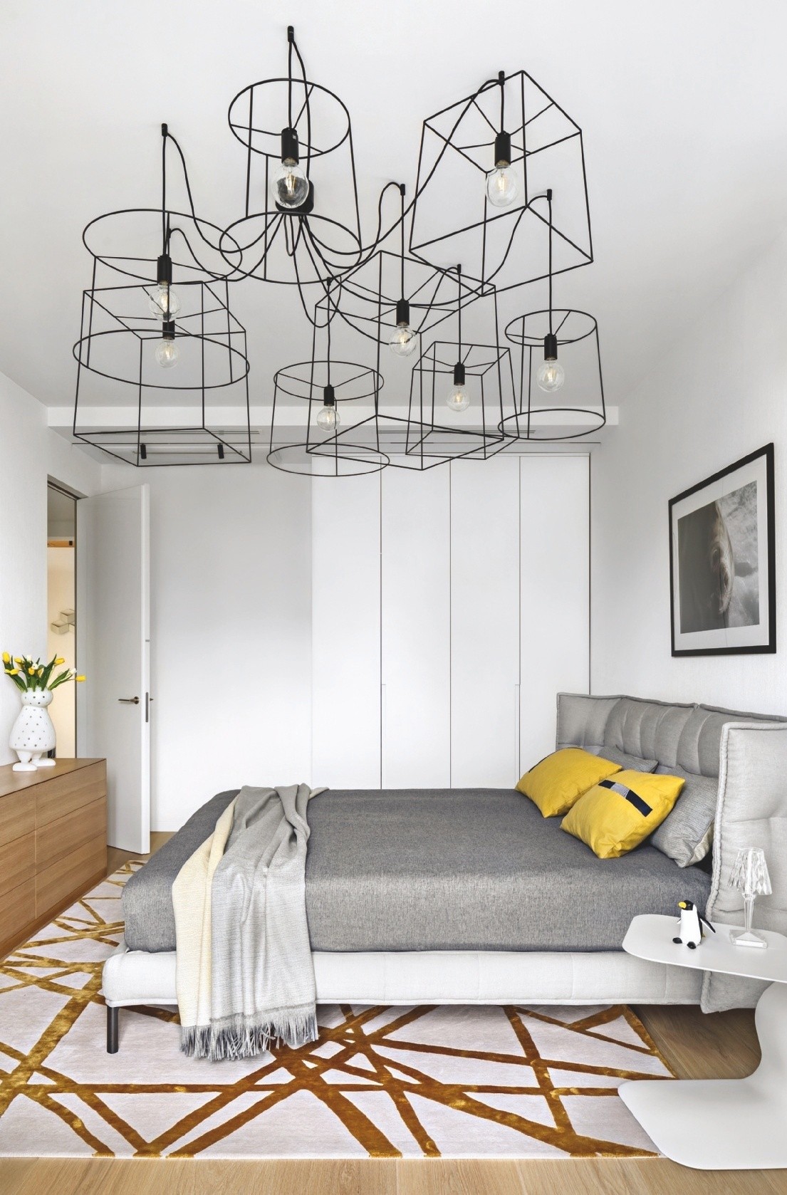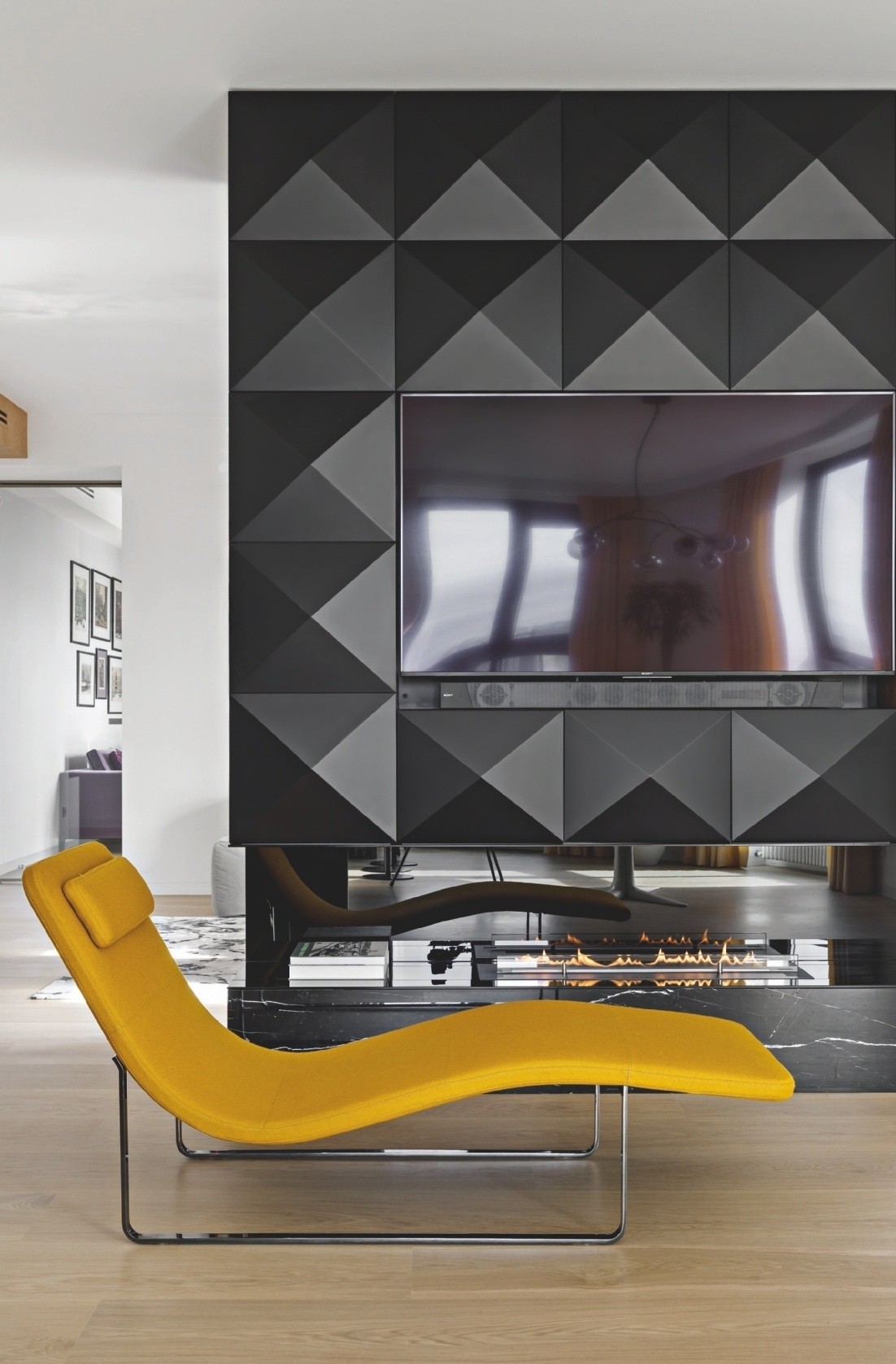 Современный по стилистике интерьер наполнен интересными деталями и предметами мебели. Для отделки Ирина использовала мрамор Silver Braun с эффектным природным рисунком. Им выложен пол на кухне и в прихожей, облицована столешница острова и из него изготовлен кухонный фартук. «Я старалась оформить квартиру в едином духе, не пестрить с отделочными материалами, несмотря на большую площадь — 220 квадратных метров, — комментирует архитектор. — Основа интерьера монохромная, построена на сочетании белого, оттенков серого и чёрного. Цвет появляется лишь в текстиле и мебели: это оттенки жёлтого, фиолетового, розового, цикламена. Важно было учесть просматриваемость помещений, открытость пространства. Поэтому, создавая интерьер, я использовала наиболее гармоничные сочетания цветов. Свою лепту вносит и живопись. У заказчиков прекрасная коллекция графики 1950-х годов — работы О. Верейского и В. Смирнова. Её мы разместили в кабинете. Также мы купили две картины в гостиную от Евгения Зарембы и Александра Герасимова и украсили интерьер фотографиями сына заказчиков, увлекающегося подводной съёмкой».