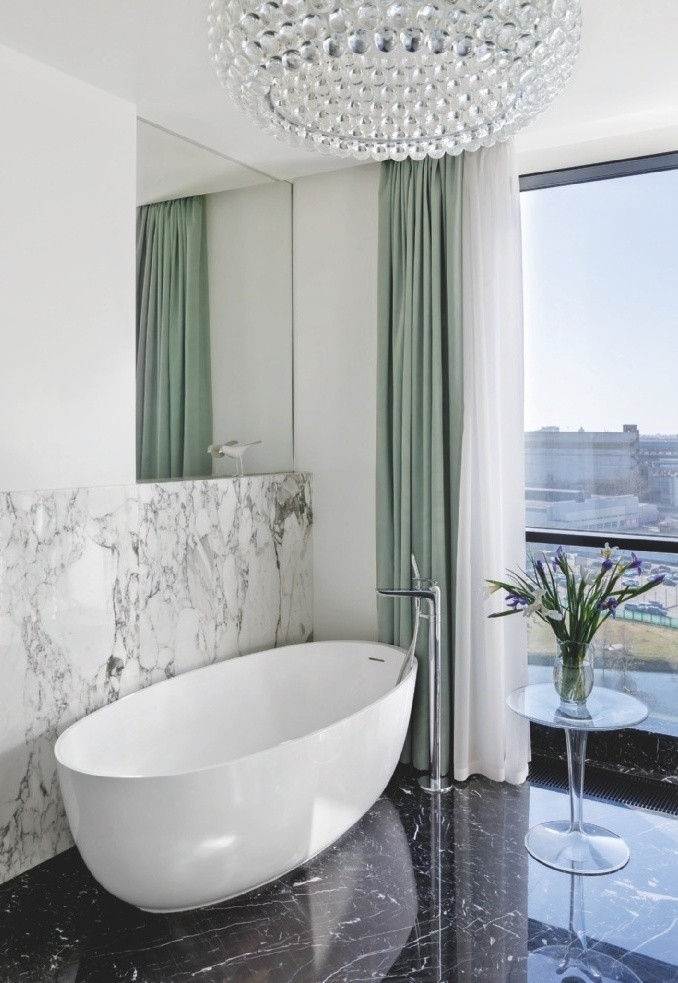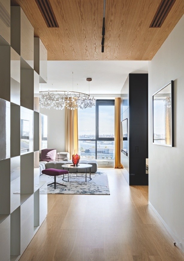 В доме с потрясающим видом на Неву, Смольный собор и мост Петра Великого архитектор Ирина Островская создала интерьер в современном стиле с такими же эффектными деталями