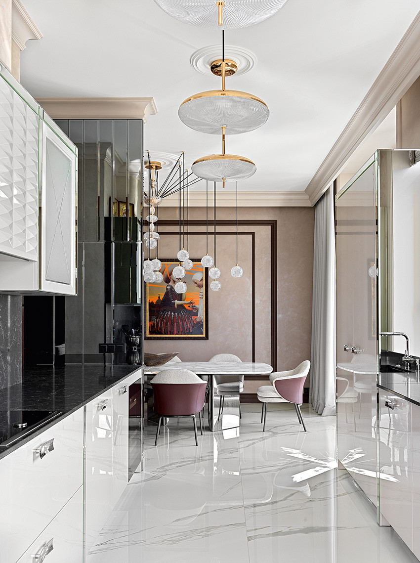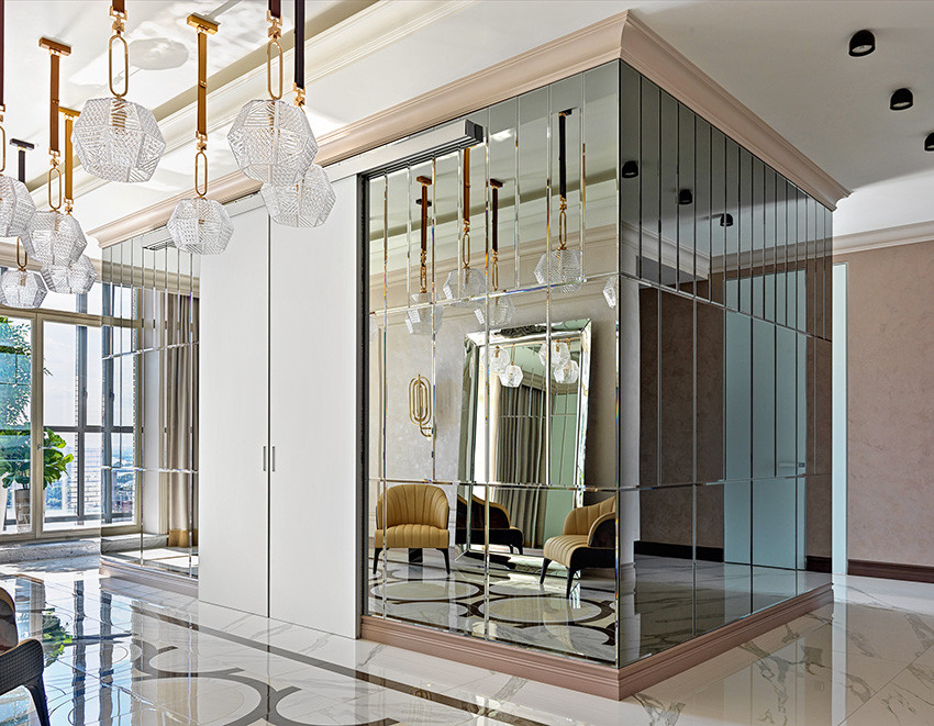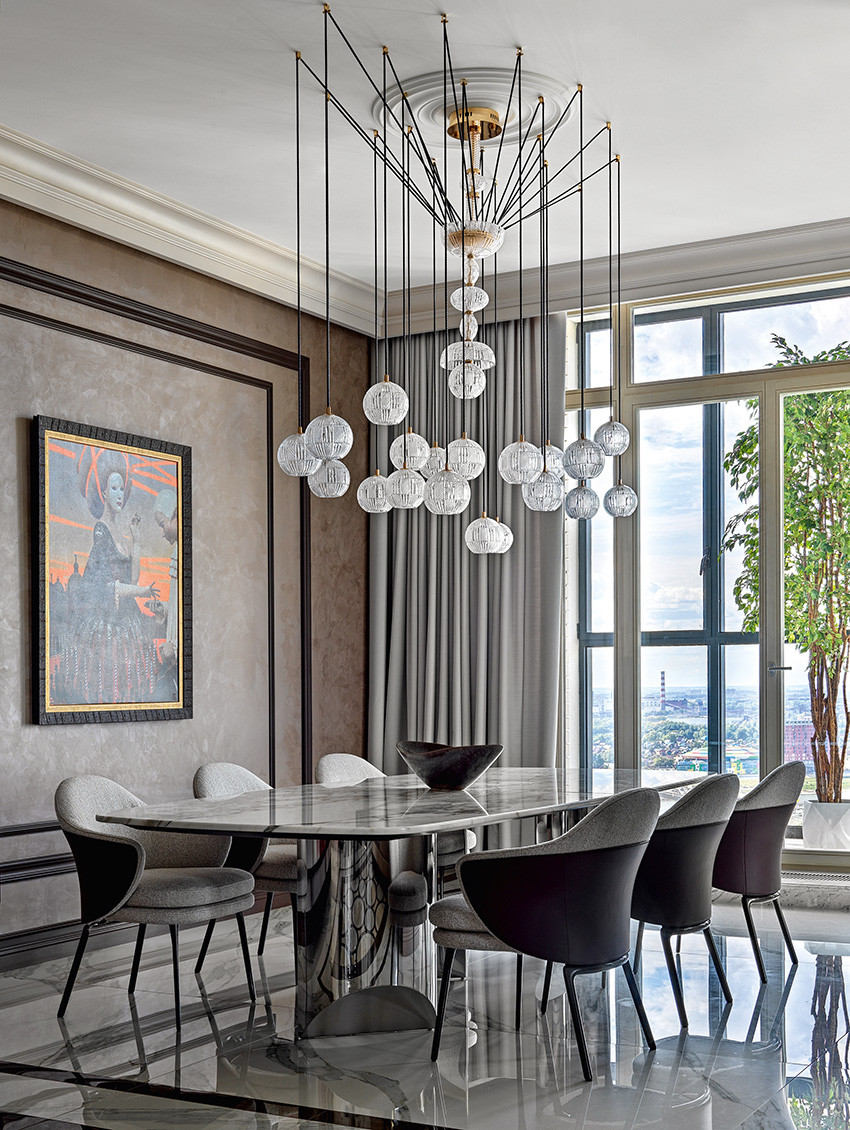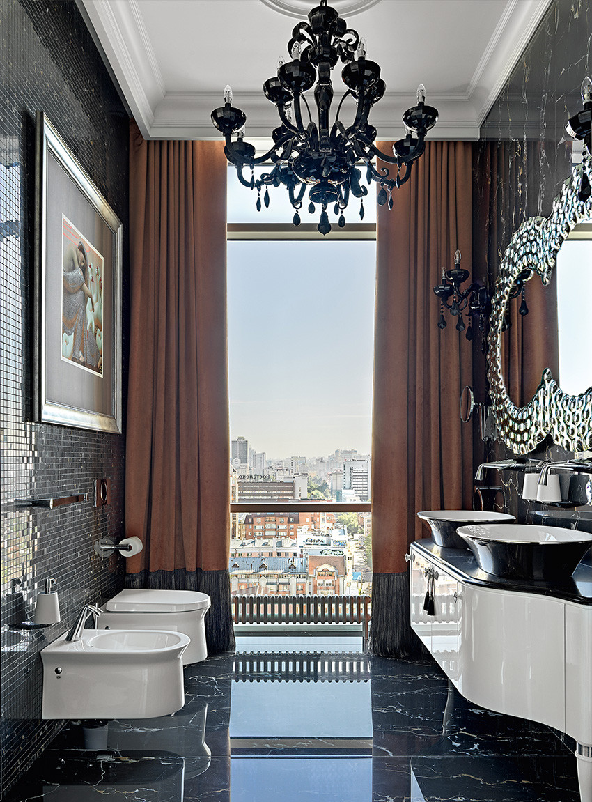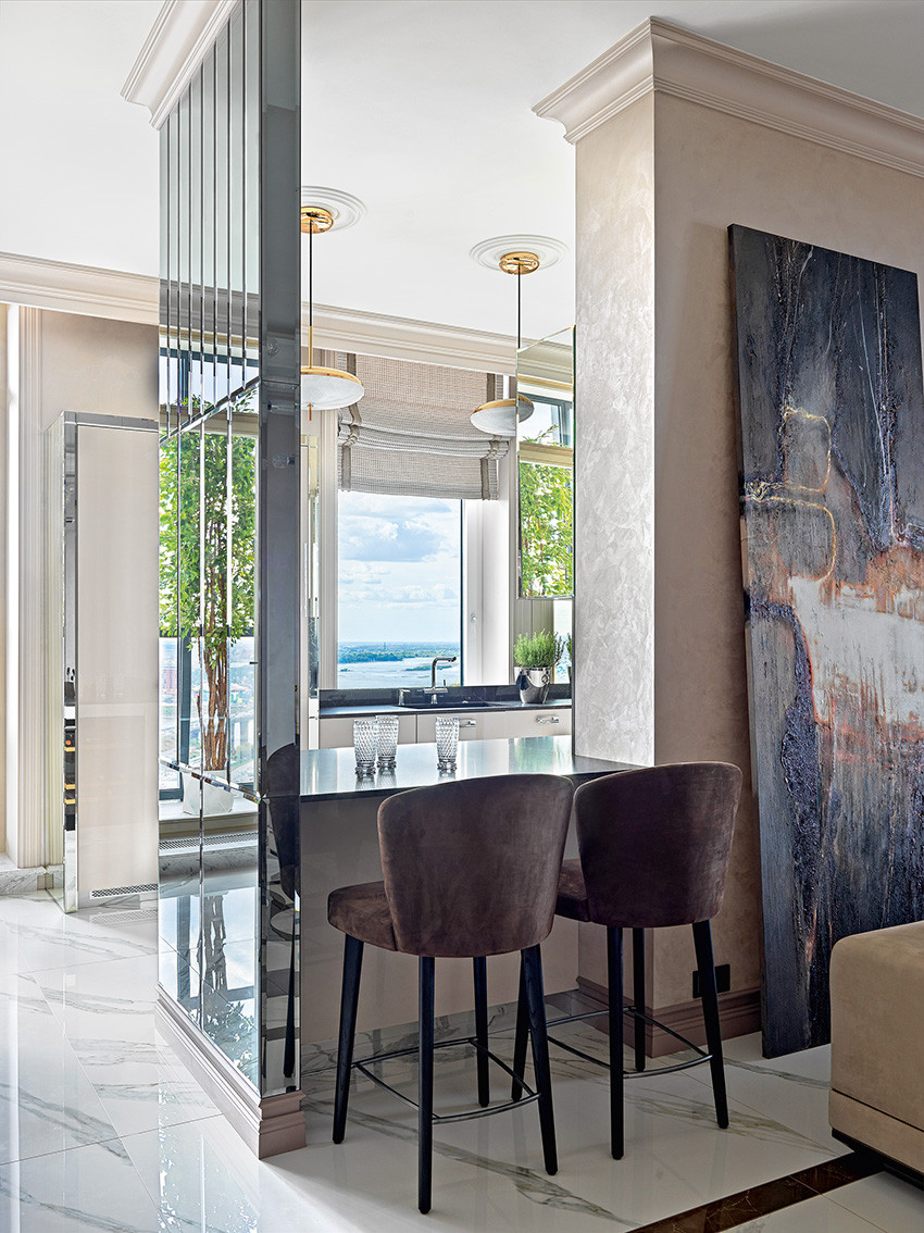 Огромную роль в формировании пространства и его восприятии играет высота потолков. Для размещения системы вентиляции, увлажнения и кондиционирования воздуха потолки немного понизили, но и после этого их высота составила 3,2 метра, которую дополнительно подчеркнули трёхметровыми дверями. Ещё одно достоинство пентхауса — большие площади остекления, создающие ощущение лёгкости, воздуха. Окна в пол оставили без тюля, чтобы хозяева могли наслаждаться видами города с высоты птичьего полёта. Для отделки полов в общественной, парадной зоне использовали полированный керамогранит, в нём особенно красиво отражается окружающая панорама. Из этих же соображений стены гардеробной, находящейся в самом центре холла, облицевали тонированным зеркалом со всех сторон (комната обходная), что также добавляет ощущение свободного пространства и усиливает отражающий эффект. «За пять лет знакомства и работы над этим объектом наши отношения переросли в дружеские, — вспоминает Мария. — Создавая интерьер, мы вместе с заказчиками побывали в Москве, а также посетили Италию, Испанию и Сингапур, выбирая мебель и аксессуары. Делали всё с любовью и особым вниманием к деталям. Непросто нам дались цветовые решения в гостевой и детской комнатах — поначалу владельцам было сложно воспринять их насыщенный тёмный цвет. Но мне удалось сломать их стереотипы, убедить мыслить шире. Так что во многом это был не просто процесс создания жилого пространства, это было создание нового образа жизни!»