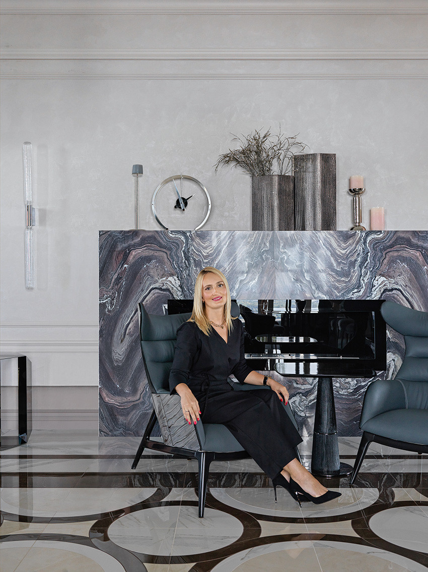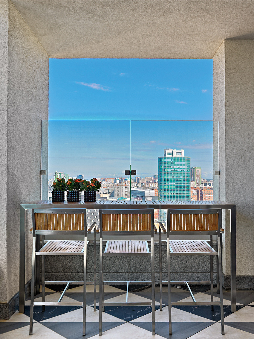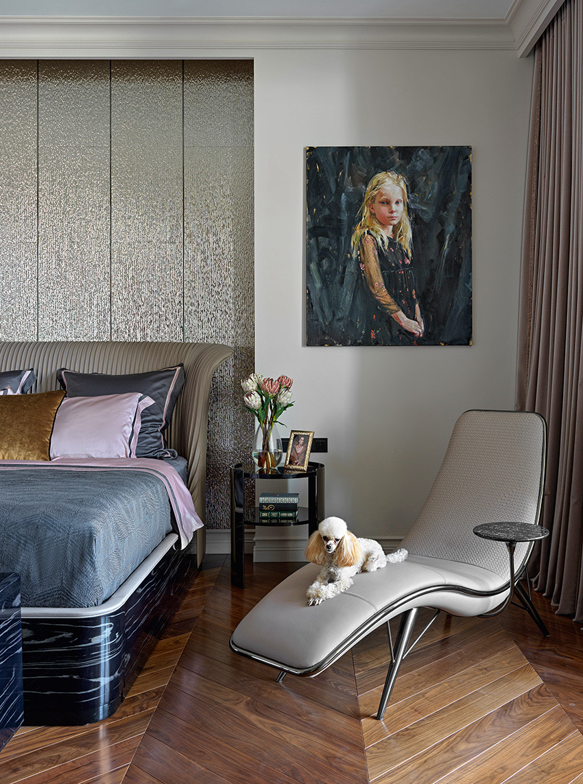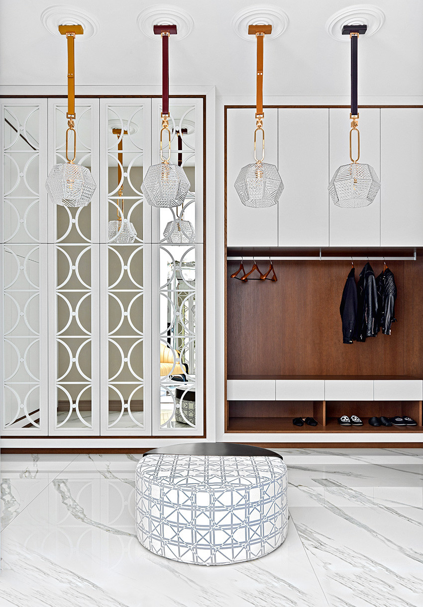 Огромную роль в формировании пространства и его восприятии играет высота потолков. Для размещения системы вентиляции, увлажнения и кондиционирования воздуха потолки немного понизили, но и после этого их высота составила 3,2 метра, которую дополнительно подчеркнули трёхметровыми дверями. Ещё одно достоинство пентхауса — большие площади остекления, создающие ощущение лёгкости, воздуха. Окна в пол оставили без тюля, чтобы хозяева могли наслаждаться видами города с высоты птичьего полёта. Для отделки полов в общественной, парадной зоне использовали полированный керамогранит, в нём особенно красиво отражается окружающая панорама. Из этих же соображений стены гардеробной, находящейся в самом центре холла, облицевали тонированным зеркалом со всех сторон (комната обходная), что также добавляет ощущение свободного пространства и усиливает отражающий эффект. «За пять лет знакомства и работы над этим объектом наши отношения переросли в дружеские, — вспоминает Мария. — Создавая интерьер, мы вместе с заказчиками побывали в Москве, а также посетили Италию, Испанию и Сингапур, выбирая мебель и аксессуары. Делали всё с любовью и особым вниманием к деталям. Непросто нам дались цветовые решения в гостевой и детской комнатах — поначалу владельцам было сложно воспринять их насыщенный тёмный цвет. Но мне удалось сломать их стереотипы, убедить мыслить шире. Так что во многом это был не просто процесс создания жилого пространства, это было создание нового образа жизни!»