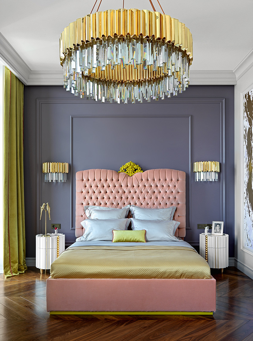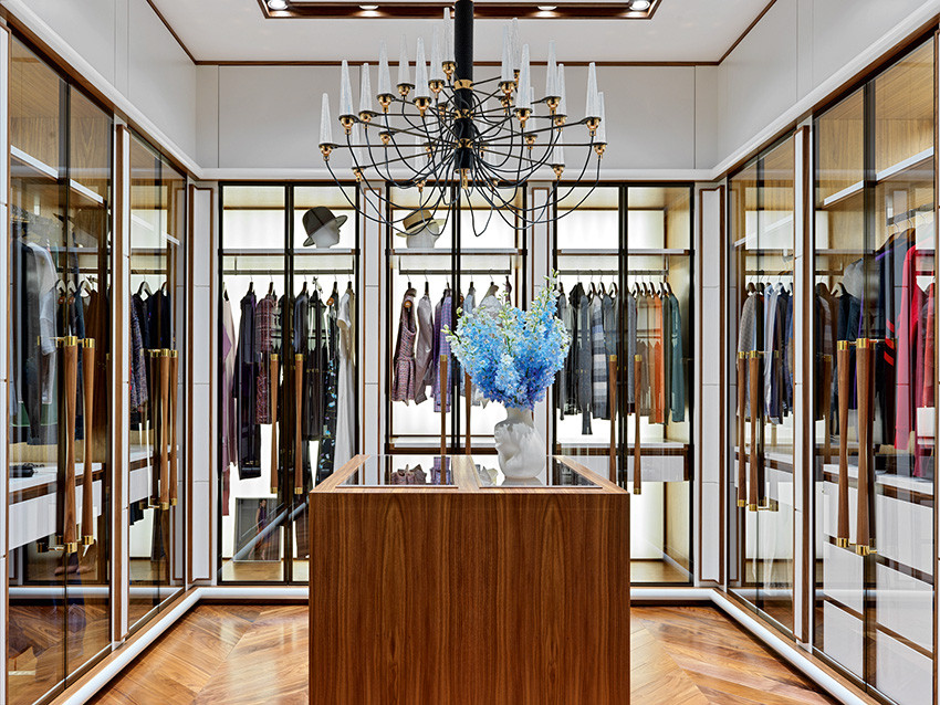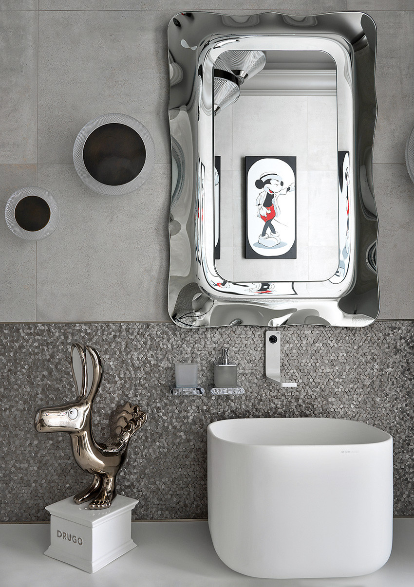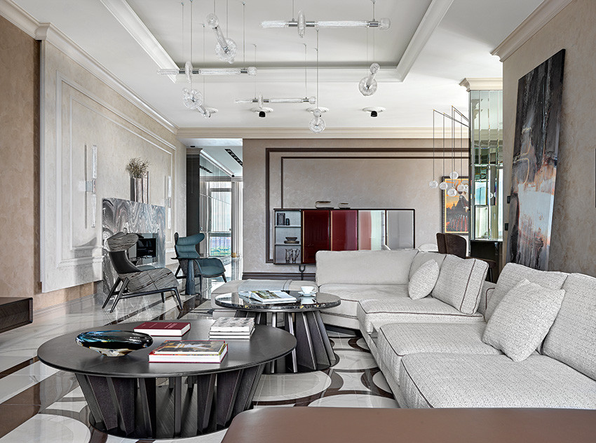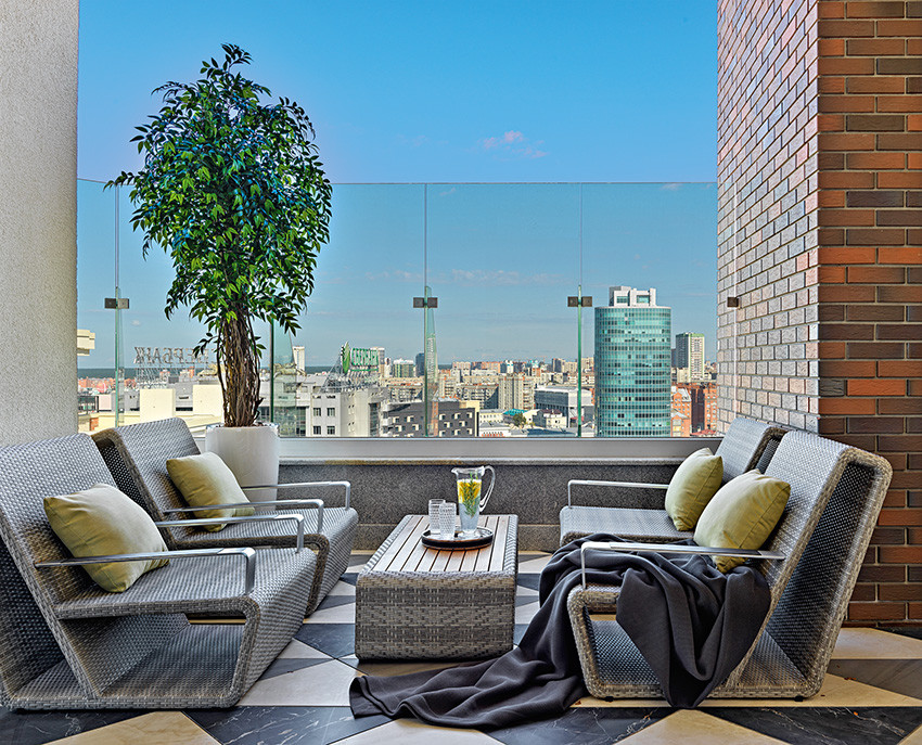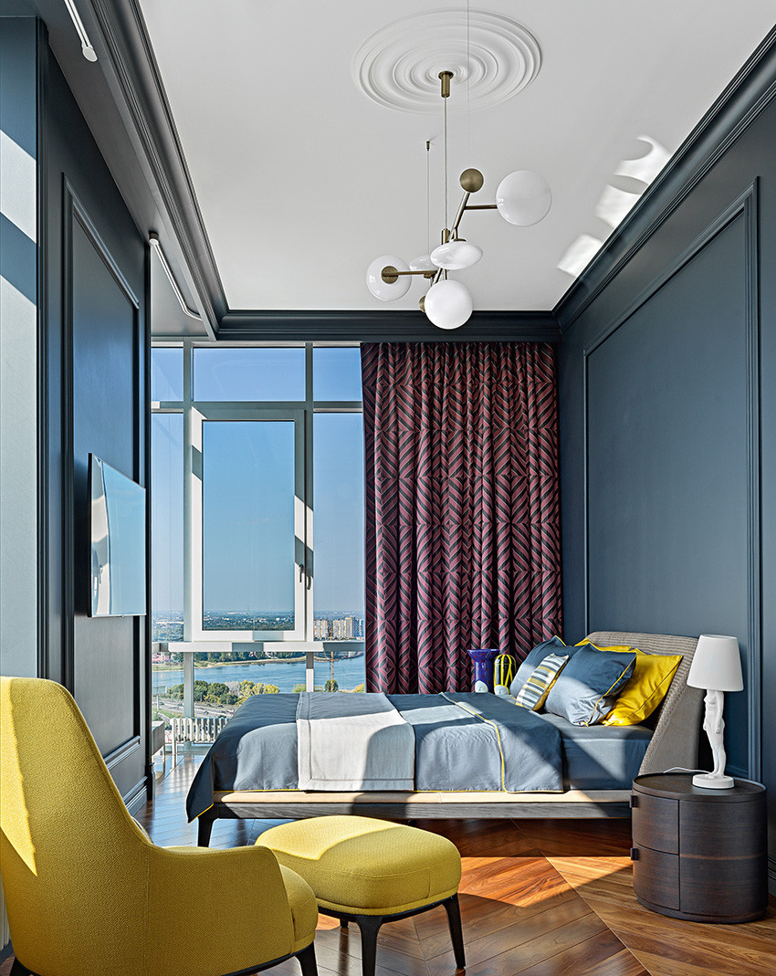 Огромную роль в формировании пространства и его восприятии играет высота потолков. Для размещения системы вентиляции, увлажнения и кондиционирования воздуха потолки немного понизили, но и после этого их высота составила 3,2 метра, которую дополнительно подчеркнули трёхметровыми дверями. Ещё одно достоинство пентхауса — большие площади остекления, создающие ощущение лёгкости, воздуха. Окна в пол оставили без тюля, чтобы хозяева могли наслаждаться видами города с высоты птичьего полёта. Для отделки полов в общественной, парадной зоне использовали полированный керамогранит, в нём особенно красиво отражается окружающая панорама. Из этих же соображений стены гардеробной, находящейся в самом центре холла, облицевали тонированным зеркалом со всех сторон (комната обходная), что также добавляет ощущение свободного пространства и усиливает отражающий эффект. «За пять лет знакомства и работы над этим объектом наши отношения переросли в дружеские, — вспоминает Мария. — Создавая интерьер, мы вместе с заказчиками побывали в Москве, а также посетили Италию, Испанию и Сингапур, выбирая мебель и аксессуары. Делали всё с любовью и особым вниманием к деталям. Непросто нам дались цветовые решения в гостевой и детской комнатах — поначалу владельцам было сложно воспринять их насыщенный тёмный цвет. Но мне удалось сломать их стереотипы, убедить мыслить шире. Так что во многом это был не просто процесс создания жилого пространства, это было создание нового образа жизни!»