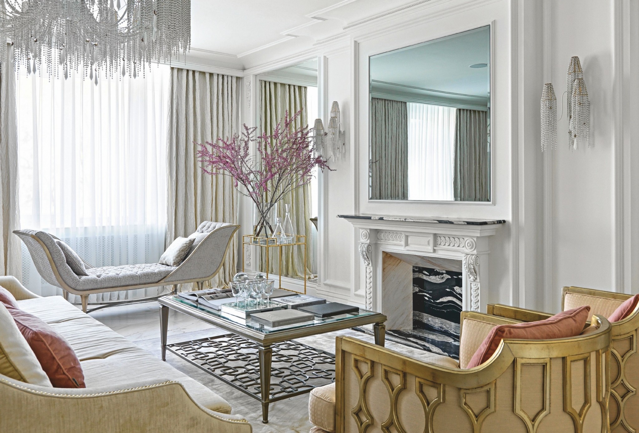 Первое, с чего всегда начинают дизайнеры, — это работа с планировкой. Это тот функционал, та база, от которой они отталкиваются. Без хорошей основы интерьер не состоится, убеждены авторы проекта. Г-образное пространство предопределило планировочную структуру. В удалённой от прихожей части оборудовали спальни. Гостиную, столовую и кухню объединили в одно пространство, организовав его по классическому принципу анфилады: камин, диван, обеденный стол, остров и кухня расположены строго по оси. Чтобы помещение стало ещё более симметричным, по бокам от широкого проёма, отделяющего гостиную от зоны кухни–столовой, на фоне зеркальных стен дизайнеры установили изящные витрины. Зеркала обрамляют и проход на кухню, скрывают встроенные шкафы в прихожей и телевизионную плазму над камином. «Одной из серьёзных проблем квартиры был длинный, узкий и тёмный коридор, — рассказывает Анна Шемуратова. — Чтобы наполнить его светом, мы активно использовали зеркала и прозрачные поверхности. Благодаря витражной двери в кабинет и зеркальным фасадам шкафов в коридор попадает естественный свет, коридор стал более светлым, воздушным. Зеркальные плоскости стен в гостиной визуально расширяют пространство, усложняют его восприятие, создают нарядную, парадную атмосферу». Чтобы усилить впечатление лёгкости, простора и света, поверхности оформили в белых тонах, придав им фактурность с помощью деликатного лепного декора — ажурных пилястр, молдингов и карнизов, которые служат своего рода рамой, обрамлением для выразительных и эффектных предметов интерьера. Равно как и лаконичная, максимально упрощённая потолочная розетка подчёркивает необычный, скульптурный дизайн люстры. Обращает на себя внимание и напольное покрытие. Для гостиной дизайнеры подобрали слэбы мрамора в сложной, нюансной гамме. Присутствующие в камне розовые оттенки поддержаны текстилем. Бархат пудрово–розового цвета на стульях в столовой