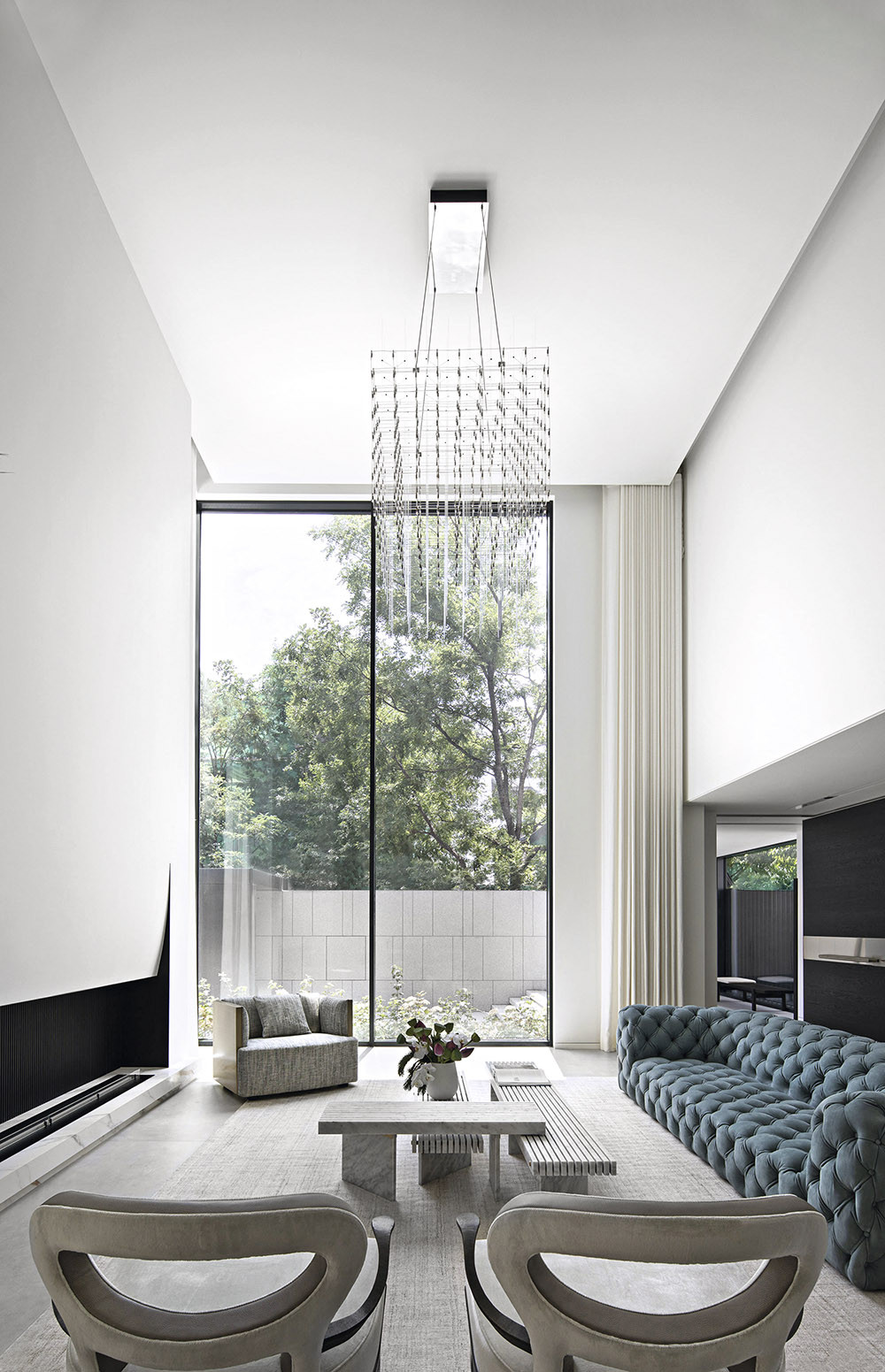 В китайской культуре достижение внутренней гармонии играет не меньшее значение, чем в японской. Мы привыкли ассоциировать путь дзен с японцами, но эта философия понятна всей Азии и даже, казалось бы, далекому от этого Китаю, где больше думают о повседневном и материальном. Многое, конечно, зависит от среды, уровня образования и достатка. В случае с этим нерядовым проектом архитекторы из студии Zhang Ling Design во главе с ее создательницей, молодым китайским архитектором Джанг Линг, выпускницей Китайской школы искусств в Ханчжоу, работали для обеспеченной семьи, любящей и хорошо знающей традиции родной культуры. Медитативное переживание каждого момента стало отправной точкой для создания этого необычного интерьера, где есть место не только базовым помещениям, привычным для западных домов, но также, например, комнате для чайных церемоний и специальному помещению для традиционных трапез, с соответствующей архитектурой и наполнением. Дом связали с окружением, чтобы, ежедневно просыпаясь и отходя ко сну, хозяева видели за окном пелену зелени. Постройку проектировали вместе с участком, учитывая особенности рельефа и посадки. Так, один из самых выгодных ракурсов — у главного помещения дома, большой двухсветной гостиной. Она выступает в роли амфитеатра, а вид из панорамных окон оказывается словно бы на авансцене. Спальня, ванная комната на втором этаже — также с окнами в пол. Высокий этаж обеспечивает приватность. И благодаря высоте оказываешься на уровне кромок деревьев, такого зеленого импрессионистского полотна, закрывающего окна. Чтобы неба и зелени в интерьере было как можно больше, мансардные