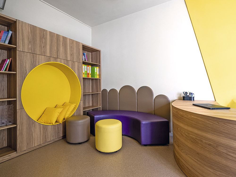 Здание садика «Феникс», расположенного на юге Москвы, обрело новый облик благодаря расширенной входной группе, более отвечающей веяниям современности и требованиям комфорта маленьких посетителей. Так, при входе появились удобные вещи в виде подсветок, парковки, специальных покрытий для ступеней, служащих для безопасности детей… Торец здания украсили баннером со стилизованным изображением города, старые клумбы переделали в газон и огород, построили новые веранды и игровые площадки. «Весь проект, от разработки концепции до реализации, мы выполнили в кратчайшие сроки, всего за полгода, — добавляет Екатерина Унгарова. — Ремонт проходил в работающем детском саду. Команда постаралась максимально вписаться в режим заведения, чтобы не мешать его работе. Была проведена подробная реконструкция территории: сделан детский городок, горки, домики– соты». Но главные преобразования претерпели интерьеры.