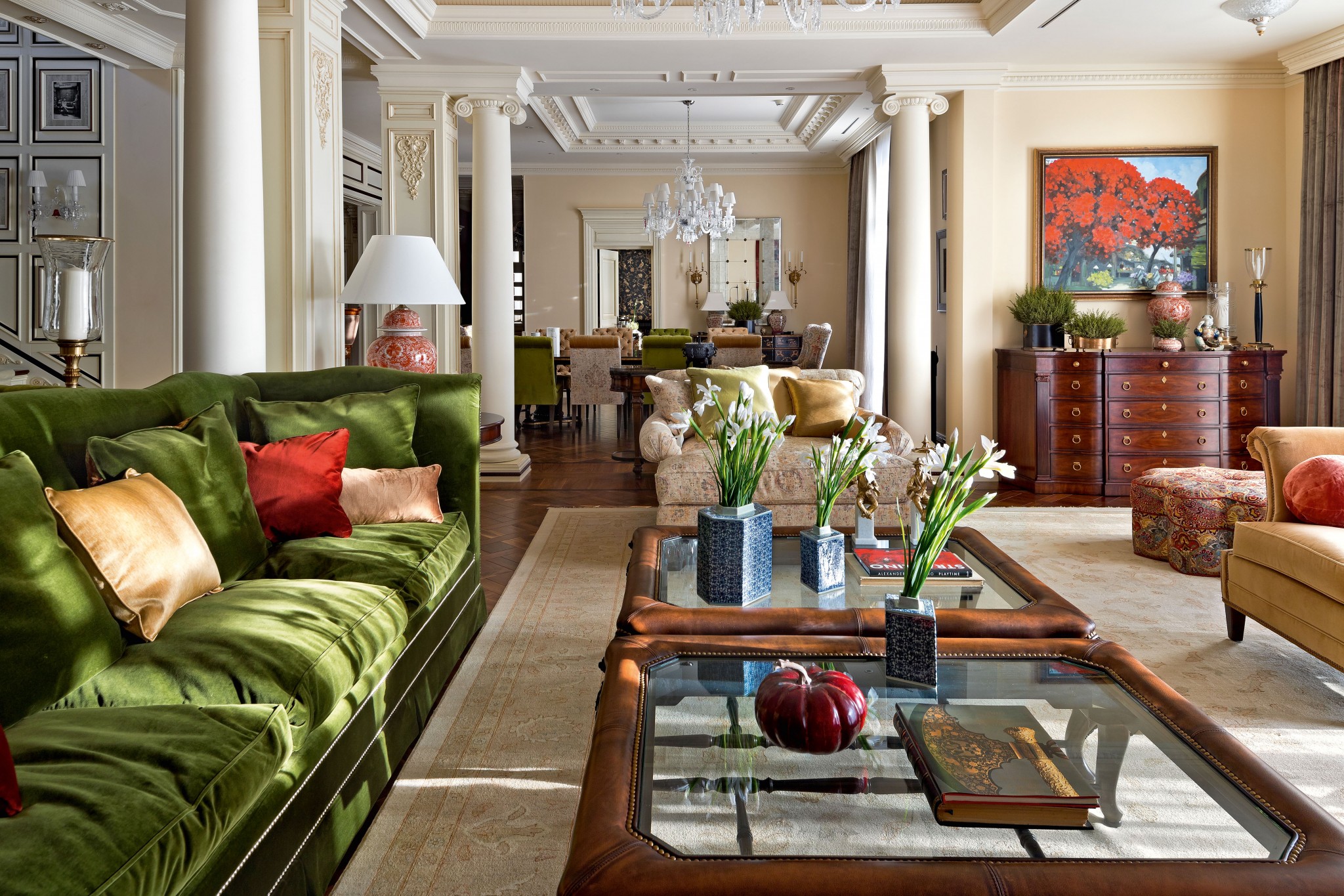 Атмосфера в гостиной мягкая, обволакивающая: диван с бархатной обивкой (Marge Carson), большой ковёр, столики со столешницами в кожаной окантовке (Lexington). Люстра, Charles Edwards