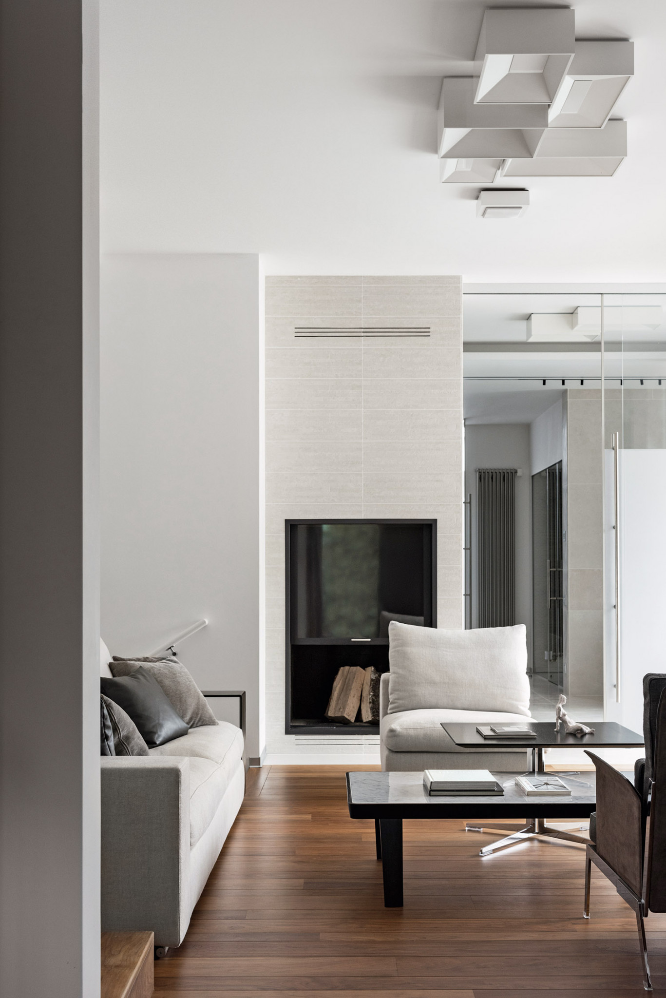 Владельцы дома пригласили Киру Голубеву на стадии планировочного решения и дизайна интерьера, когда дом уже был построен. Это не первый опыт сотрудничества дизайнера и молодой пары, поэтому работа проходила в полном взаимопонимании и доверии. С самого начала интерьер был задуман именно таким — светлым, минималистичным, рациональным и тёплым по ощущениям. «Для заказчиков особенно важными моментами была надёжность, функциональность пространства, где можно эмоционально расслабиться, забыв о суете большого города», — поясняет автор проекта. Атмосфере отдыха и релакса способствует архитектурное решение — большей своей частью дом обращён на лесной массив и имеет большой объём панорамного остекления. Одной из главных задач для Киры стала интеграция архитектуры во внутреннее пространство, усиление связи интерьера с окружающей природой, что прослеживается в конструктивных особенностях и художественных приёмах оформления. В частности, одна из стен гостиной представляет собой сплошное остекление с выходом на прилегающую террасу с отделкой из керамогранита. Этот же материал дизайнер применила внутри дома: в прихожей, в гостевом санузле и в зоне бассейна, граничащей с гостиной. Вообще в интерьере использовано большое количество природных материалов: дерево, мрамор, керамика, натуральные ткани. Но главный среди них — массивная доска из древесины американского ореха, ставшая визитной карточкой интерьера. Этим фактурным, тактильно приятным и тёплым по восприятию материалом с неоднородным и асимметричным рисунком отделаны пол, стены, потолок в ряде основных помещений. Чтобы