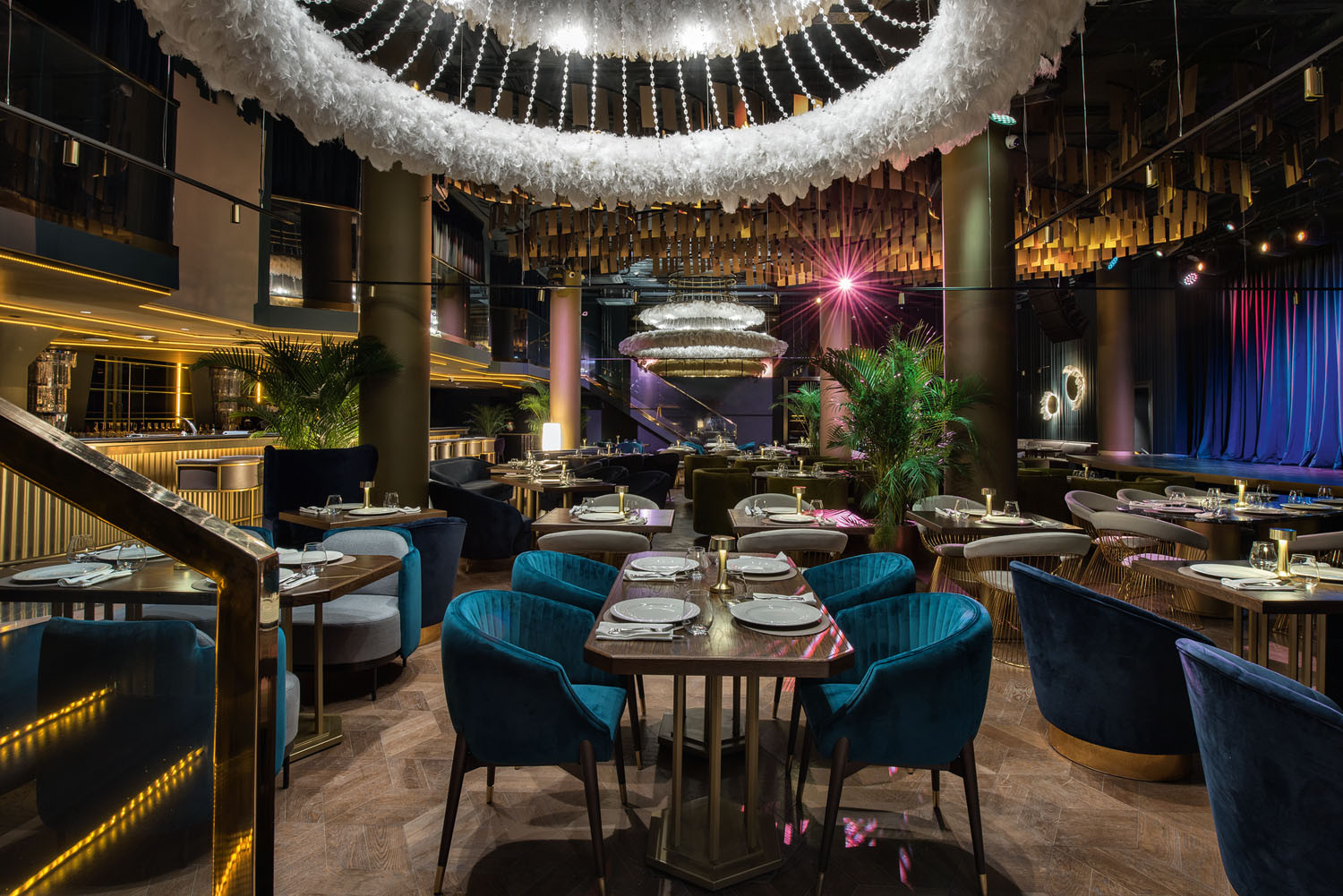 Первое, что видят посетители, — яркий и стильный фасад. Вход в клуб–ресторан Madison на Ленинградском проспекте предваряет светящаяся золотом вывеска, световое окно с позолоченной металлической сеткой, чёрный лакированный козырёк, украшенный сверху фигурами подсвеченных золотых барсов и массивная дверь с латунными деталями. «Мы хотели создать ресторан с эффектной театральной обстановкой, — отмечает руководитель бюро Archpoint Валерий Лизунов.—Для этой роли как нельзя лучше подошёл «стиль Гэтсби» — ар–деко, напоминающий о безудержных 20‑х годах прошлого века в США, периоде шумных вечеринок, беспечности и веселья. После открытия многим гостям атмосфера ресторана напомнила «гламурные 2000‑е», когда в интерьер старались добавить побольше пафоса». Внутри накал шика и блеска нарастает. Из большого атмосферного холла второго этажа можно попасть как в клуб, так и в ресторан. Здесь же расположена и открытая кухня, оформленная металлизированными панелями. Композиция из стеклянных трубок разной длины на подвесном потолке вместе с контрастным чёрно–белым полом создают богатую театральную атмосферу. Это ощущение усиливает глубокий зелёный цвет стен, дополненный изумрудным бархатом дивана