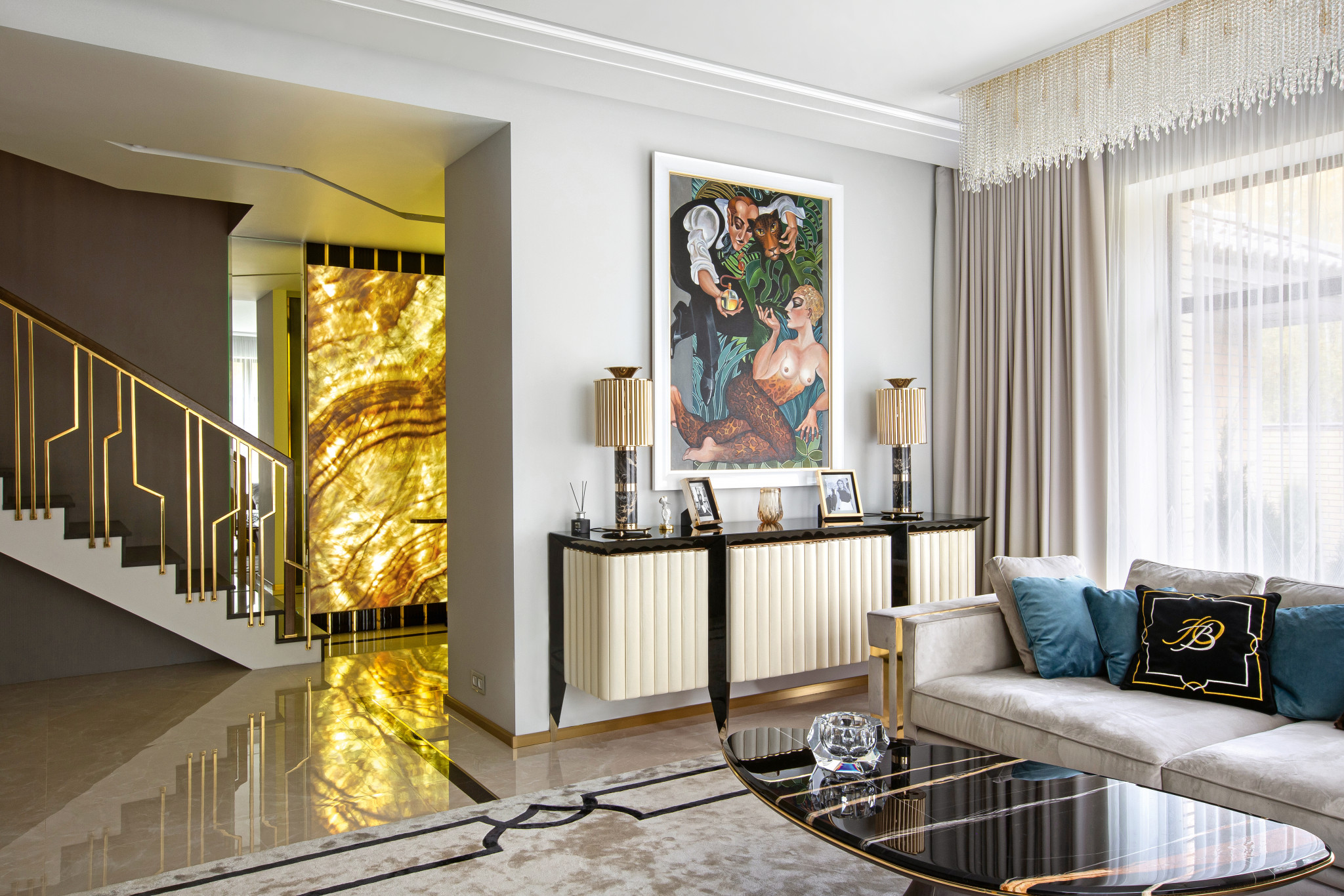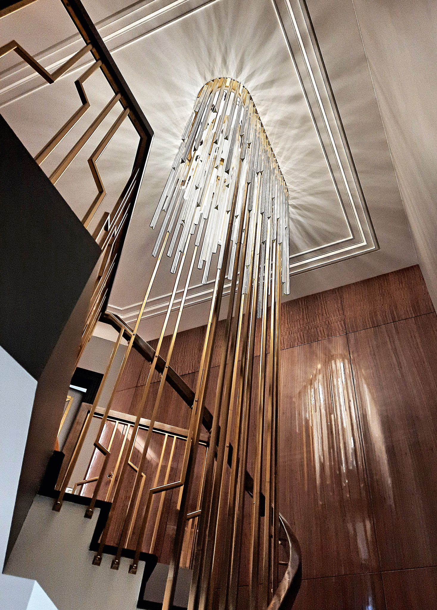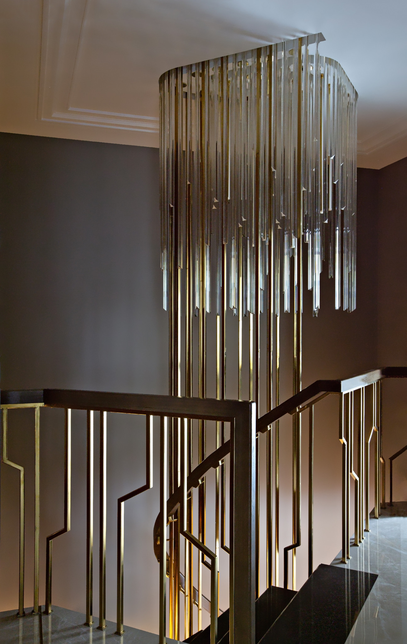 Предмет особой гордости дизайнеров—лестница, ограждение которой берёт начало… из люстры. Эта необычная концептуальная идея появилась не сразу, ей предшествовали долгие поиски и обсуждения. «Мы рады, что в жизнь воплотился именно этот вариант: люстра, «падающая дождём» на лестницу и являющаяся одним целым с ней. Реализовать замысел было непросто — над конструкцией работало несколько компаний–подрядчиков. Но получилось именно так, как было задумано», — комментирует Мария. В интерьере вообще много элементов, выполненных по индивидуальному проекту. Это не только мебель в спальне, гардеробной, ванной комнате и на кухне, но и двери, и хрустальные люстры, и отдельные декоративные элементы, такие как вставки из художественно обработанных стёкол, оттеняющие оникс, панели с покрытием soft–touch и др. «Эта работа — плод постоянных обсуждений с хозяйкой квартиры, которая в буквальном смысле заражала своей энергией, — добавляет Ксения. — Мы старались создать современный интерьер, вдохновлённый ар–деко, и, начав с более лаконичного образа, постепенно пришли к более роскошному: многие вещи стали ярче, выразительнее, появилось больше блеска, больше уникального, неповторимого шарма».