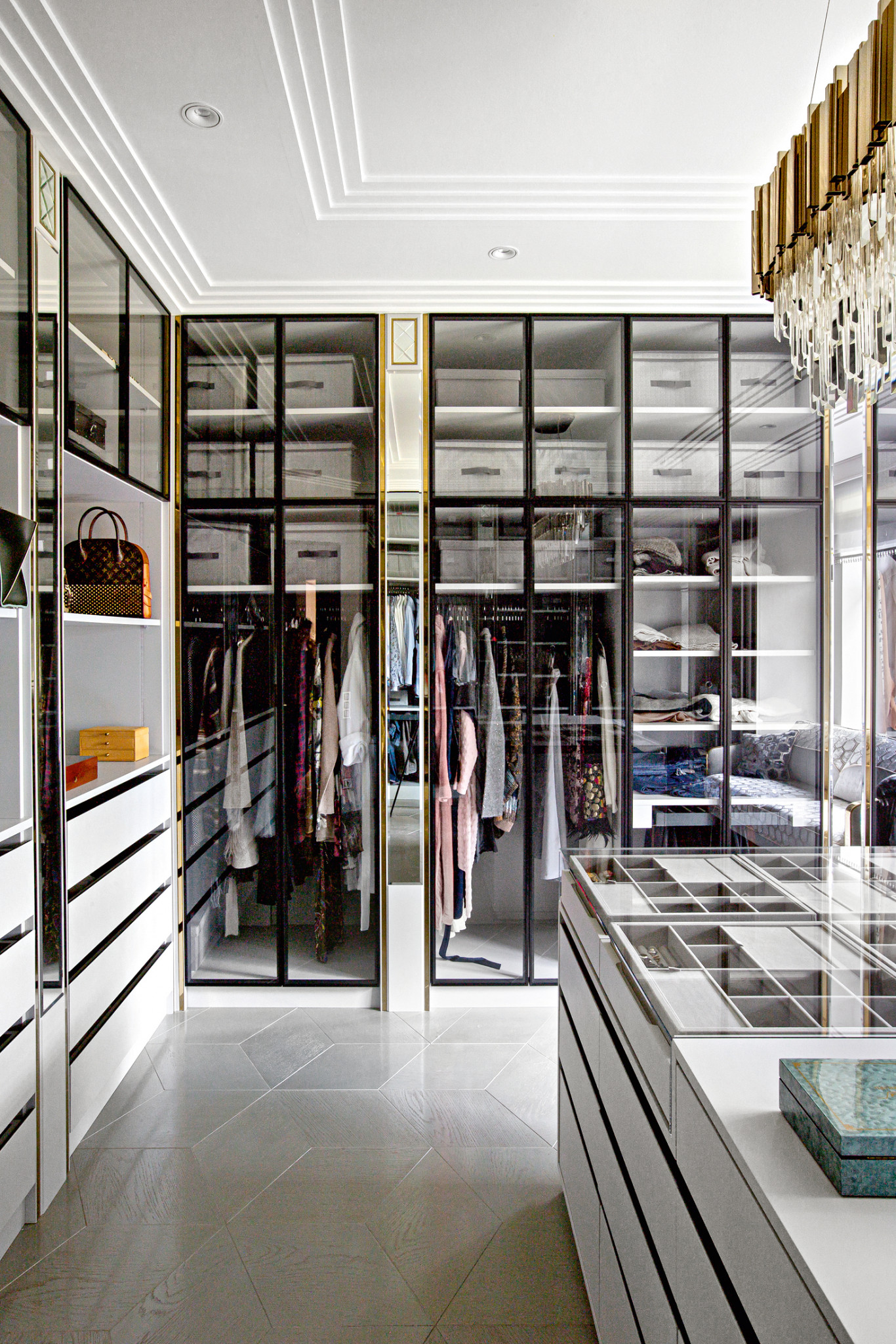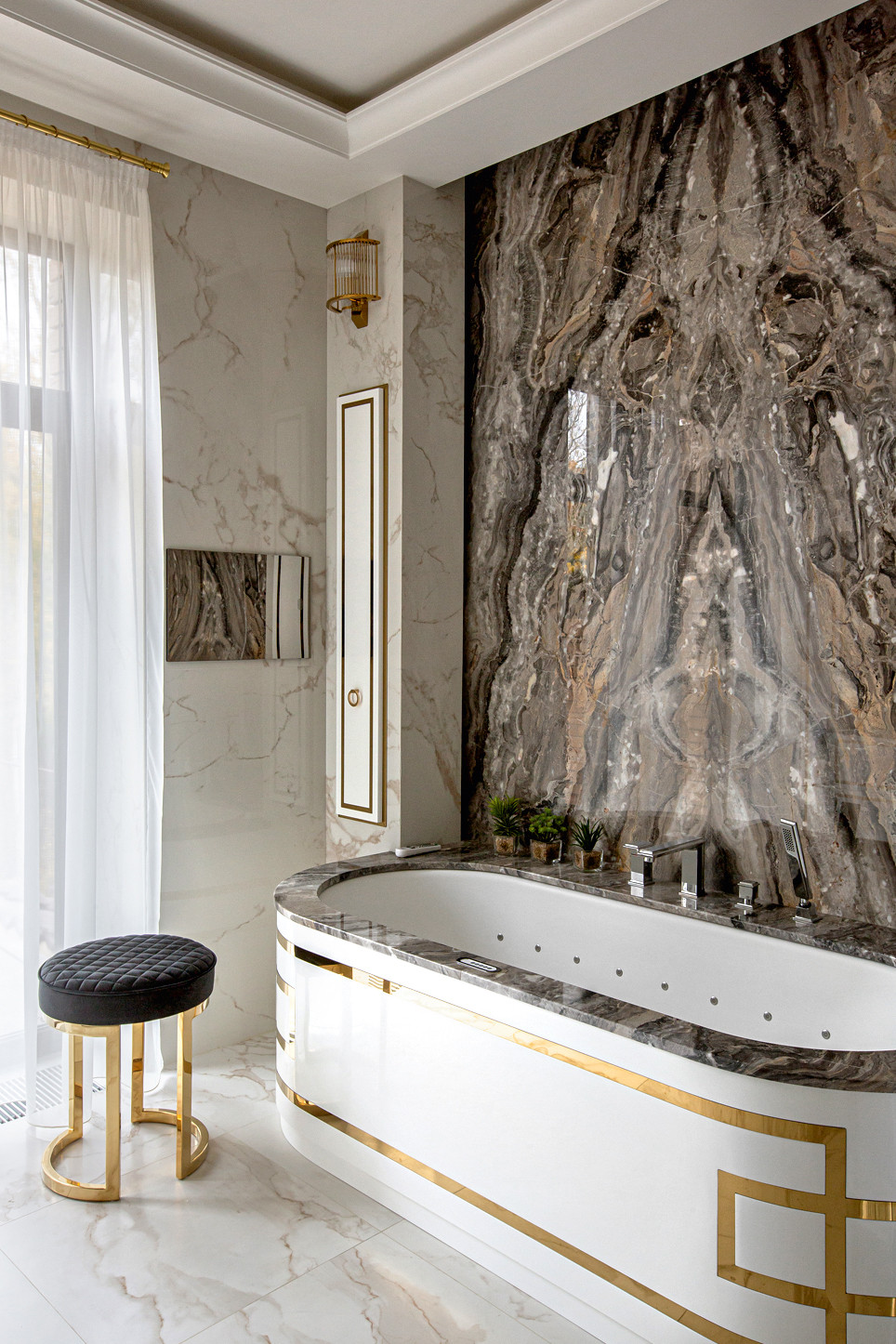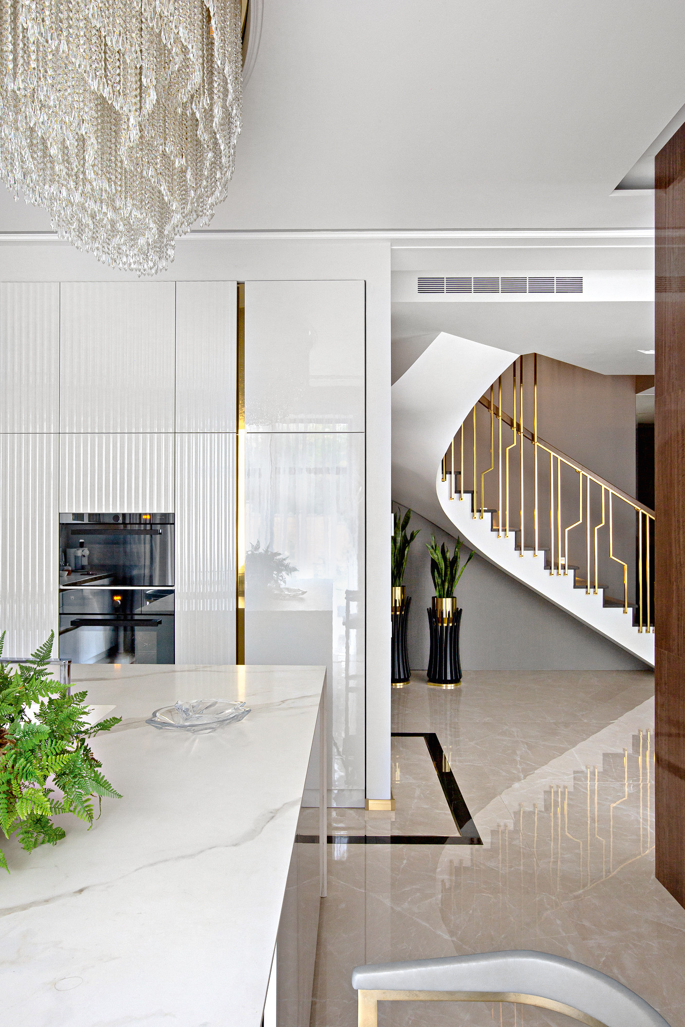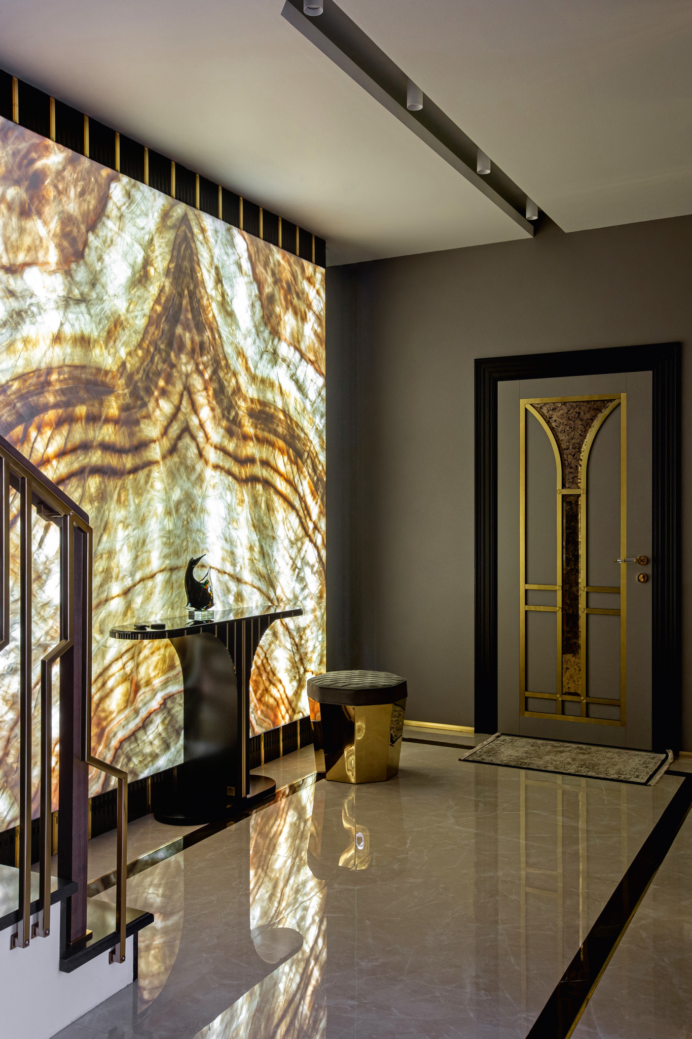 Предмет особой гордости дизайнеров—лестница, ограждение которой берёт начало… из люстры. Эта необычная концептуальная идея появилась не сразу, ей предшествовали долгие поиски и обсуждения. «Мы рады, что в жизнь воплотился именно этот вариант: люстра, «падающая дождём» на лестницу и являющаяся одним целым с ней. Реализовать замысел было непросто — над конструкцией работало несколько компаний–подрядчиков. Но получилось именно так, как было задумано», — комментирует Мария. В интерьере вообще много элементов, выполненных по индивидуальному проекту. Это не только мебель в спальне, гардеробной, ванной комнате и на кухне, но и двери, и хрустальные люстры, и отдельные декоративные элементы, такие как вставки из художественно обработанных стёкол, оттеняющие оникс, панели с покрытием soft–touch и др. «Эта работа — плод постоянных обсуждений с хозяйкой квартиры, которая в буквальном смысле заражала своей энергией, — добавляет Ксения. — Мы старались создать современный интерьер, вдохновлённый ар–деко, и, начав с более лаконичного образа, постепенно пришли к более роскошному: многие вещи стали ярче, выразительнее, появилось больше блеска, больше уникального, неповторимого шарма».