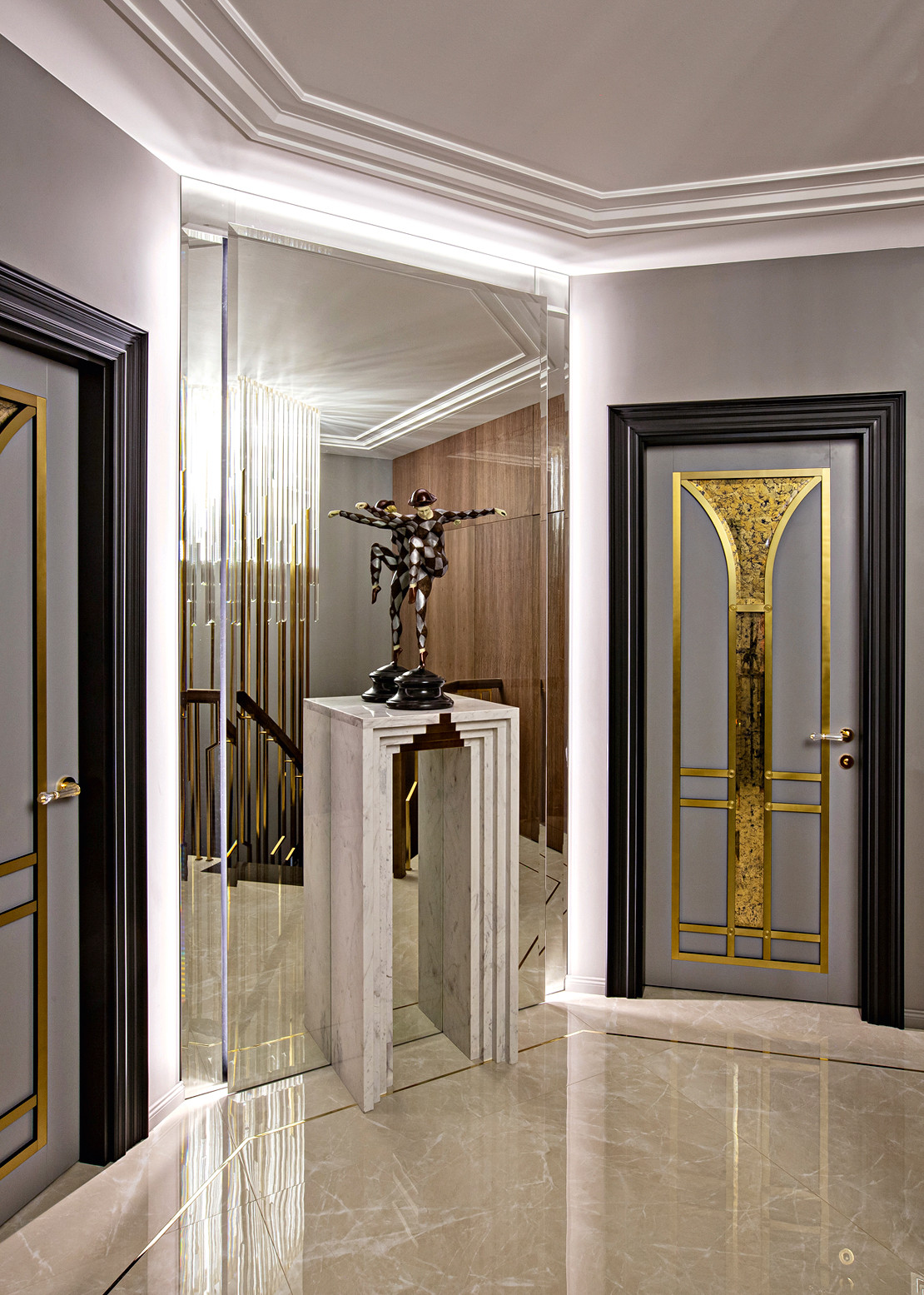 Ар–деко в интерьере этой петербургской квартиры появилось с подачи хозяйки — большой поклонницы стиля, которая обратилась в студию «Арт–Концепт» после того, как увидела интерьер, спроектированный Марией Танской и Ксенией Земрау в схожей стилистике. «Ар–деко сейчас находится на пи‑ ке популярности и не перестаёт быть актуальным благодаря большой вариативности и практически неограниченным возможностям для творчества, и работа в нём доставляет нам большую радость и удовольствие,—говорит Мария.—Конечно, это не значит, что нам не интересны другие интерьерные направления в дизайне. Но если заказчику близка роскошная и респектабельная стилистика, то именно ар–деко, как нам кажется, позволяет воплотить самые интересные и эффектные решения».