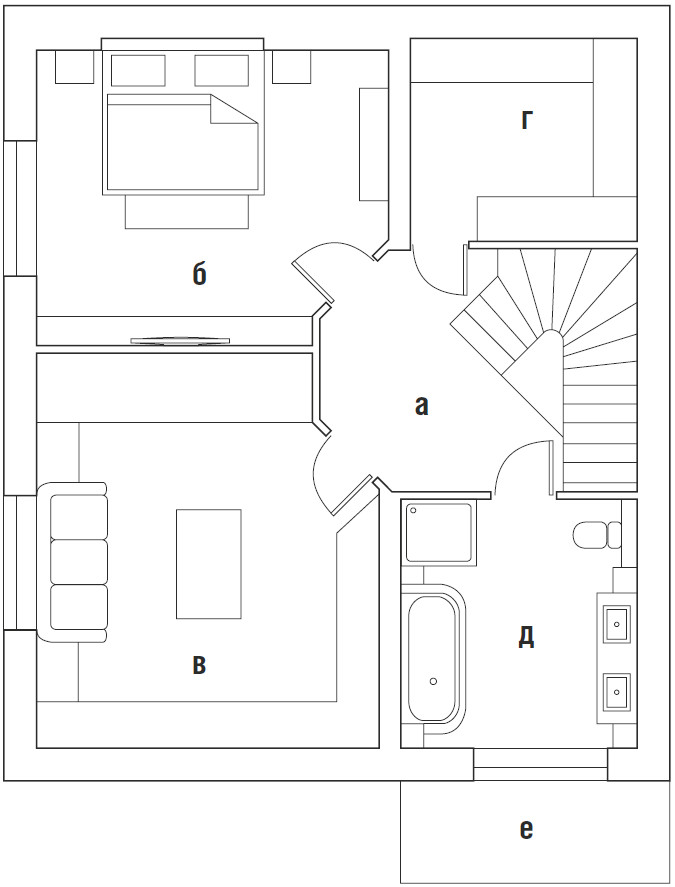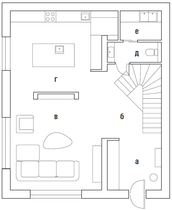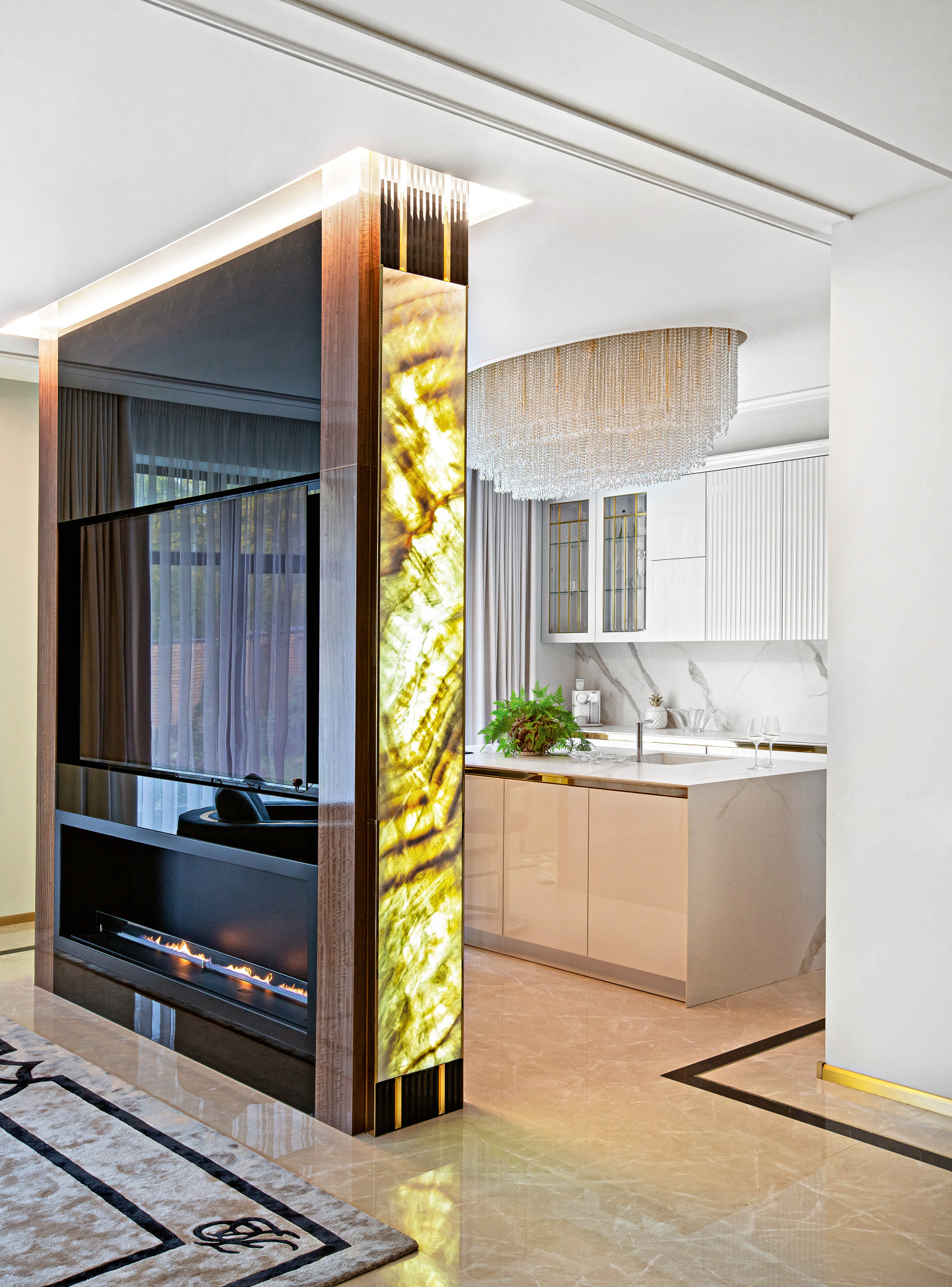 В функциональном плане запрос хозяев — супружеской пары — звучал так же чётко и ясно. Они хотели получить комфортное приватное пространство, максимально отвечающее их укладу жизни. Так, из перечня требуемых помещений исчезло, казалось бы, такое обязательное, как столовая: хозяева редко принимают гостей и обеденному столу предпочли барный остров. Точкой притяжения в гостиной стал исключительно комфортный диван, с первого взгляда привлекающий к себе внимание и собирающий вокруг себя пространство. Зоны кухни и гостиной разделены перегородкой, в неё интегрированы телевизионные панели с двух сторон, а также камин, который является не только декоративным акцентом, но и функциональным элементом — источником тепла и символом домашнего очага.